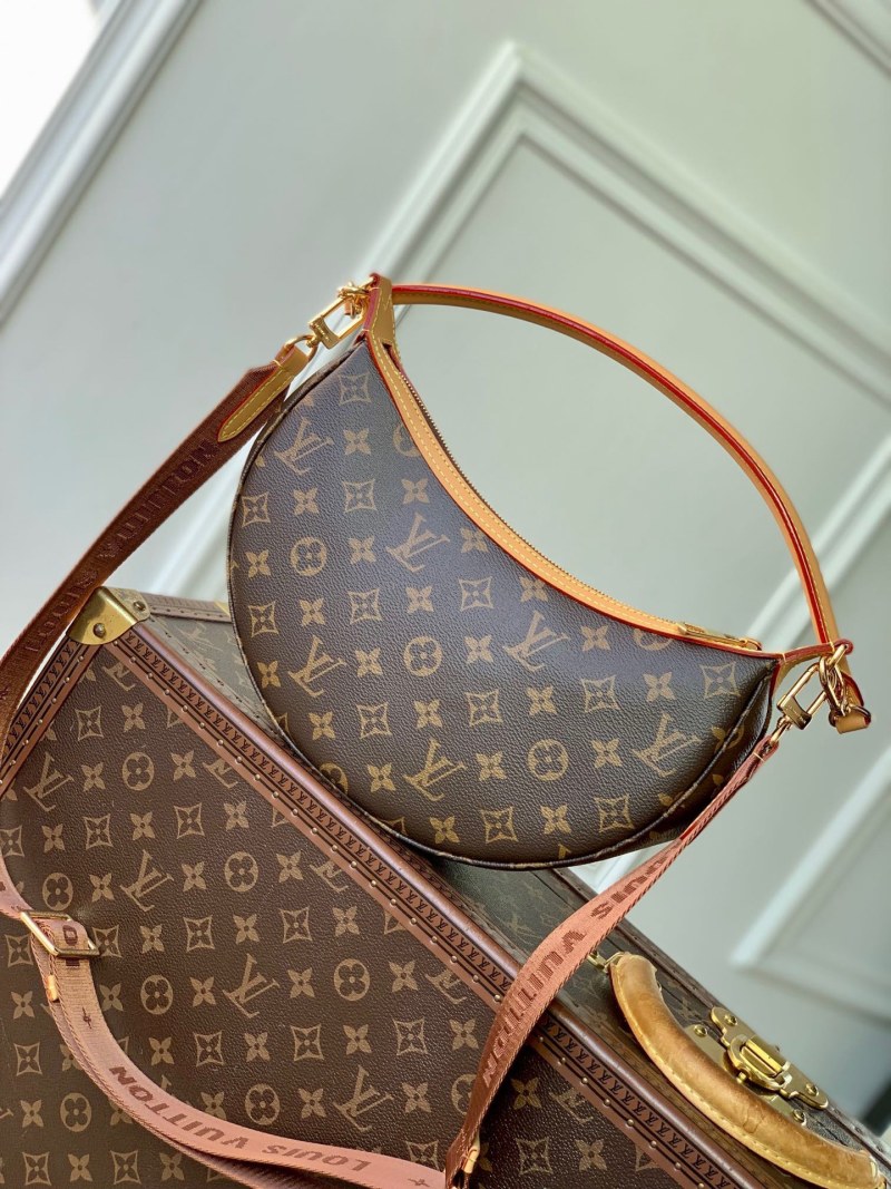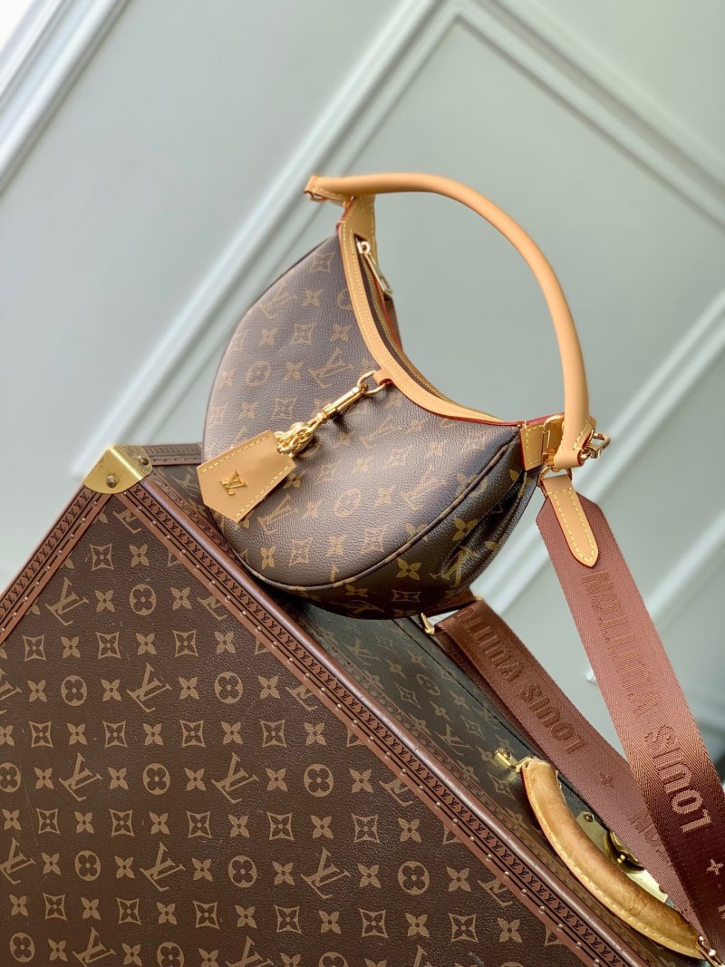 The m12939loop hobo bag features a stylish half-moon silhouette with leather trim, made with a combination of monogram coated canvas and monogram reverse coated canvas. It comes with detachable handles and an adjustable shoulder strap, offering versatile carrying options. Dimensions: 22 x 9 x 33 cm (height x width x length).