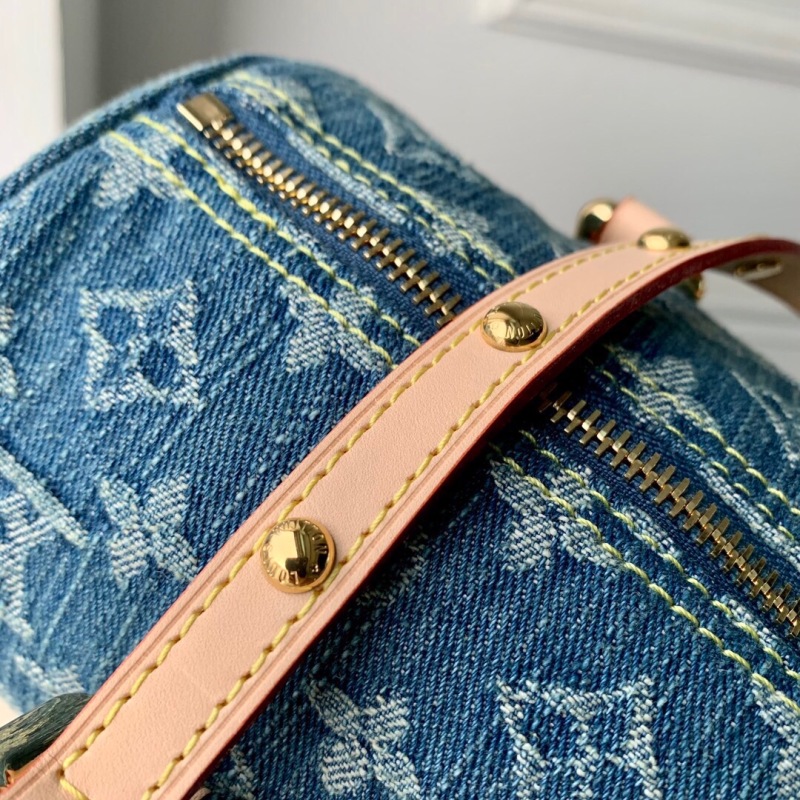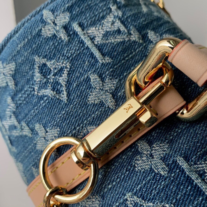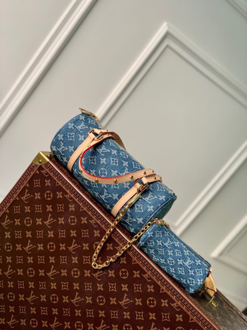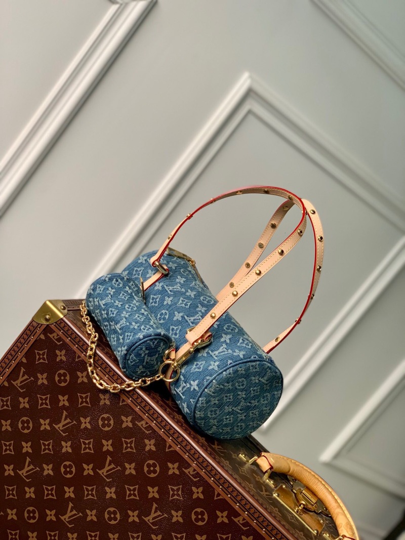 The top original M46830 Papillon handbag is crafted from multiple techniques using monogram denim canvas, creating a mini version of the same handbag. The monogram pattern is woven with cotton yarn and then bleached, giving the finished product a unique sand wash treatment for a chic look. Measuring 27.0 x 11.0 x 13.0 cm (length x height x width).