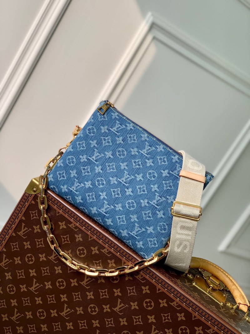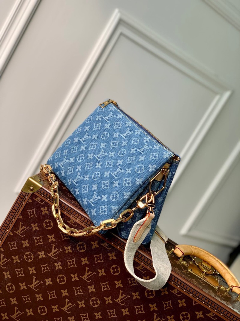 The top original single M24564 Coussin small handbag features a fresh and elegant style with a new season cotton denim. The unique bleaching and sand washing process create a distinctive appearance. It comes with a removable embossed thick chain strap and a wide fabric shoulder strap, enhancing the lightweight carrying experience. Made with certified cotton, leather lining, metal fittings, and a zipper closure. The shoulder strap is removable and adjustable, and the bag measures 26x20x12cm.
