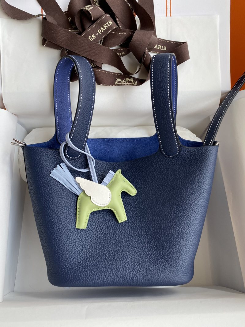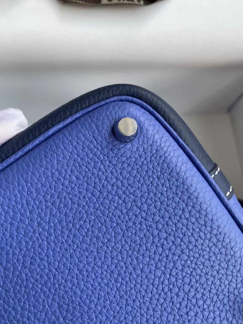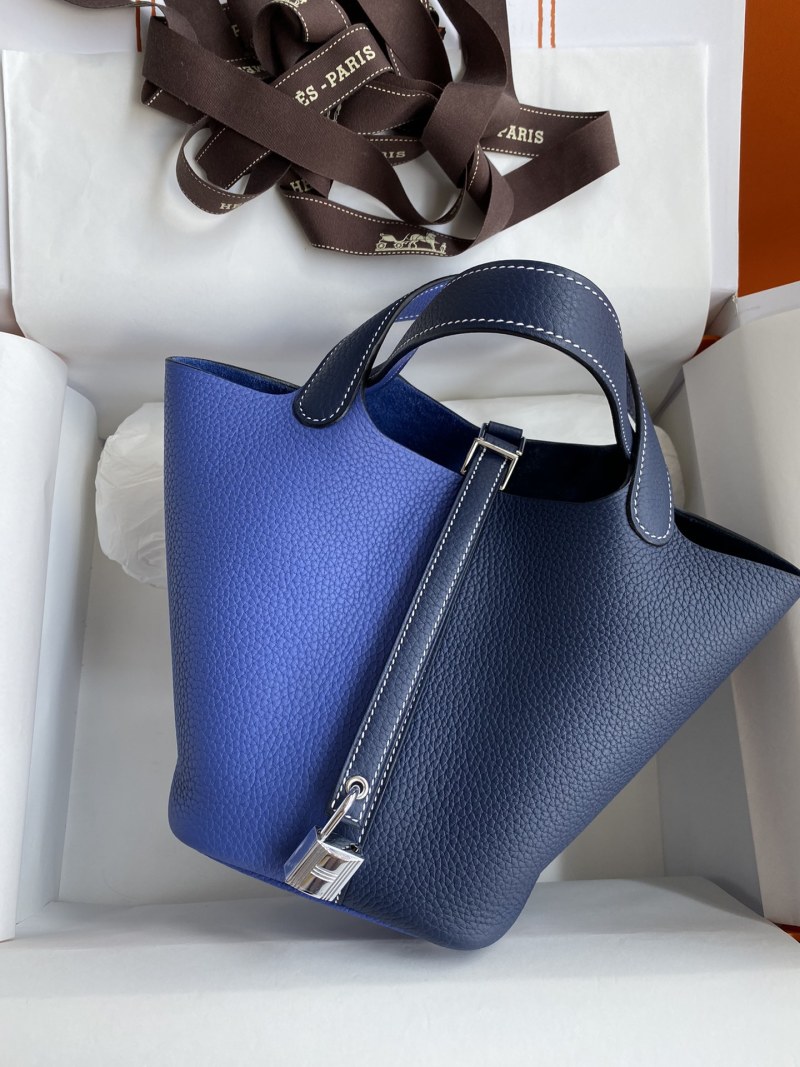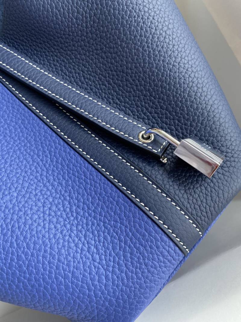 In stock: Handmade 👉 Picotin...18cm Basket Bag in Imported Taurillon Clemence Leather Light Blue with Sapphire Blue Accents and Silver Clasp