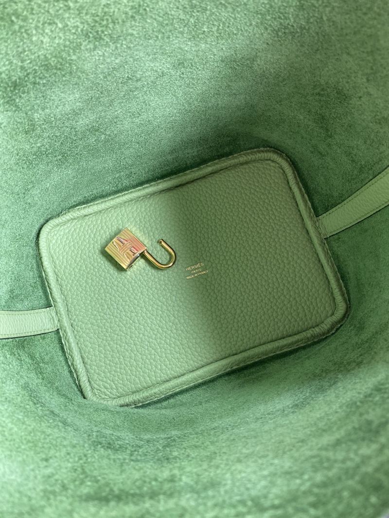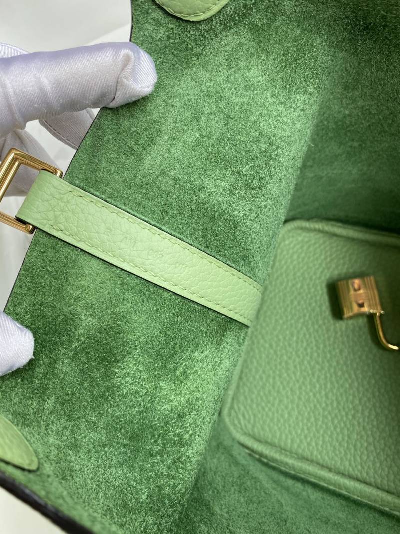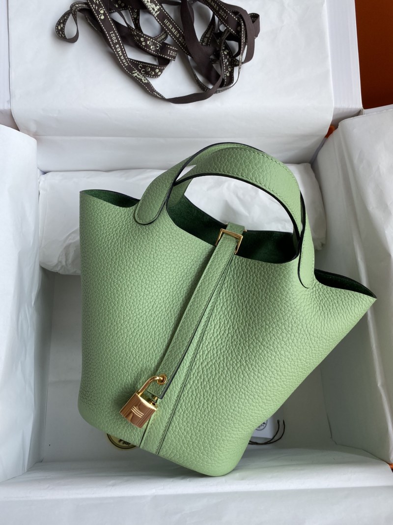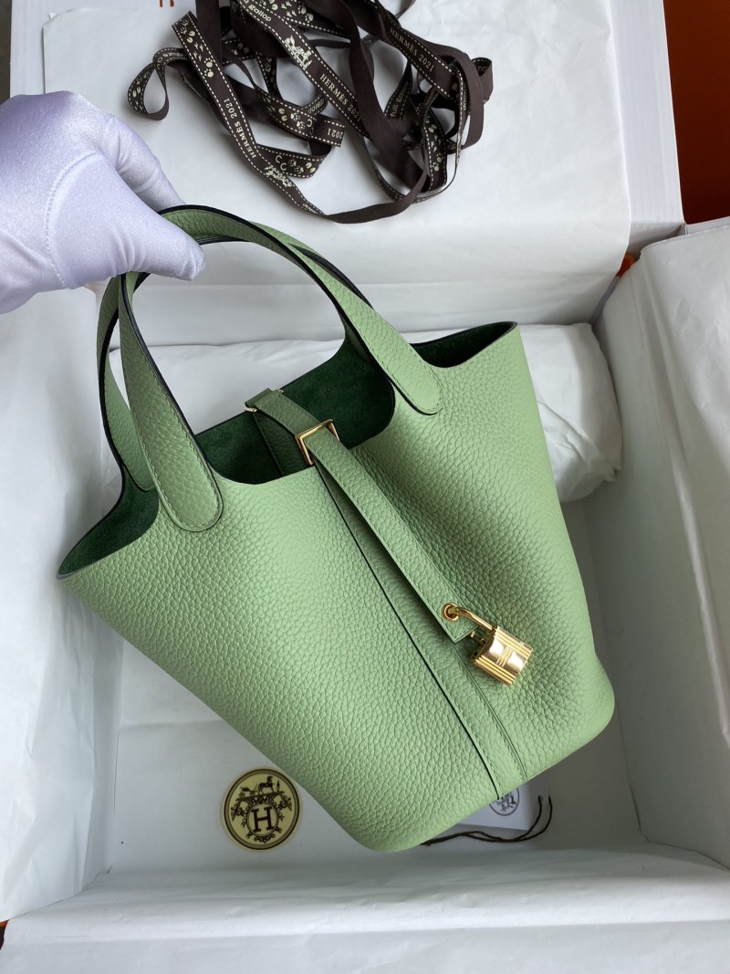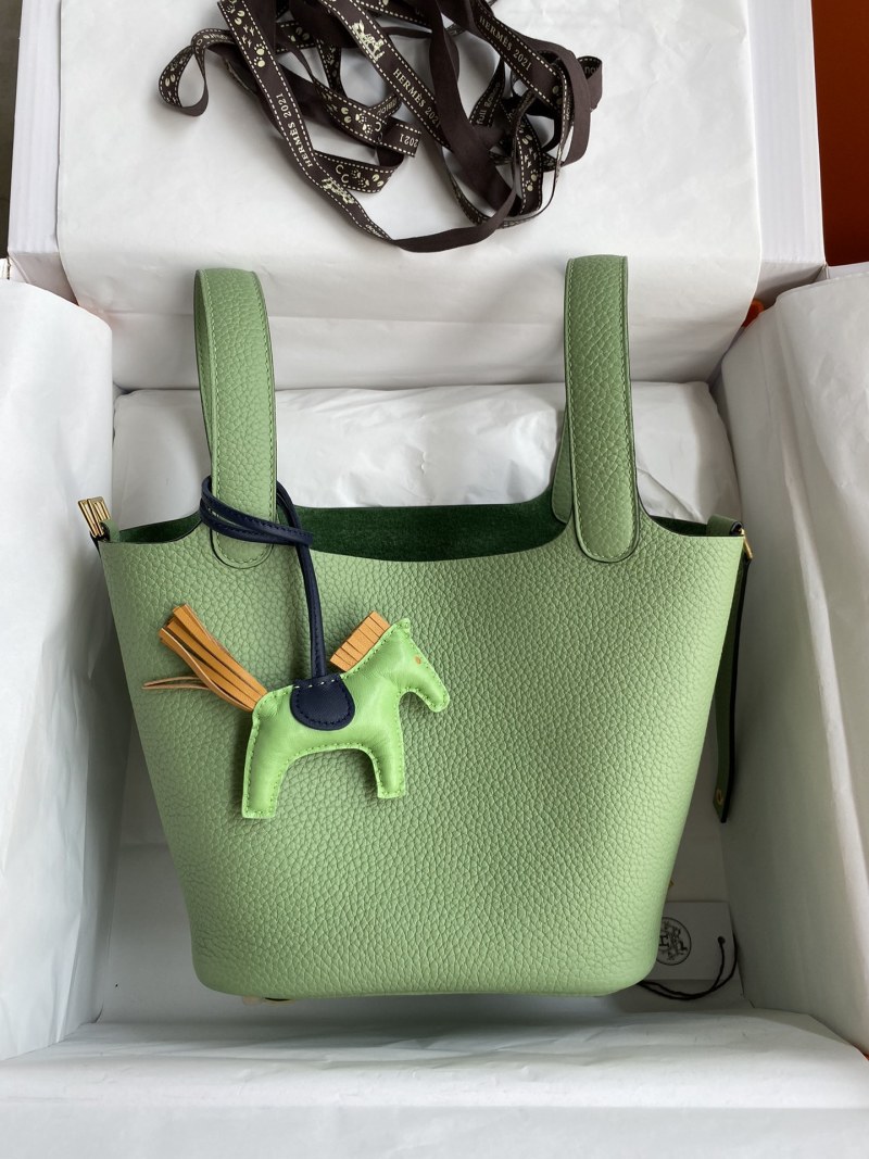 This 18cm Picotin Basket Bag is now available in stock in a stunning avocado green color, made with imported Taurillon Clemence leather and finished with a stylish gold buckle. Handcrafted with care, this bag is the perfect accessory for adding a pop of color and luxury to your outfit.