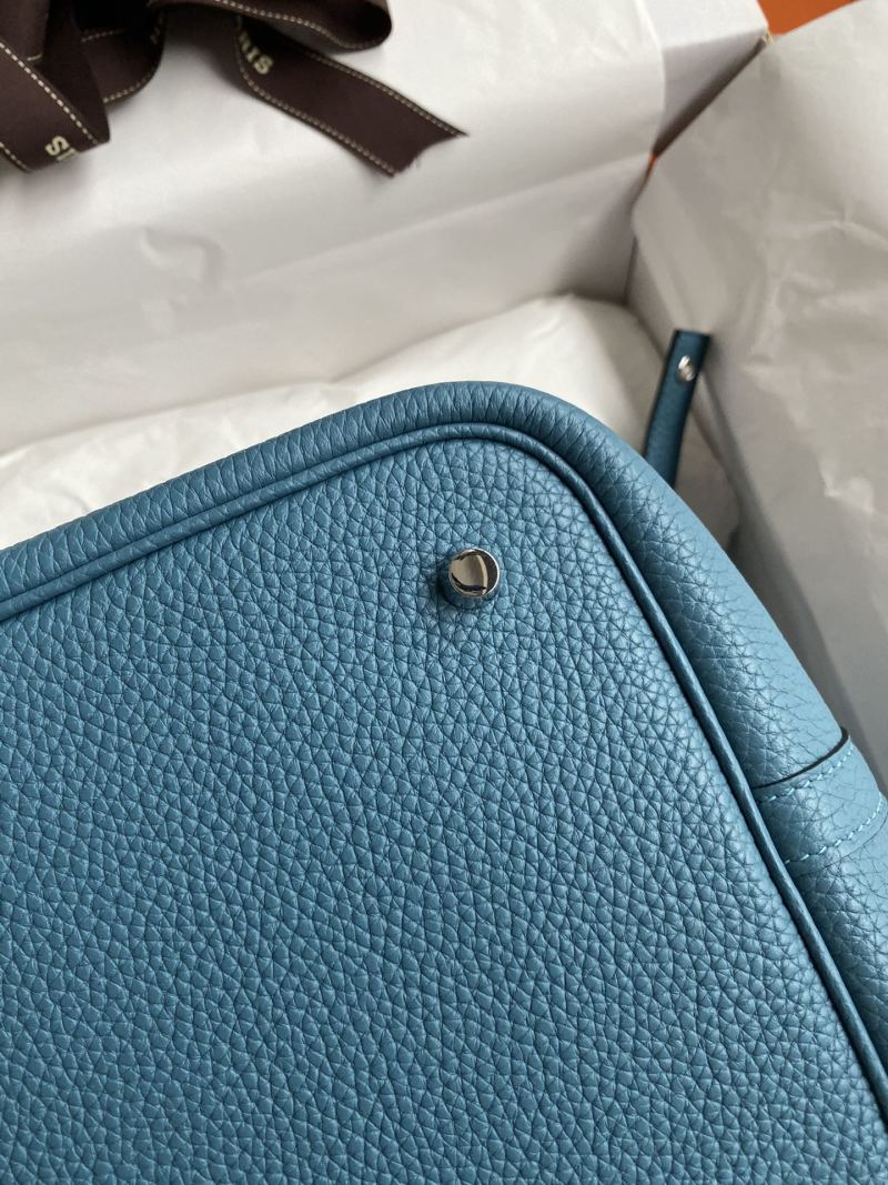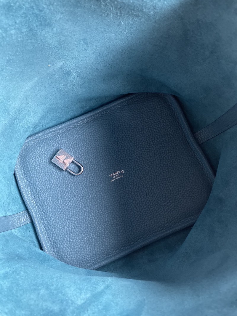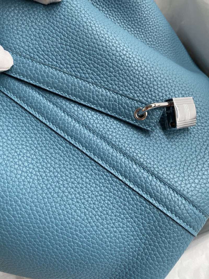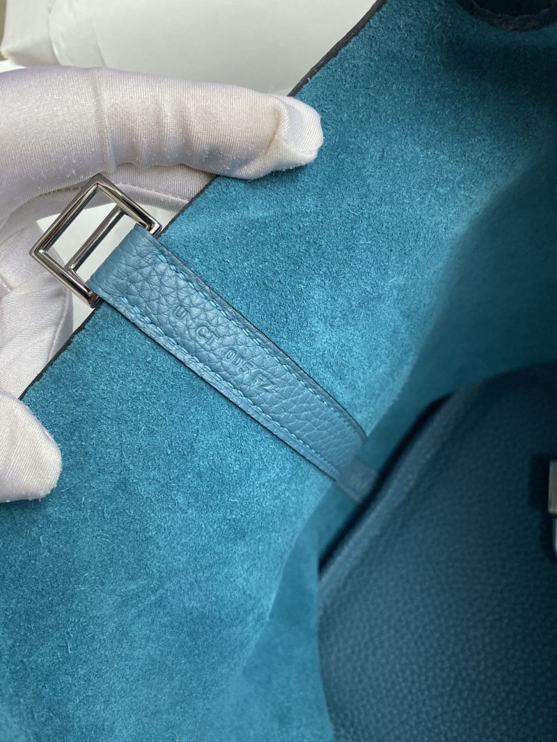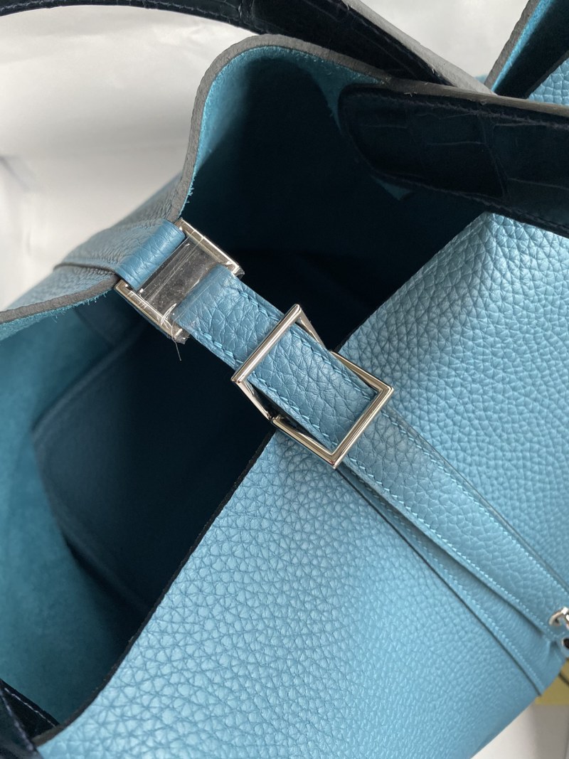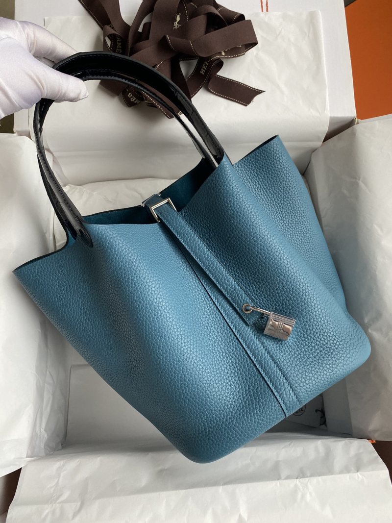 This handmade Picotin bag is crafted from imported Taurillon Clemence leather with a unique crocodile pattern. Featuring a stylish denim blue and midnight blue color combination, this bag is accessorized with a silver buckle for added elegance. Perfect for carrying essentials in style, this 22cm Picotin bag is a must-have accessory for any fashion enthusiast.