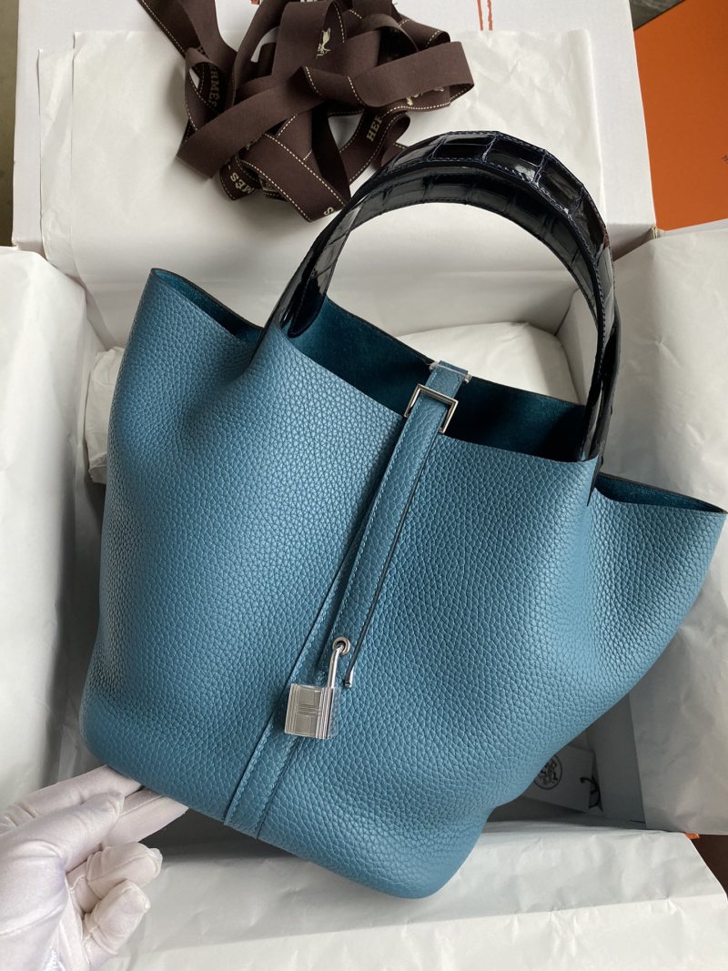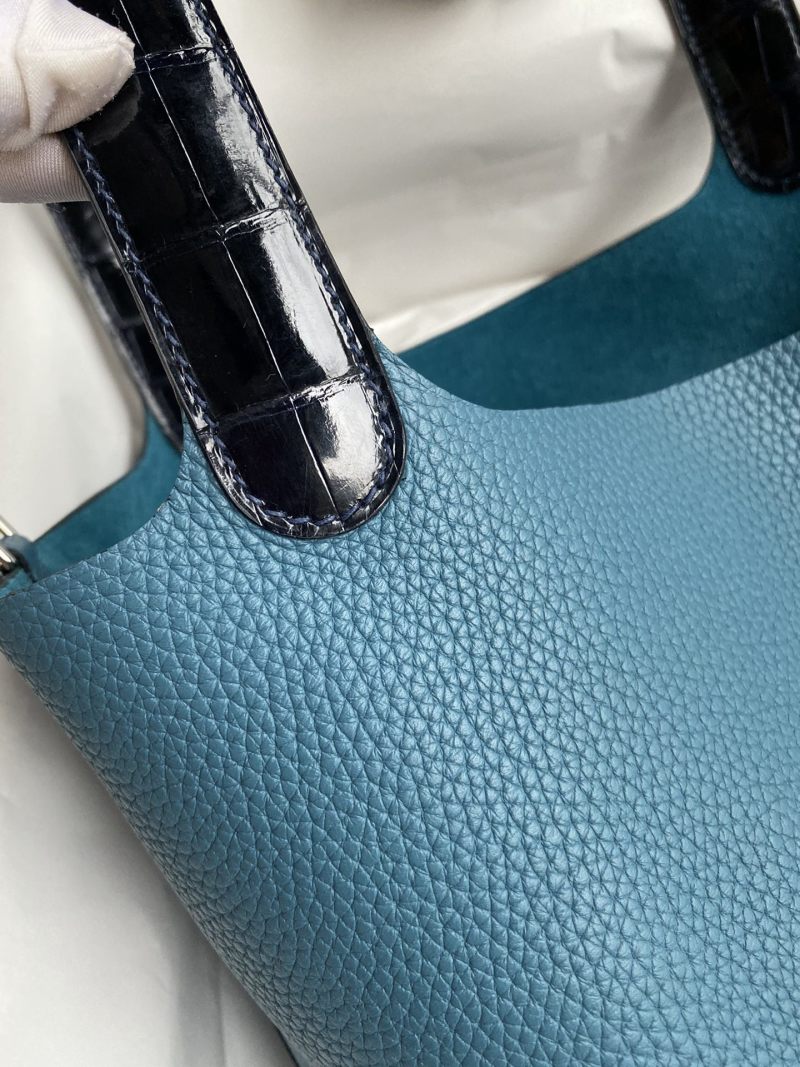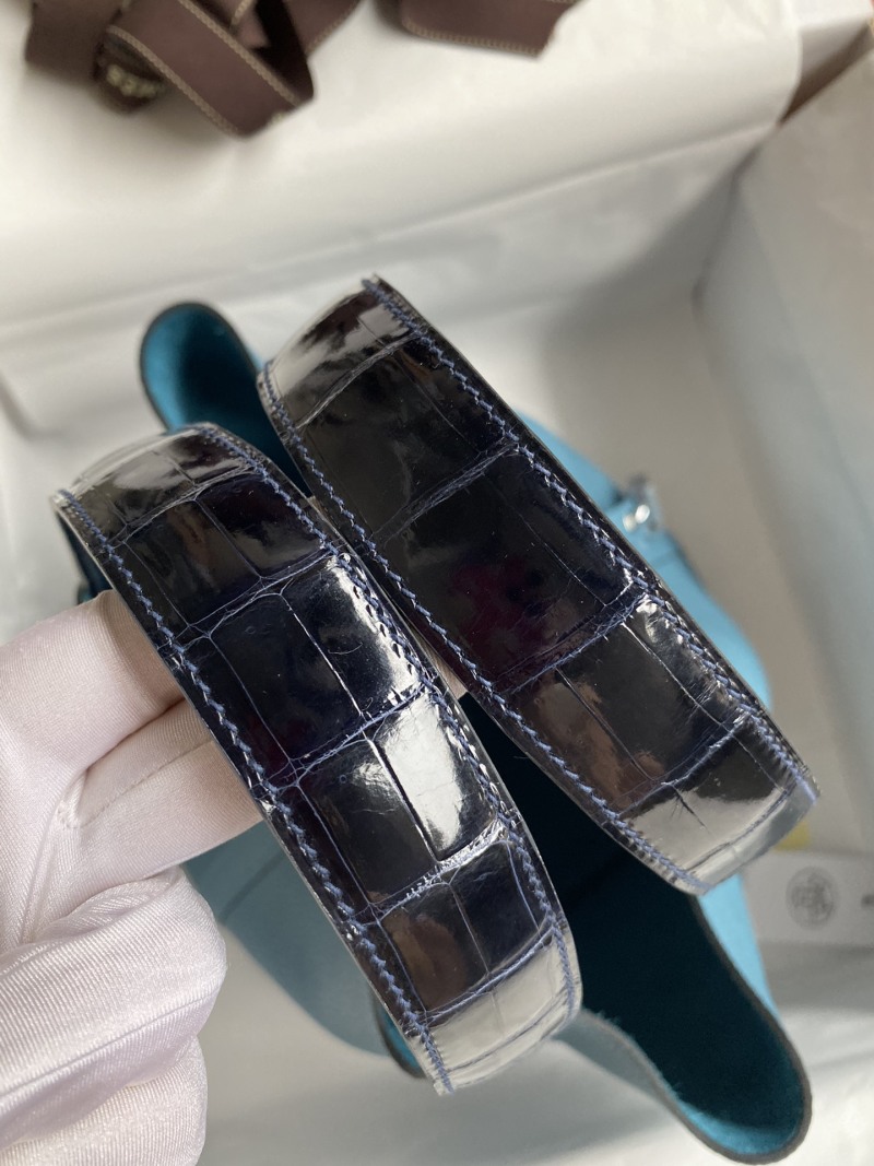 Handmade Picotin...22cm Taurillon Clemence Leather Crocodile Pattern Wrist Basket Imported in Denim Blue/Midnight Blue with Silver Buckle
