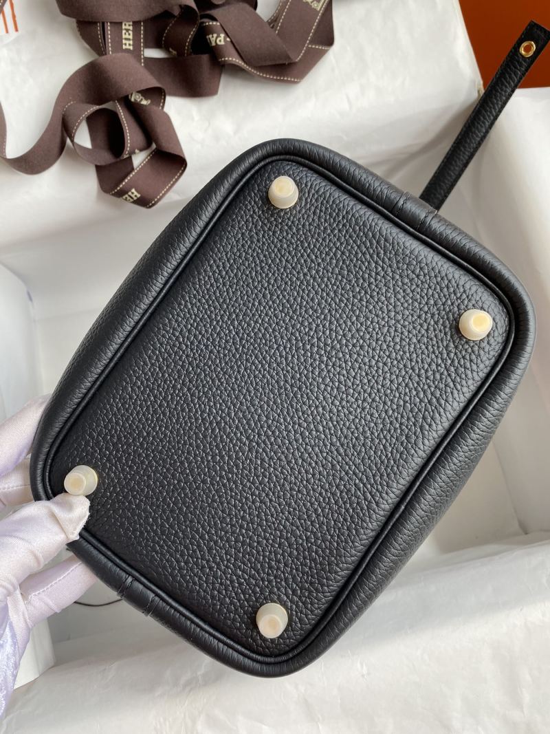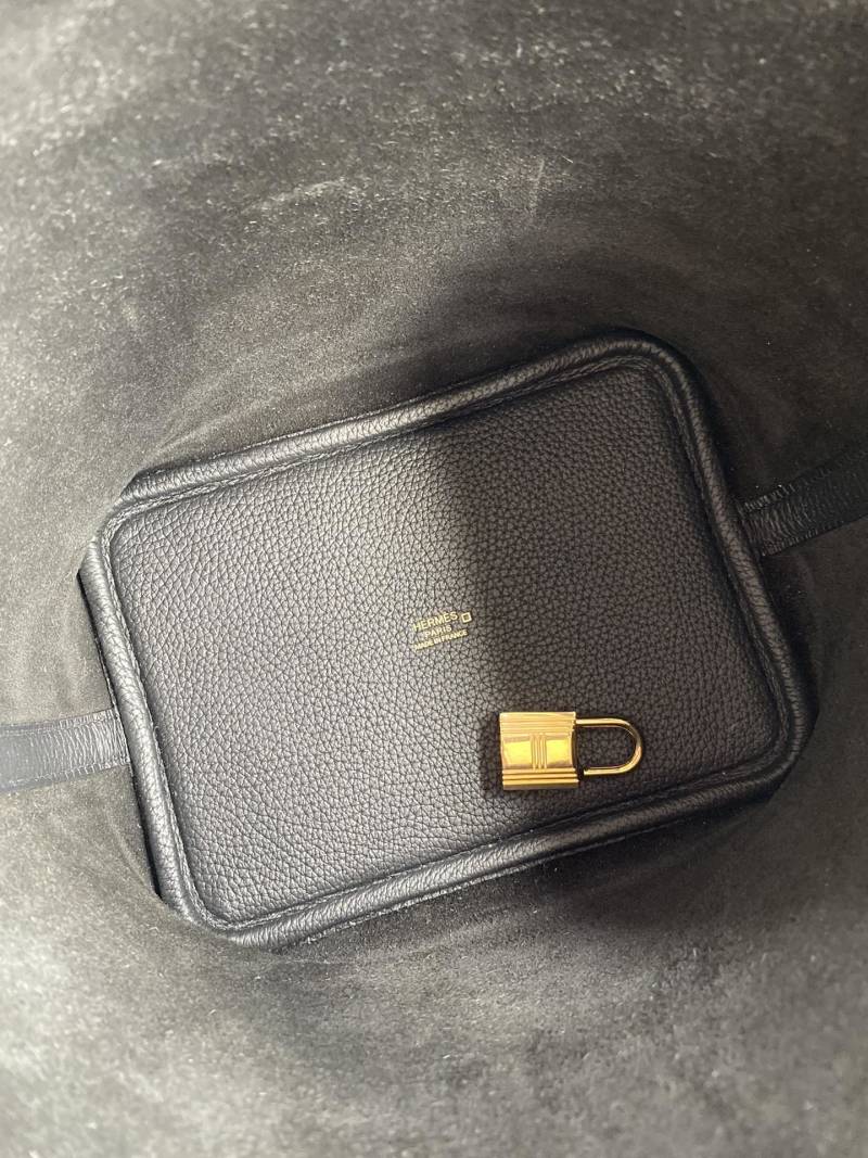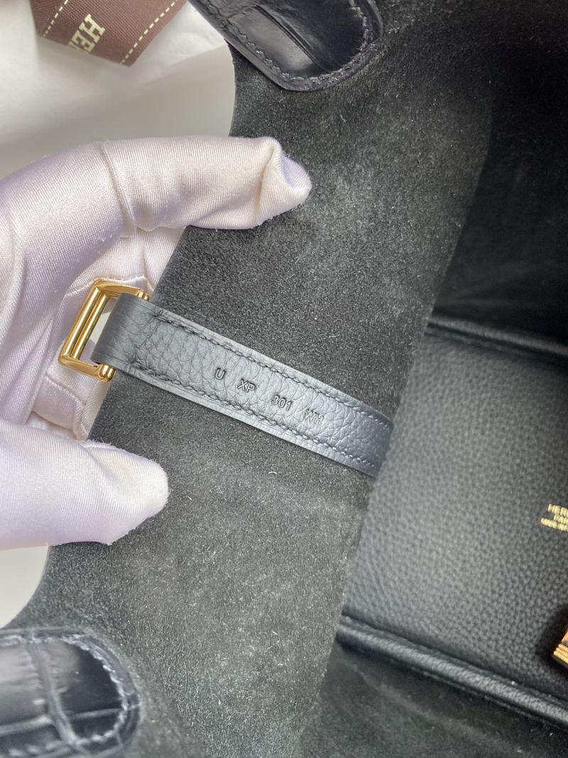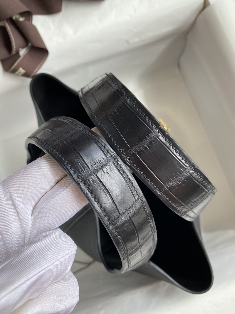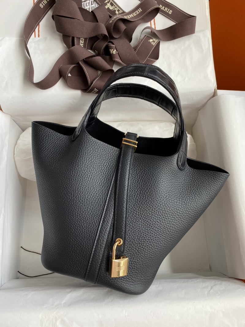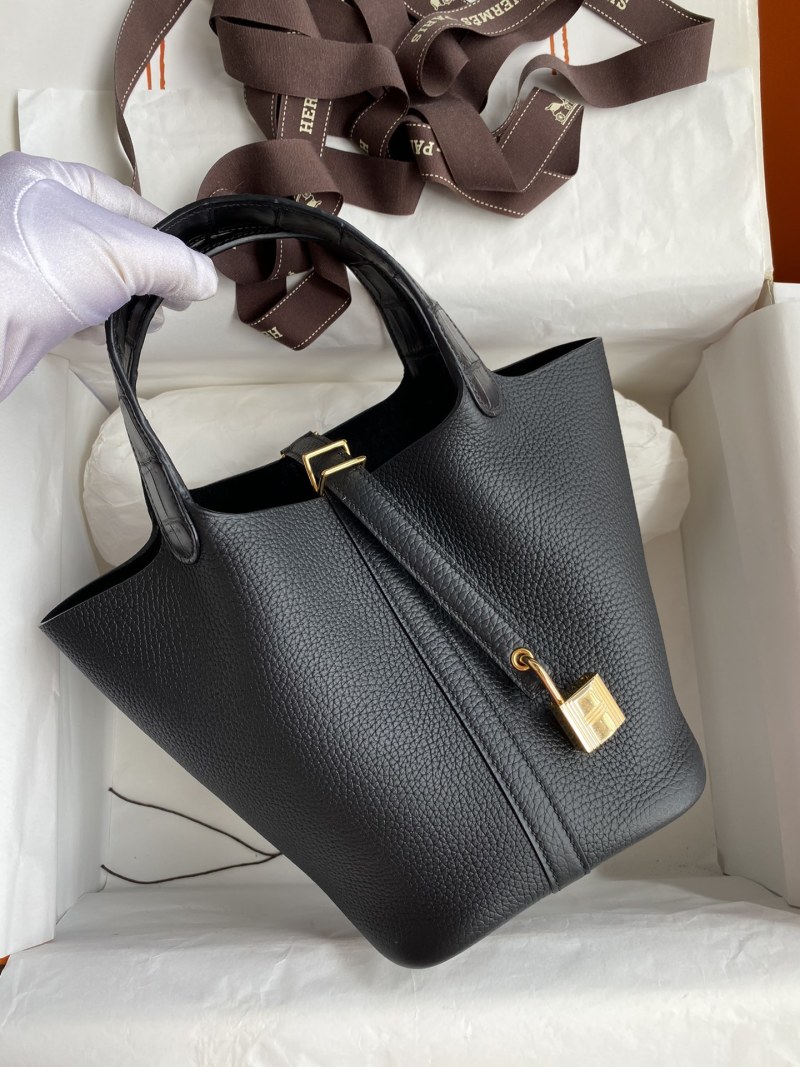 Handcrafted Picotin...18cm Basket Tote Imported Taurillon Clemence Leather with Crocodile Trim Wrist Strap in Black with Gold Buckle