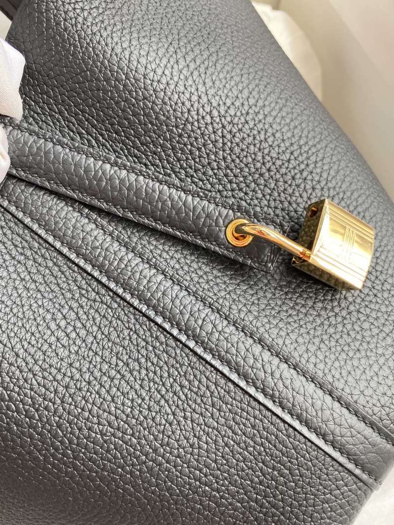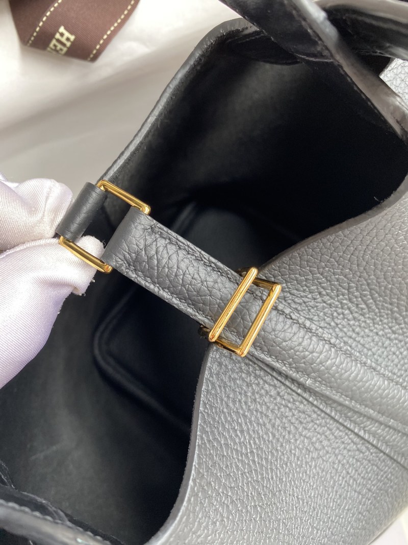 This handcrafted Picotin basket tote is made with imported Taurillon Clemence leather and features a stylish crocodile trim wrist strap in black with a gold buckle. Perfect for adding a touch of luxury to your everyday ensemble.