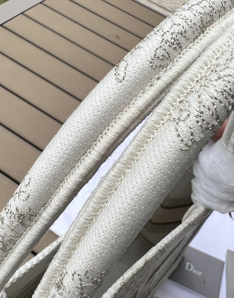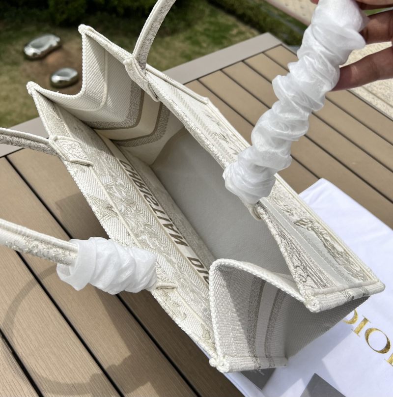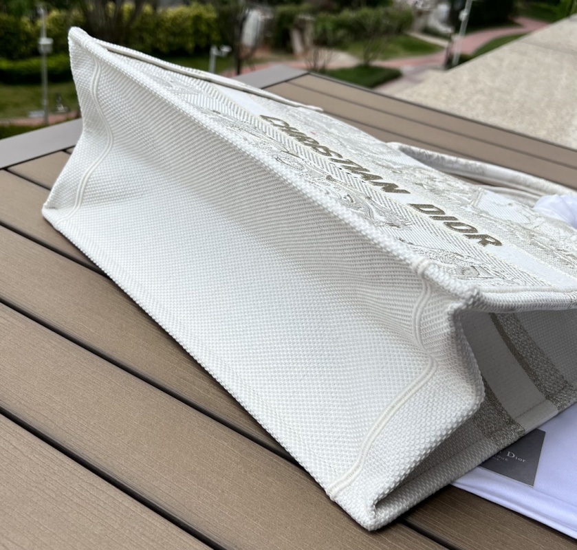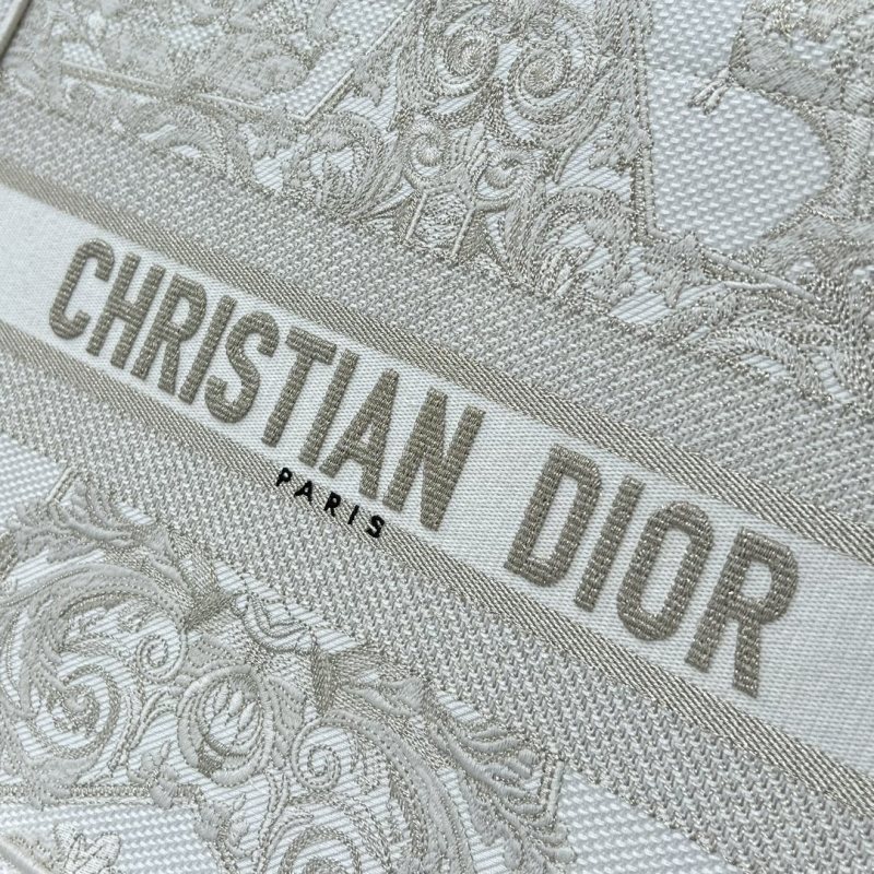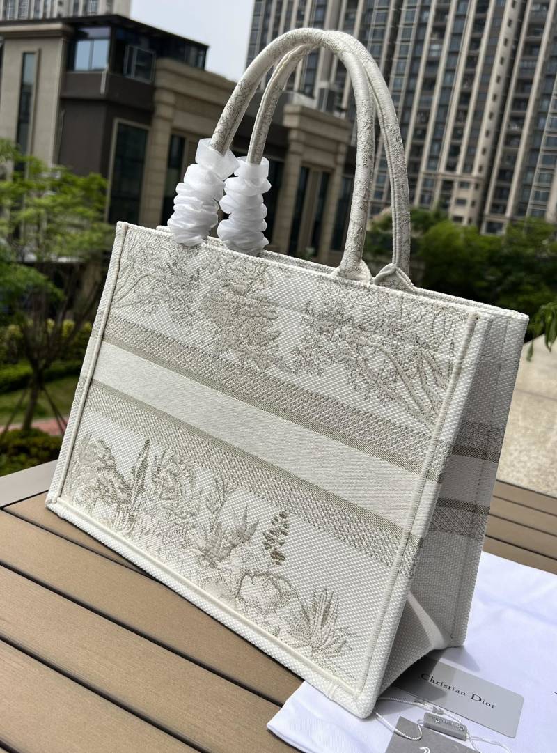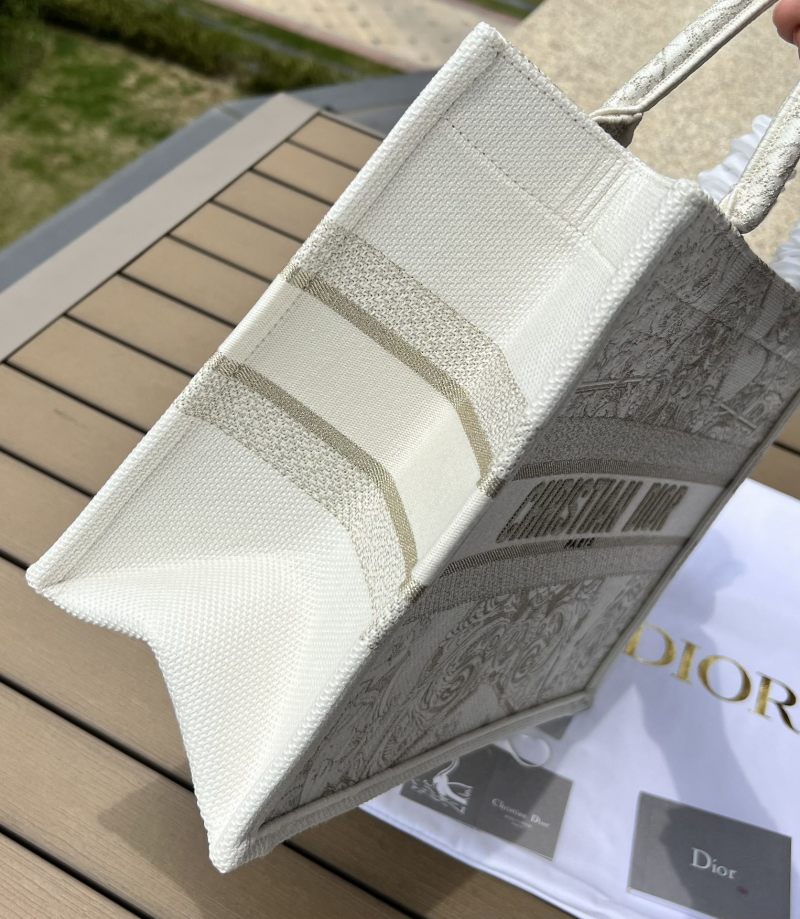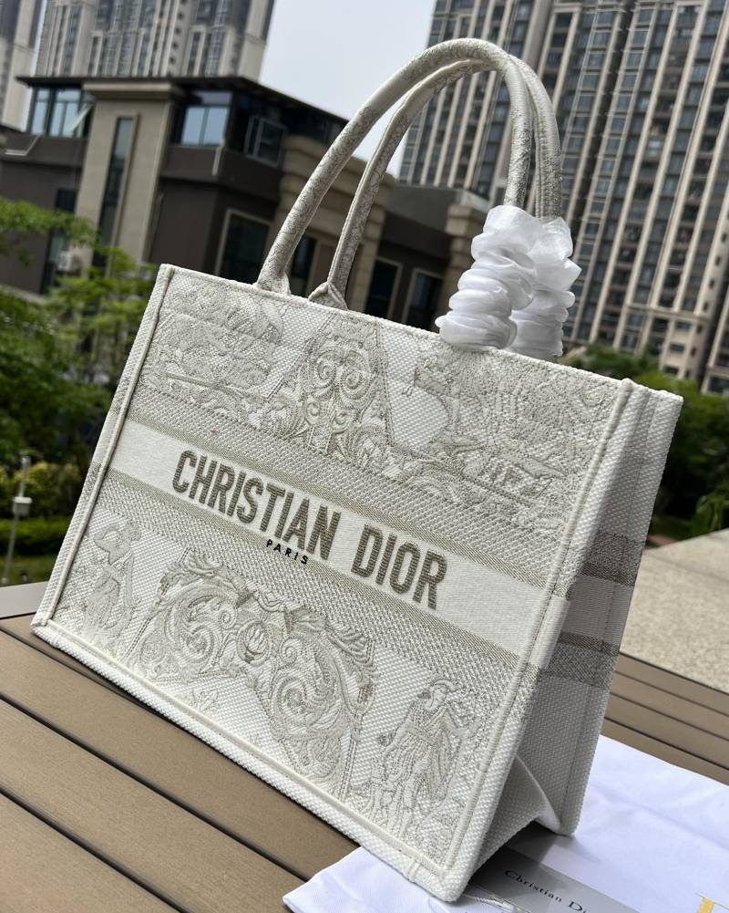 The DIOR Medium Book Tote Bag is inspired by the creative director Maria Grazia Chiuri, embodying the aesthetic of Dior. Designed for carrying everyday essentials, this medium tote bag features all-over embroidery with the "Christian Dior" logo on the front. Exemplifying Dior's exquisite craftsmanship, this tote bag can be paired with other accessories or Mitzah scarves for a cohesive and stylish look. Medium size: 36.5×28×17.5cm (871180898)
