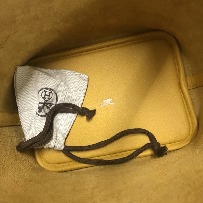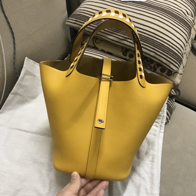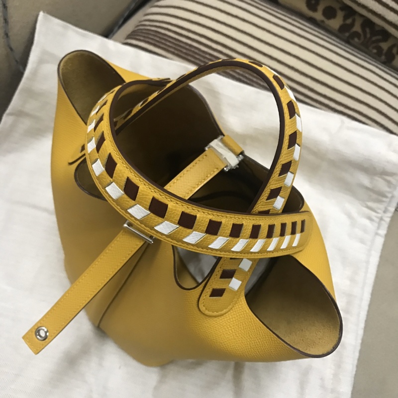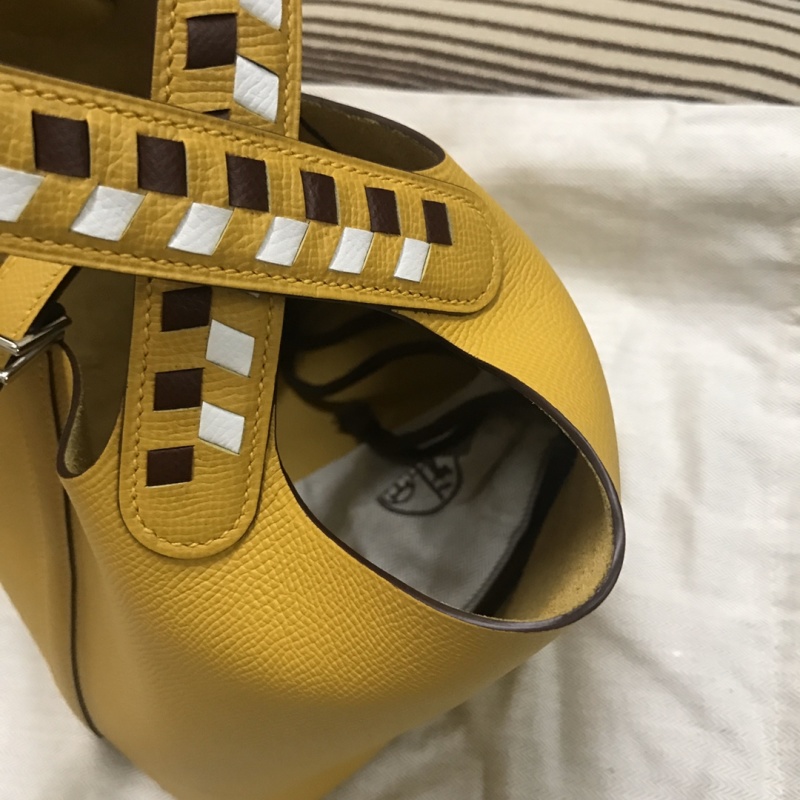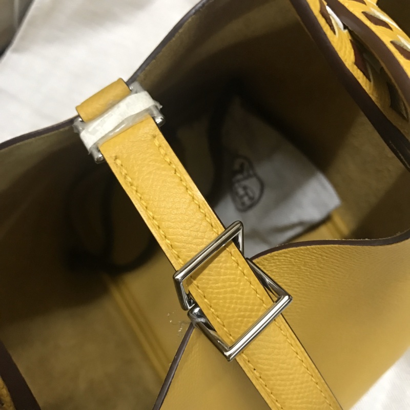 This handcrafted Picotin basket is made from high-quality imported Epsom leather in a vibrant amber yellow color. The intricate woven wrist design adds a unique touch, while the silver buckle closure ensures secure storage for all your essentials. A stylish and functional accessory for any occasion.