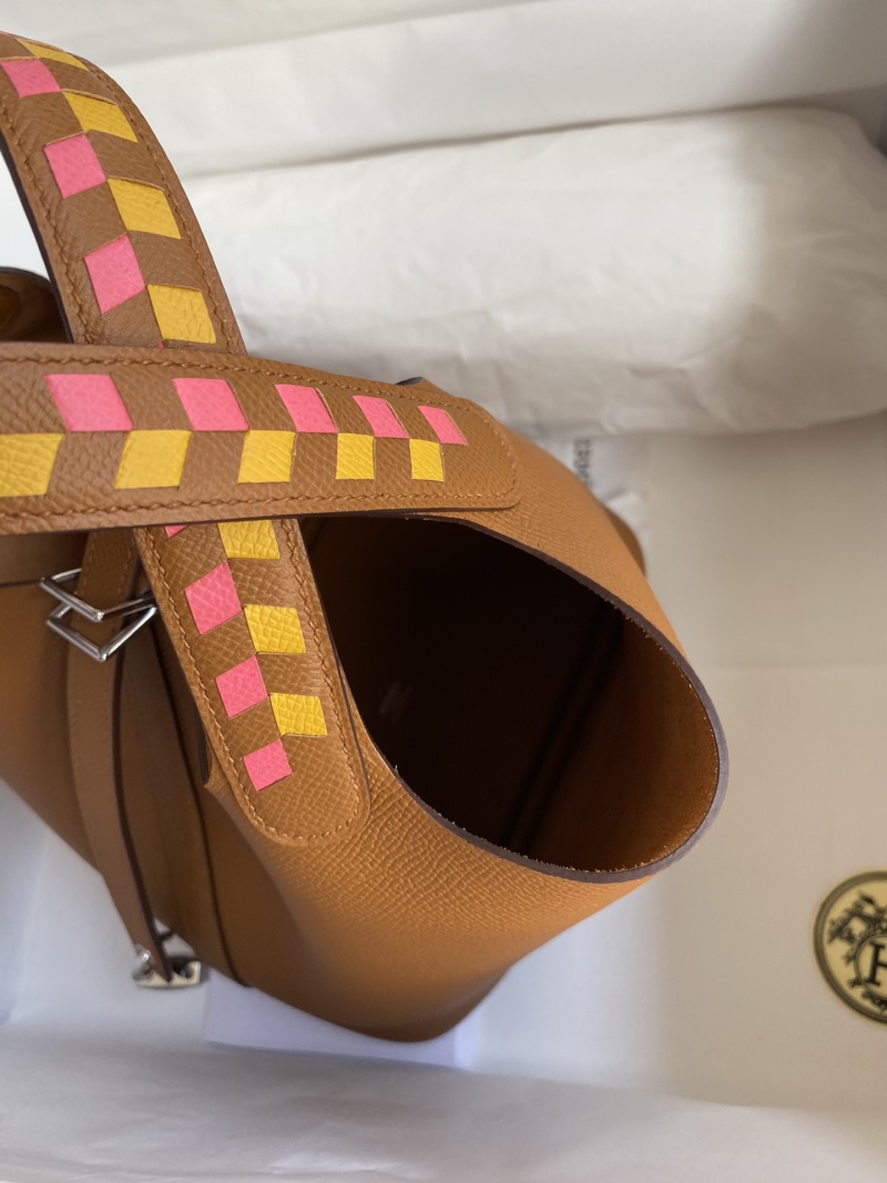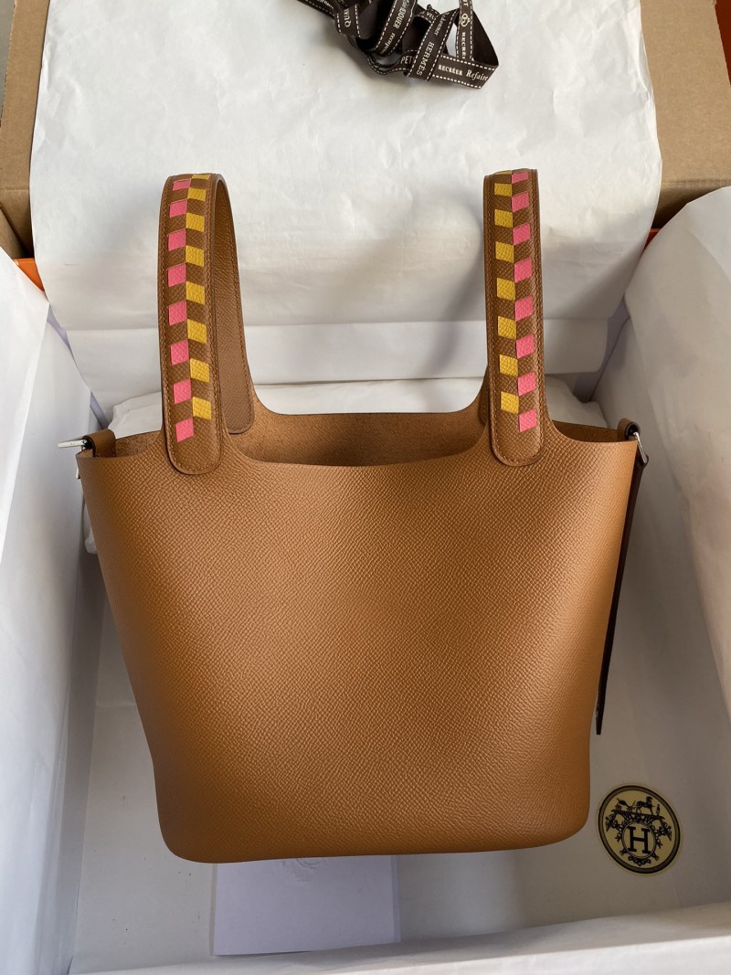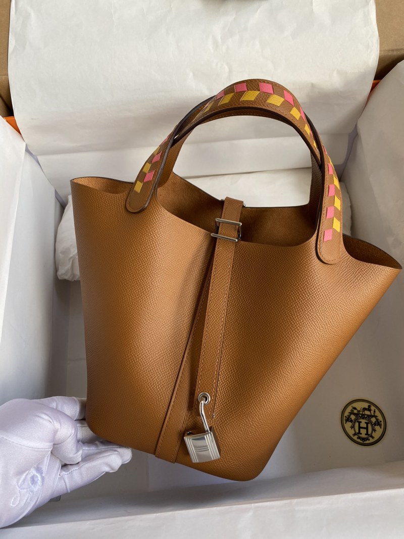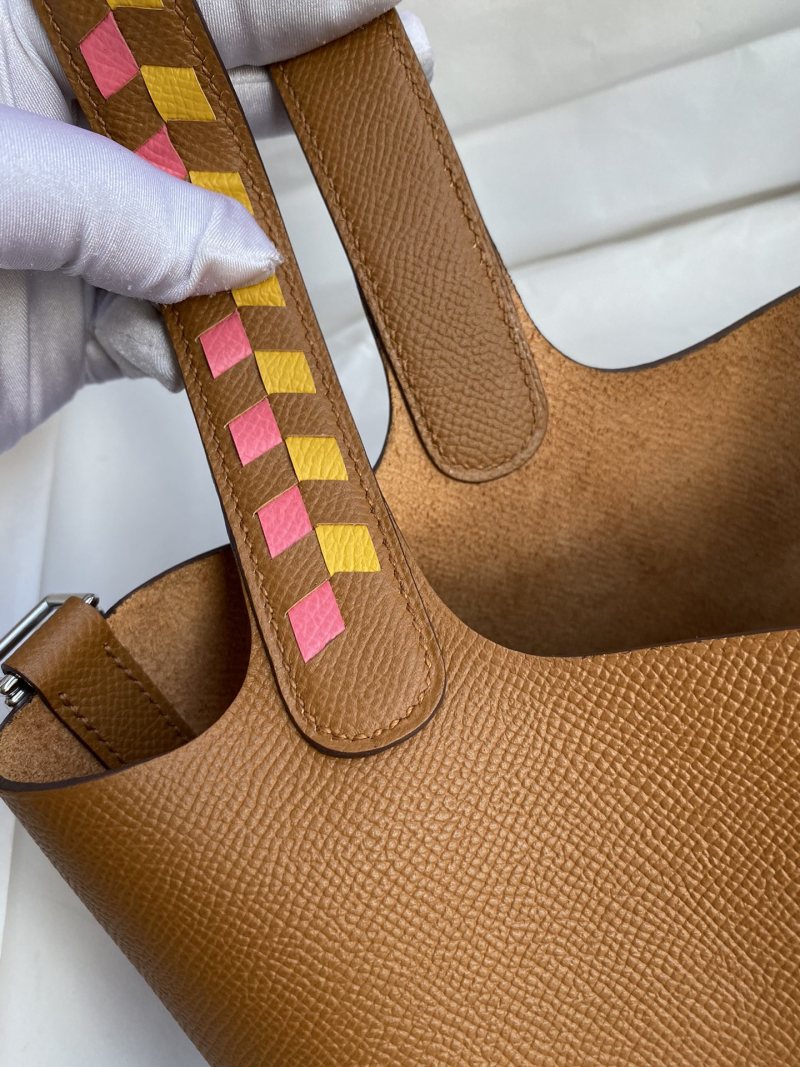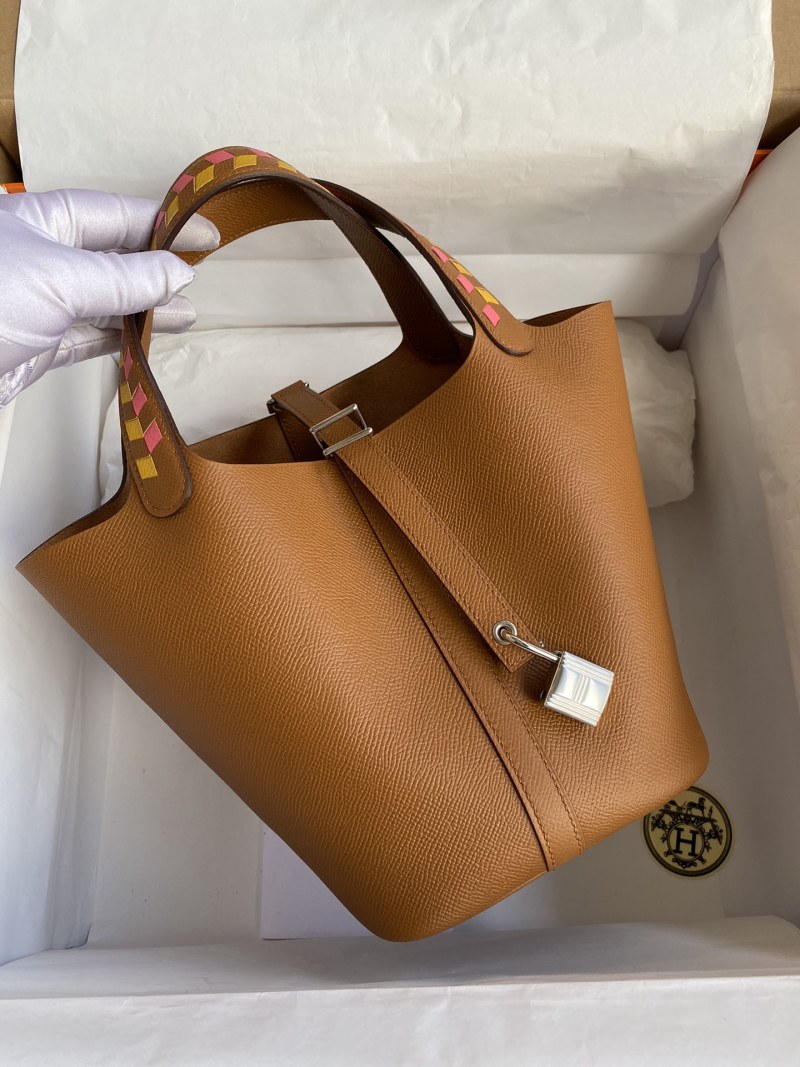 Elevate your style with this handcrafted Picotin basket bag, featuring intricate woven wrist detailing and made with high-quality imported Epsom leather in a stunning gold and silver clasp design. Perfect for adding a touch of luxury to any outfit.