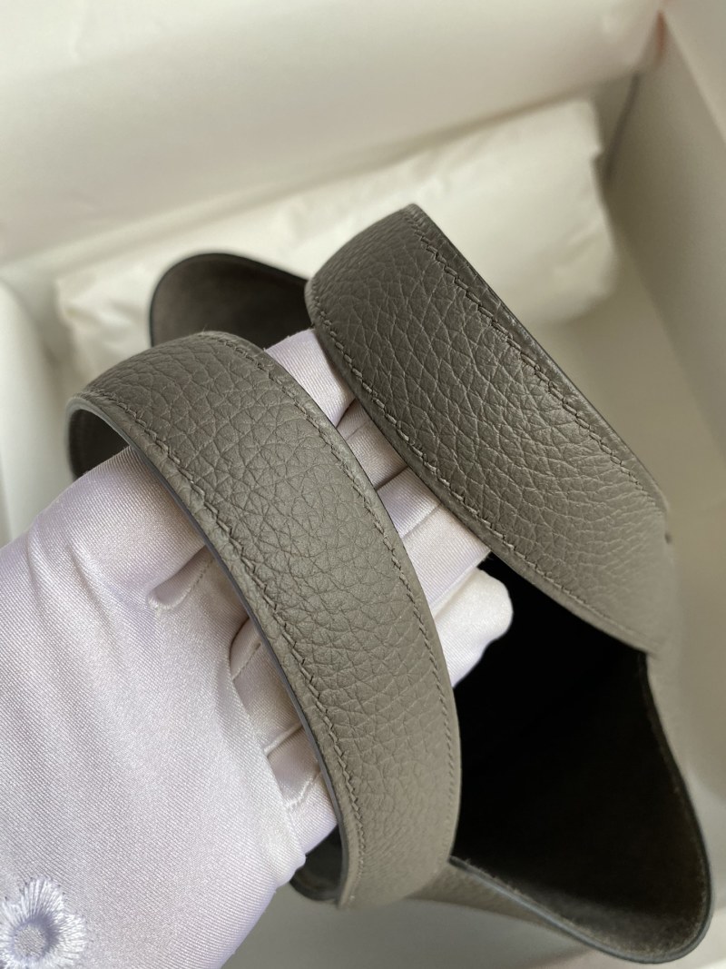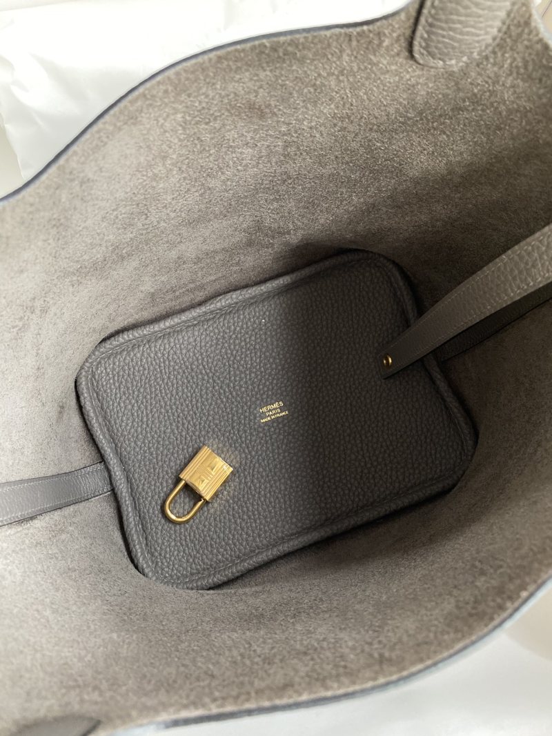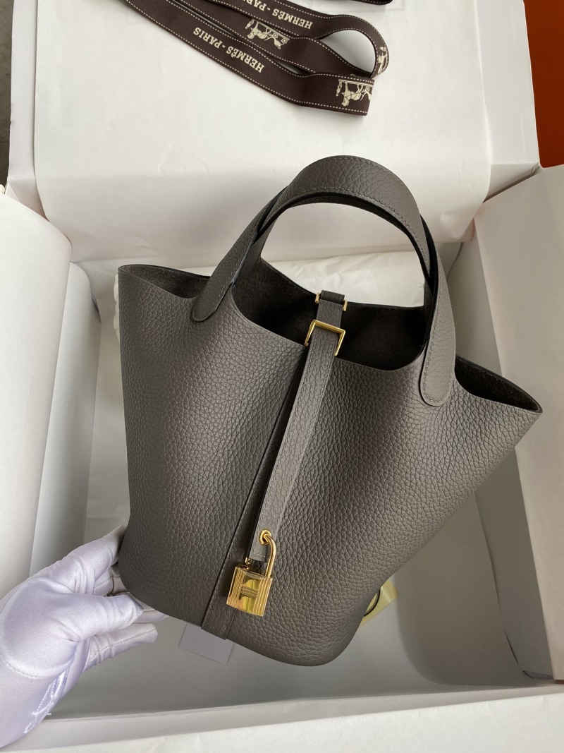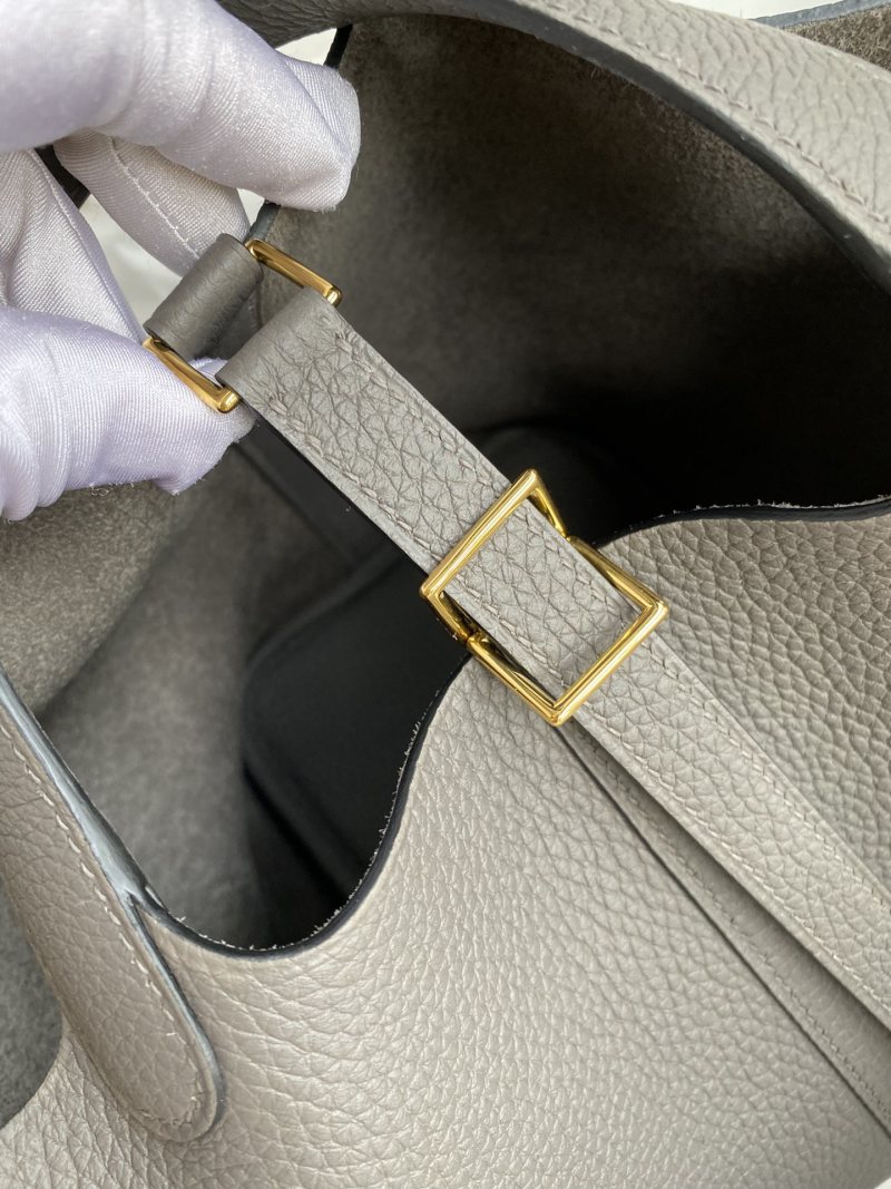 Handmade Picotin 18cm Basket Imported Taurillon Clemence Leather in Etain with Gold Buckle