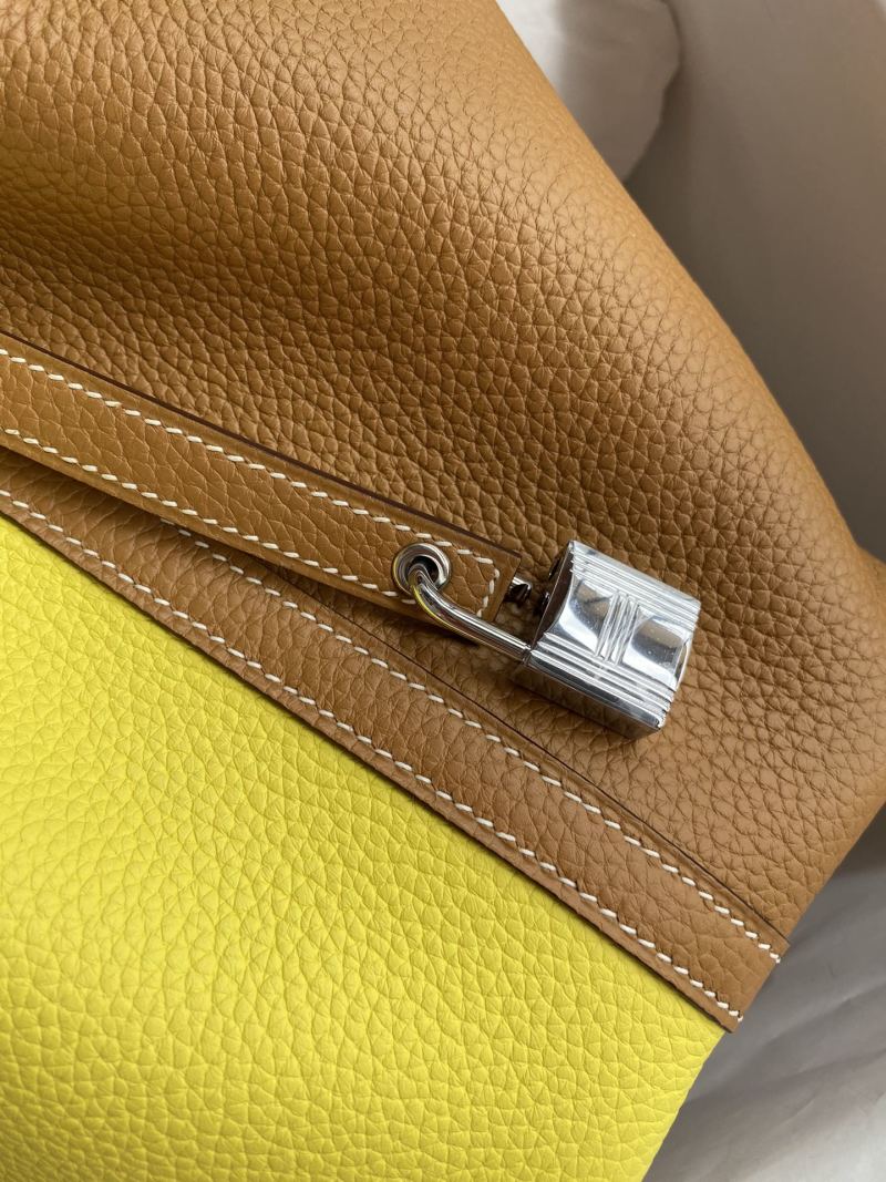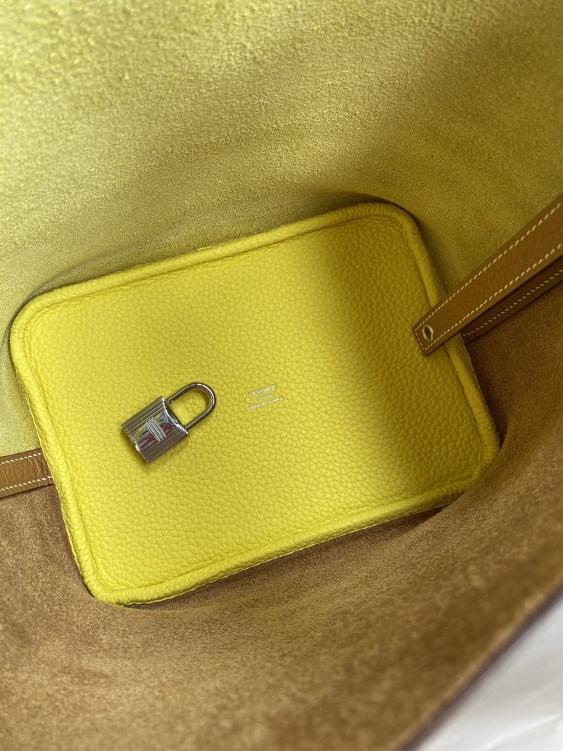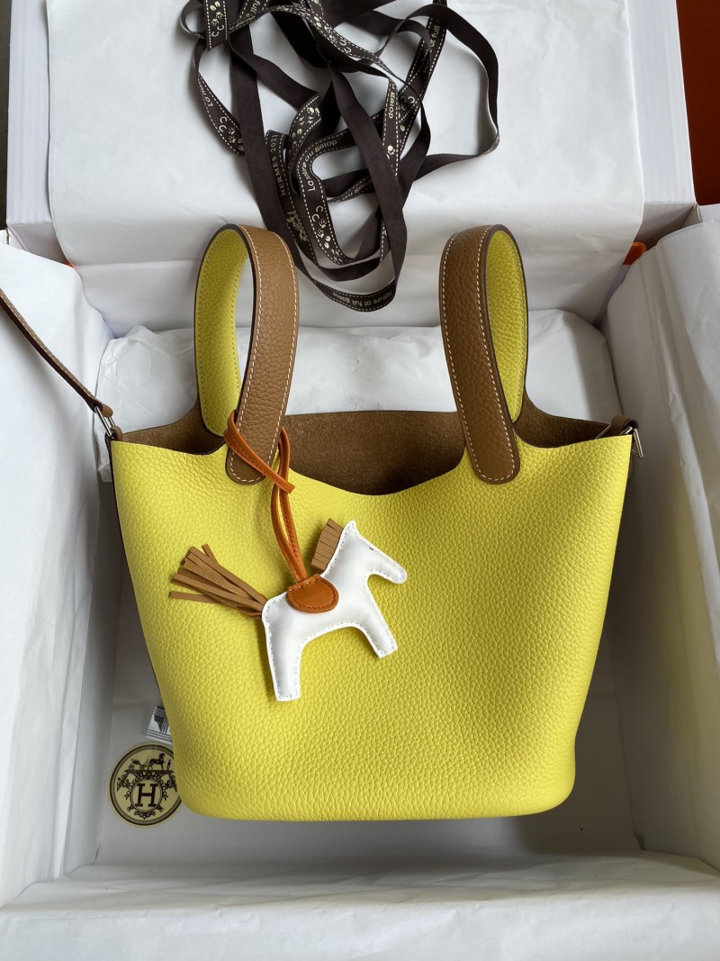This handcrafted Picotin Basket features high quality 18cm Taurillon Clemence leather in a vibrant lemon yellow color with sesame brown accents. The silver buckle adds a touch of elegance to this stylish and practical basket. Perfect for carrying your essentials in style.
