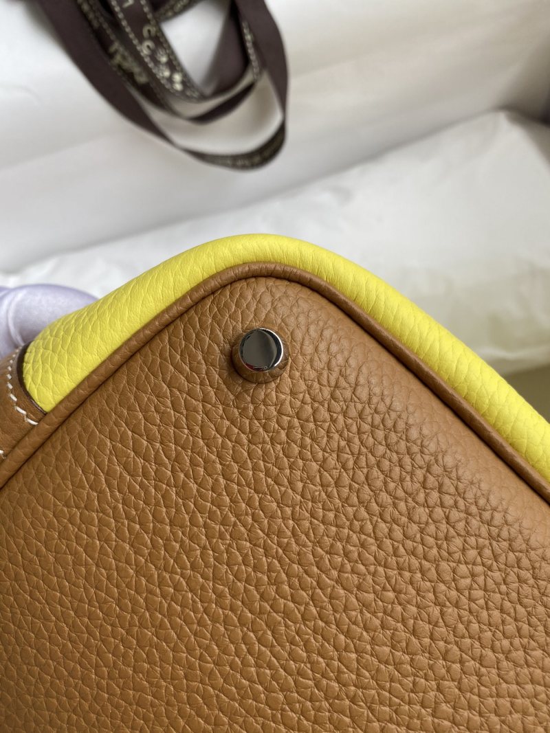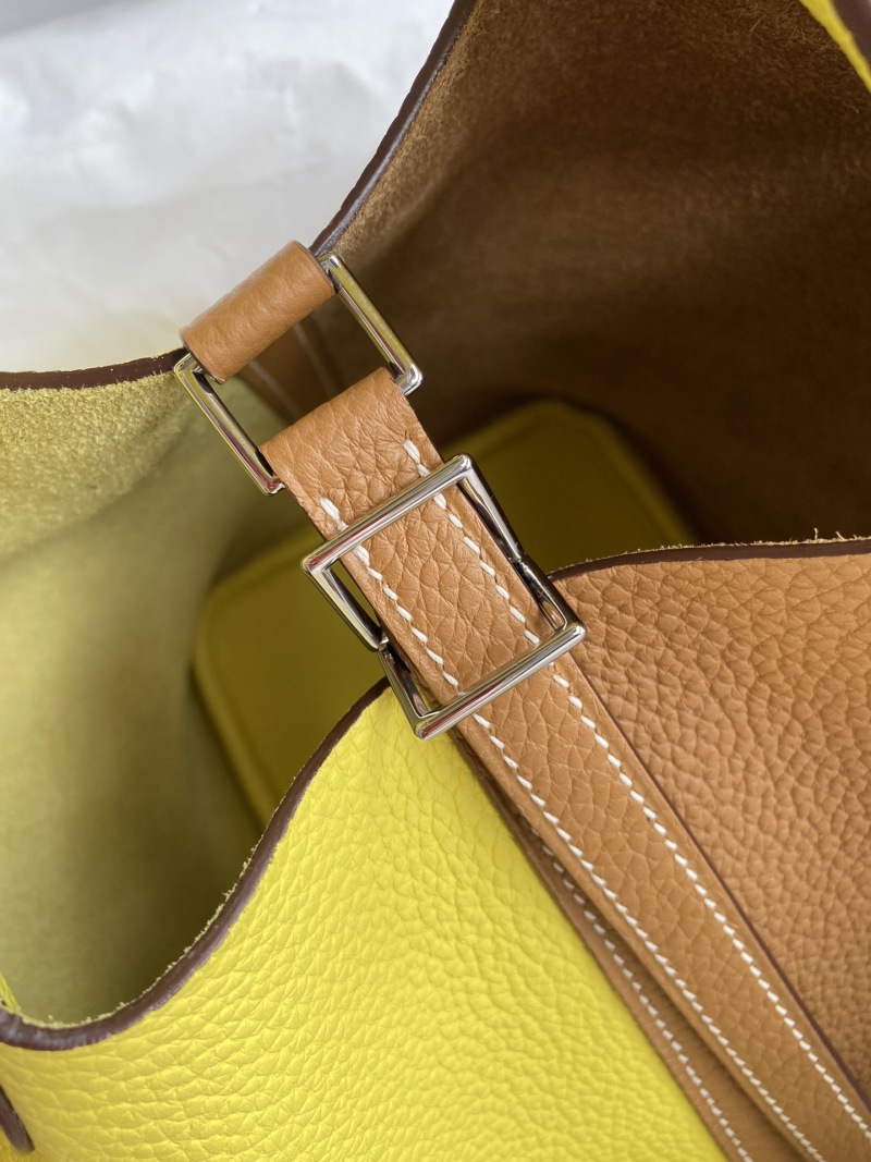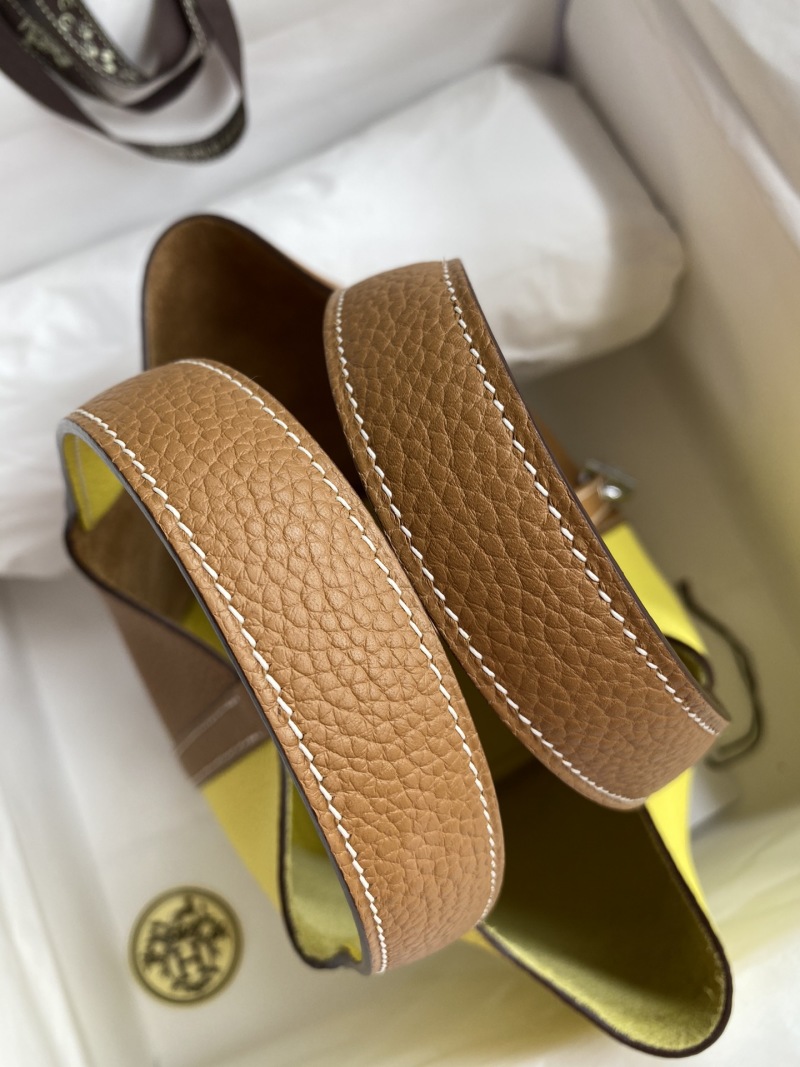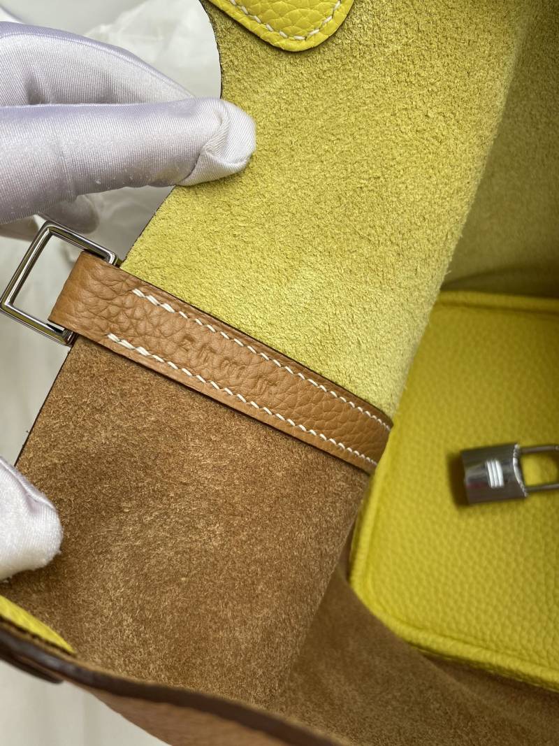 Handmade Picotin Basket...18cm Imported Taurillon Clemence Leather in Lemon Yellow with Sesame Brown and Silver Buckle