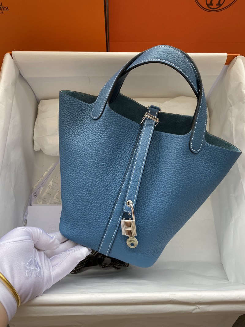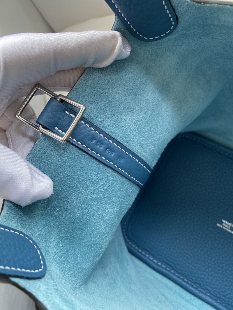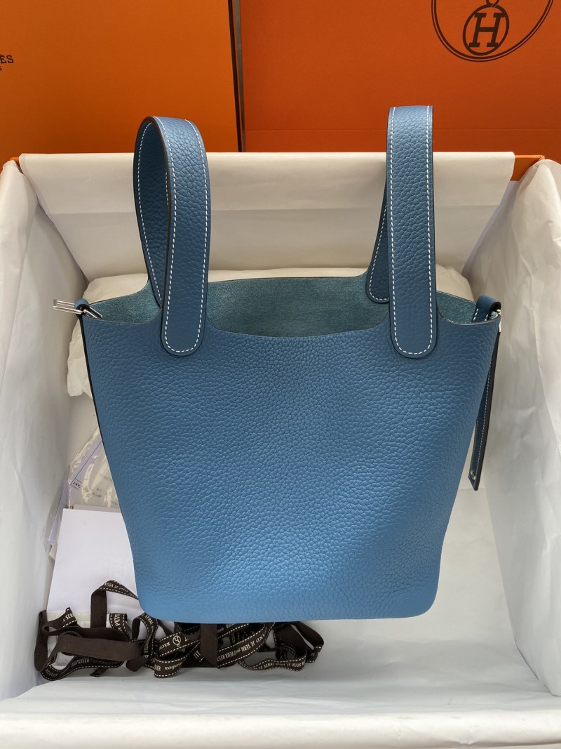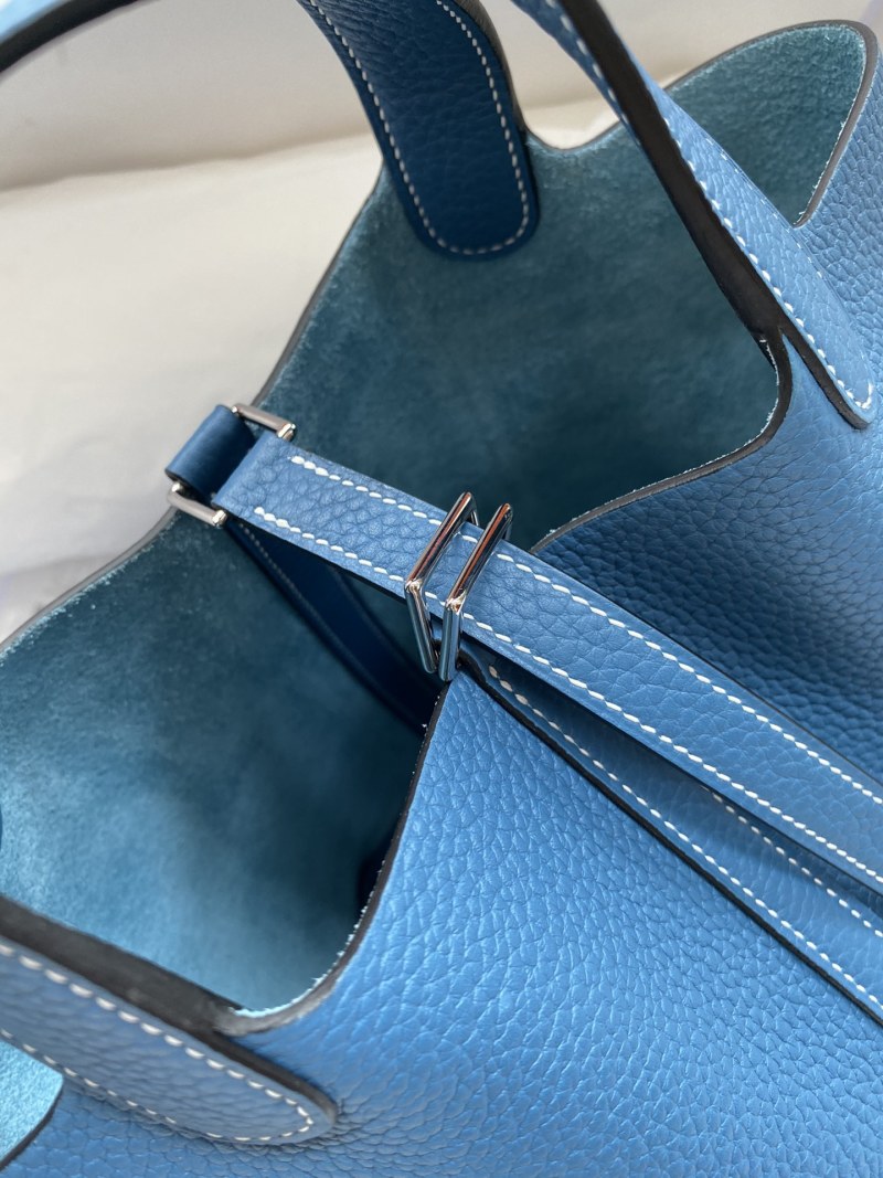 Elevate your style with this beautifully crafted Picotin basket bag, made entirely by hand. The bag features a compact 18cm size and is made from imported Taurillon Clemence leather in a trendy denim blue color. Finished with a sleek silver buckle, this bag is both stylish and functional, perfect for adding a touch of elegance to any outfit.