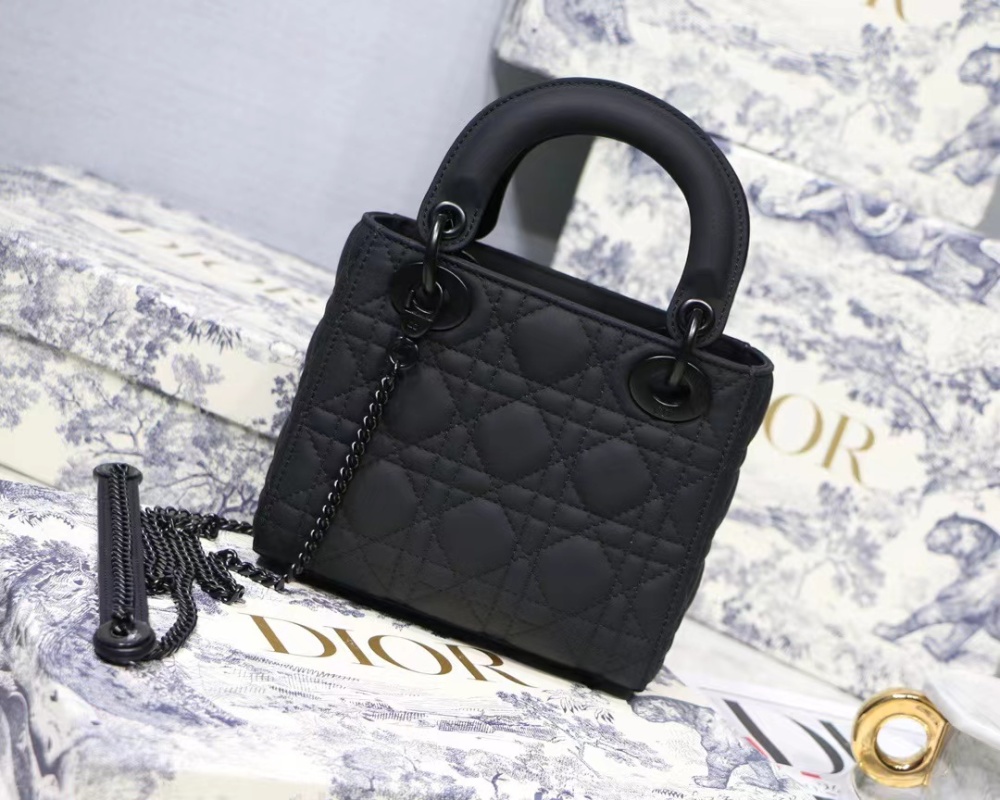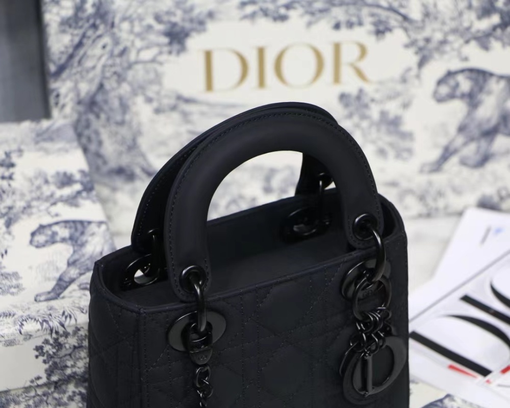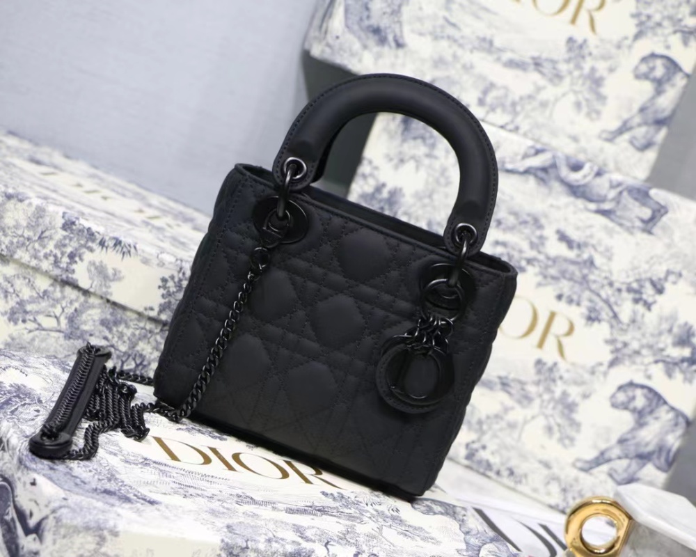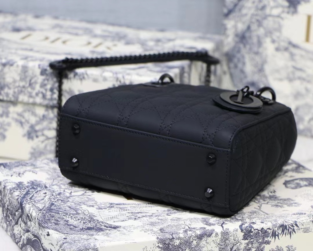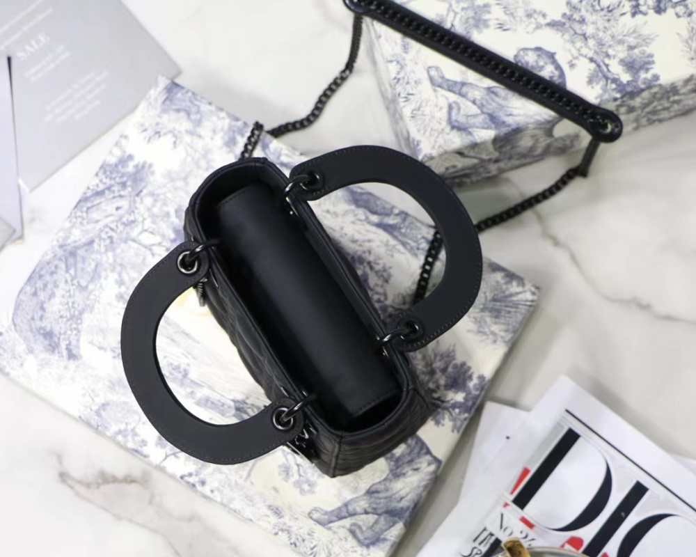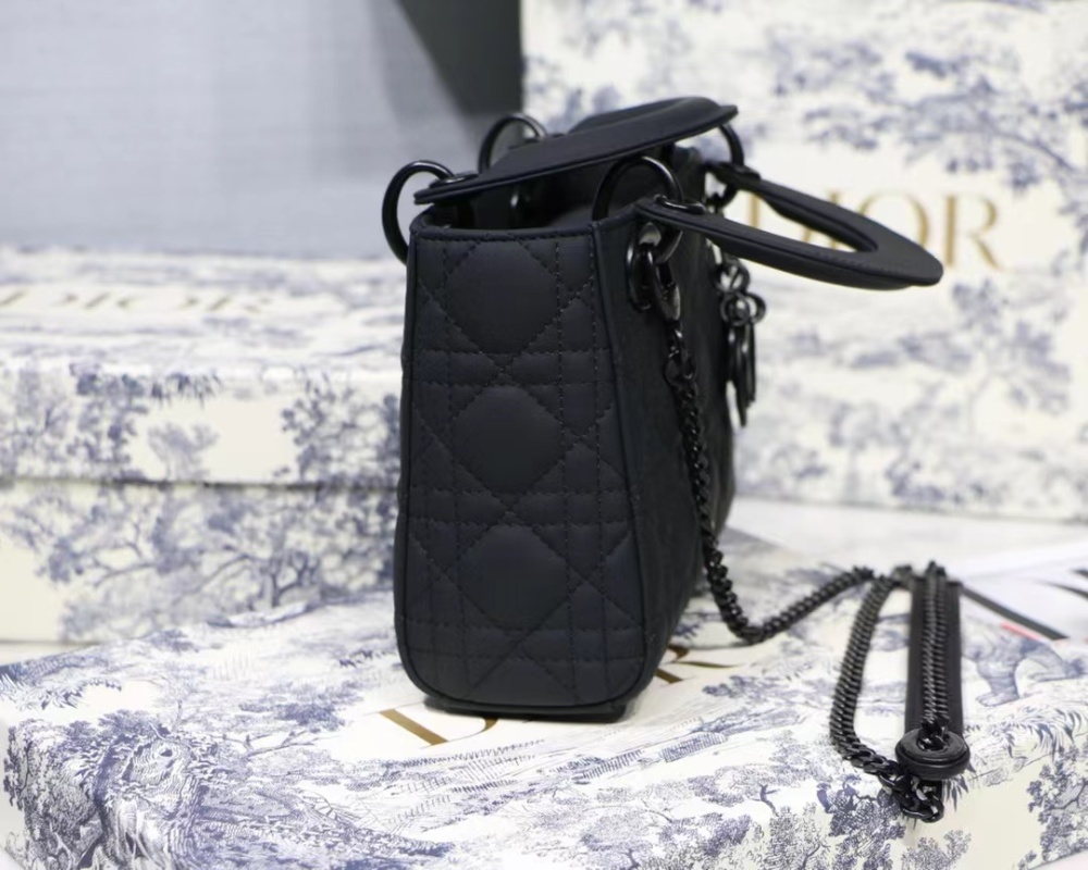 The new season Lady Di.or Ultra-matte 🖤 SO BLACK 17cm handbag features a textured matte black hardware and chain strap, making it a versatile and stylish option for daily commuting and professional wear. The calfskin leather material is durable and resistant to deformation and scratches, offering a low-maintenance yet luxurious accessory option. Transform your look from sleek and professional to edgy dark fashion with this elegantly versatile handbag. Size: 17cm.