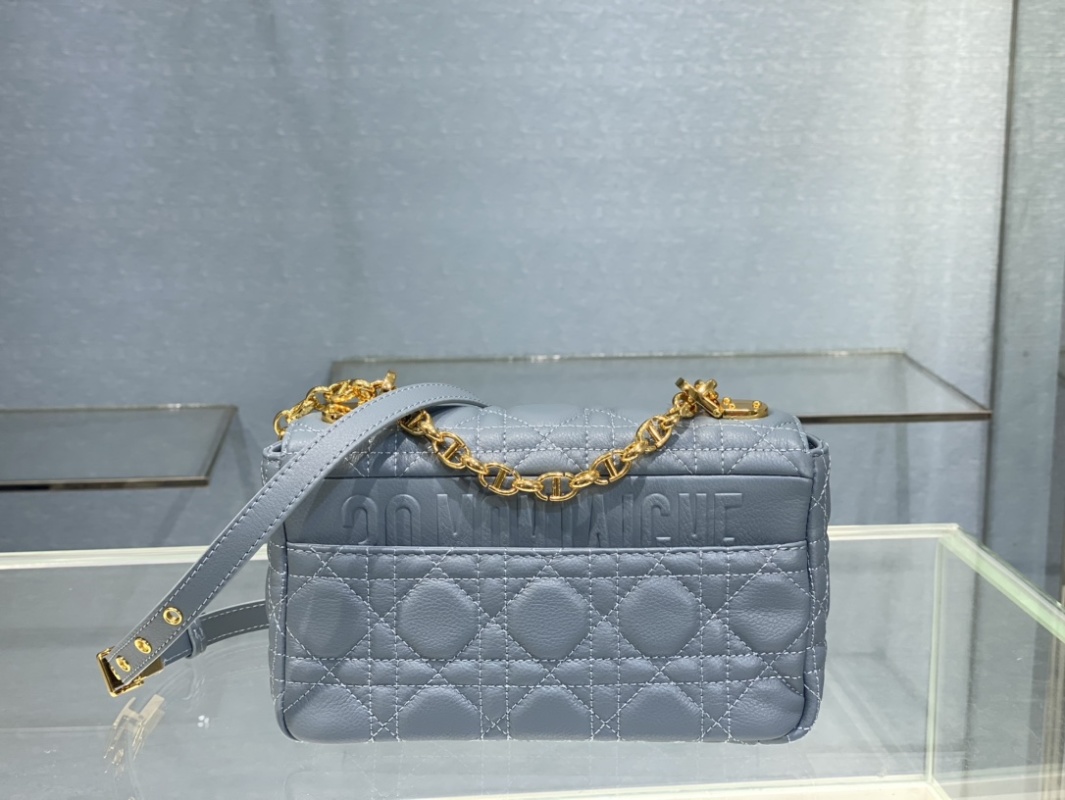 The small Dior Caro handbag is expertly crafted in blue calfskin leather, adorned with the iconic quilted stitching. The material is supple, with a flap embellished with a vintage gold-finish metal "CD" clasp, inspired by the closure of Christian Dior perfume bottles. This medium-sized style comes with a detachable signature "CD" chain shoulder strap, which can be swapped out for an embroidered wide shoulder strap for added elegance and fashion. Whether for everyday wear or evening events, this