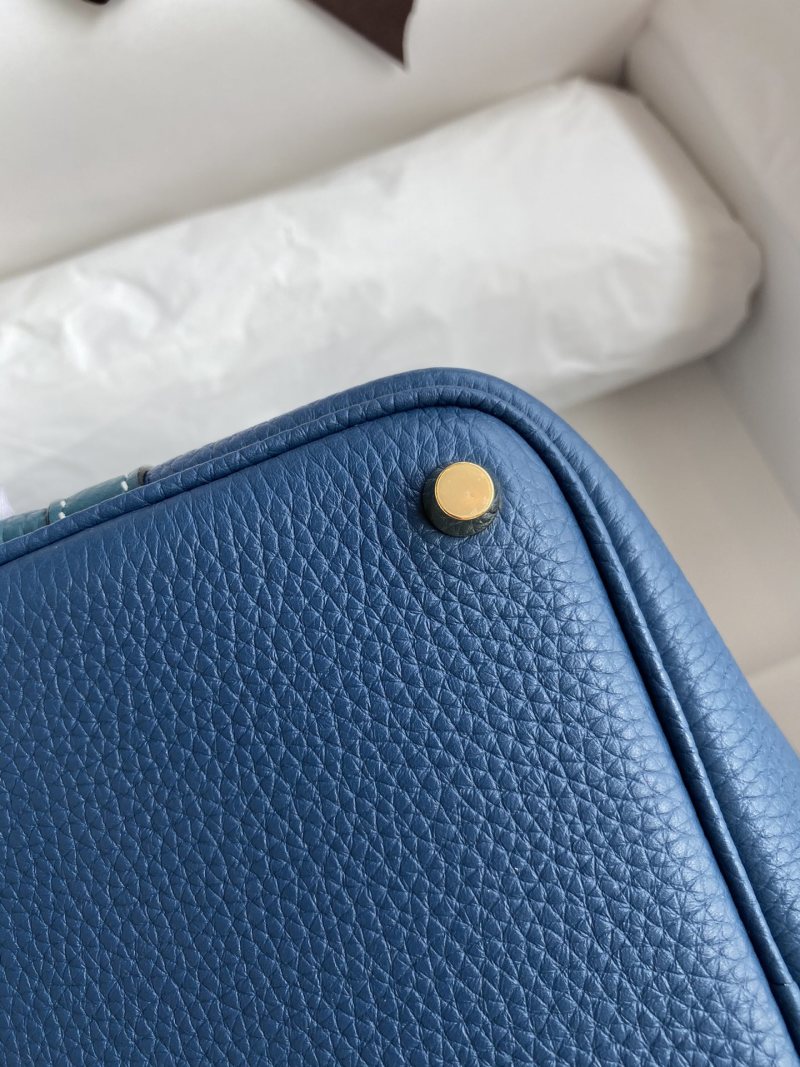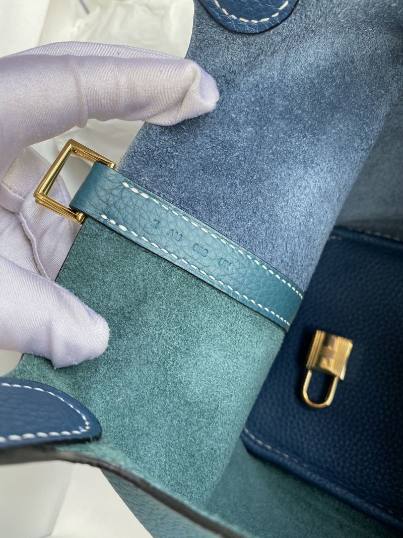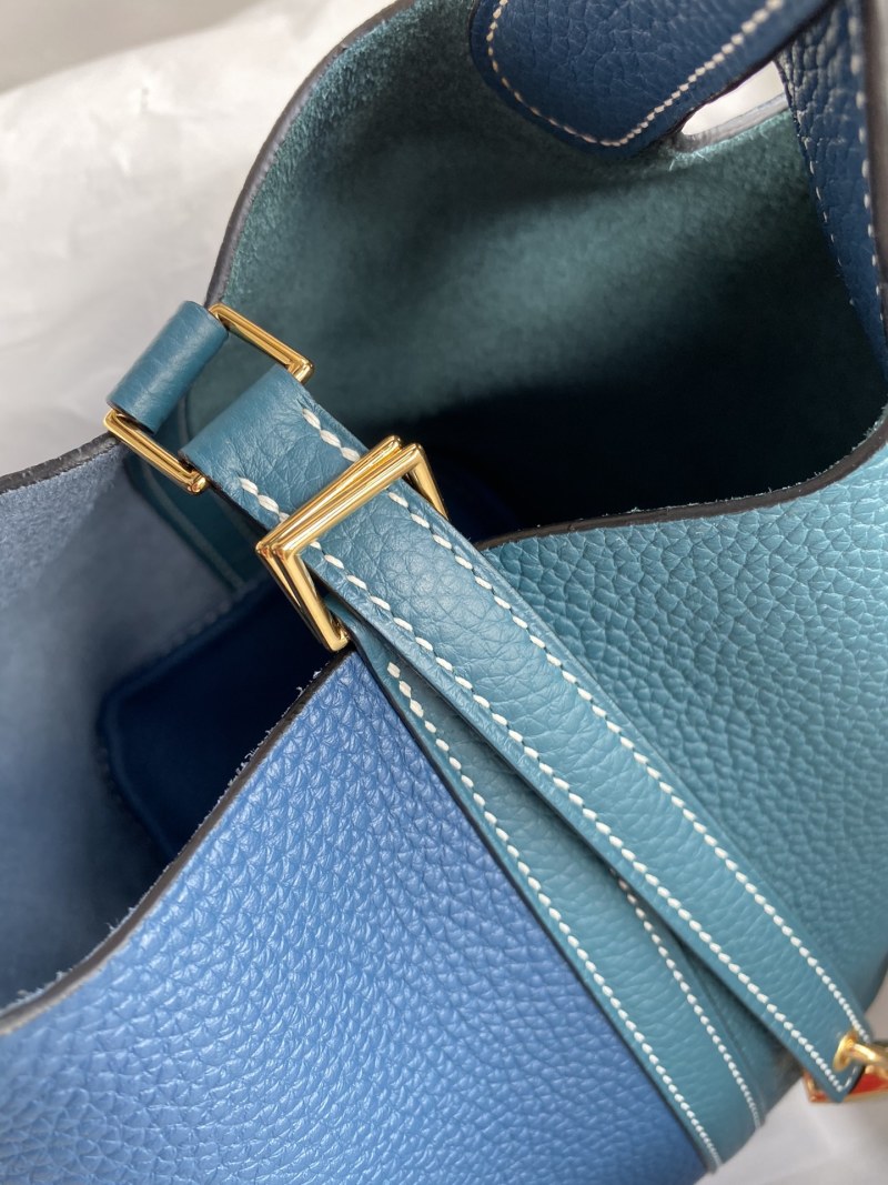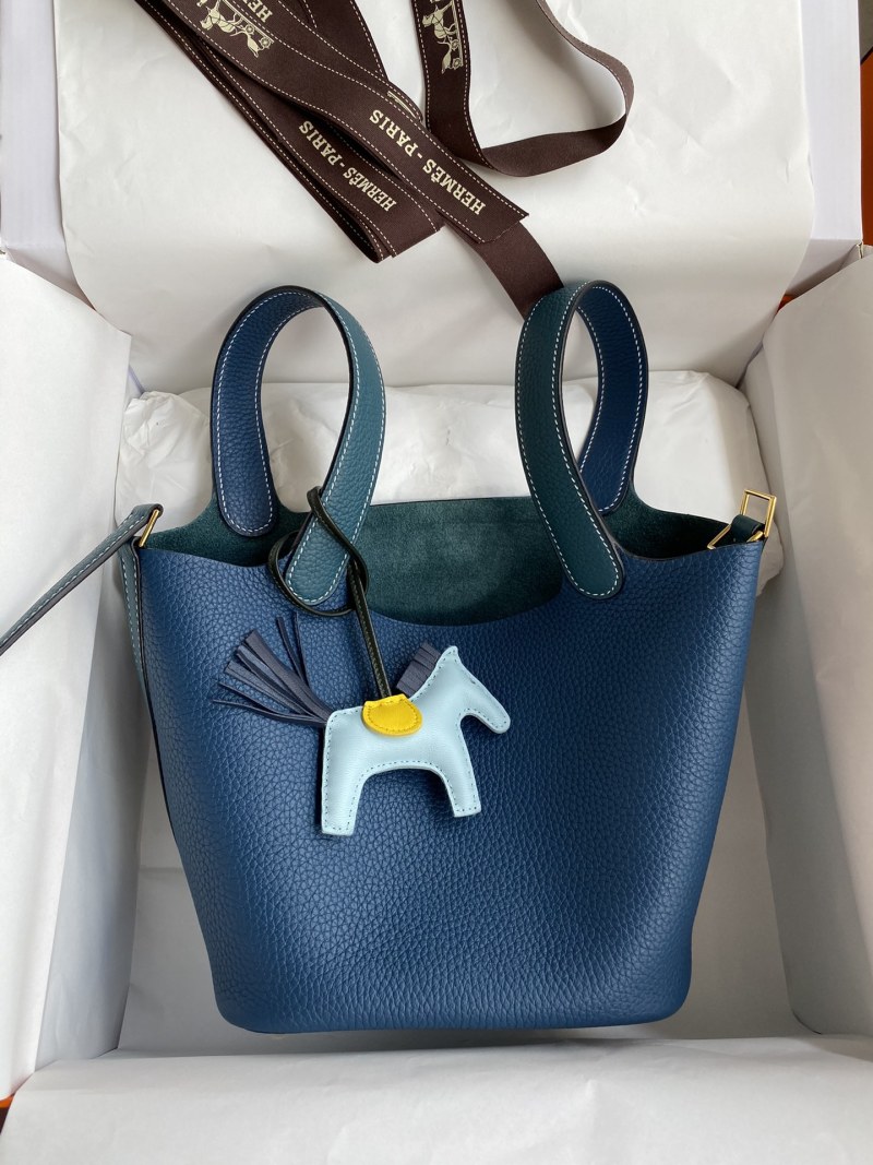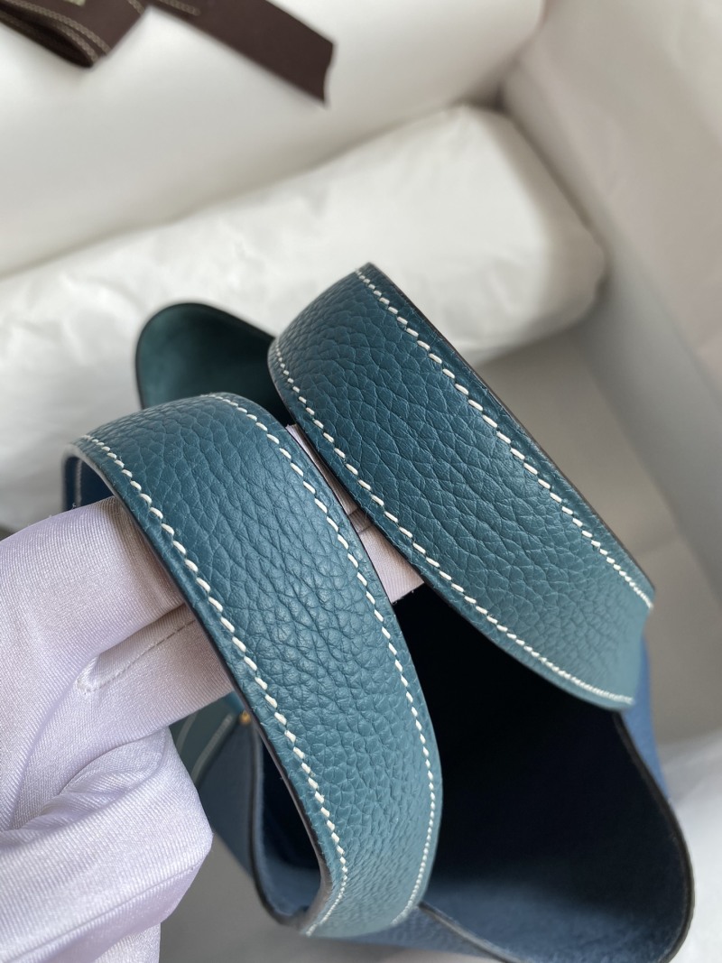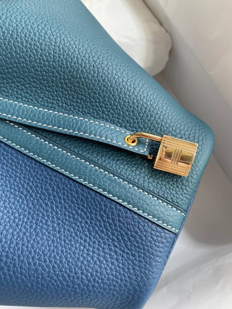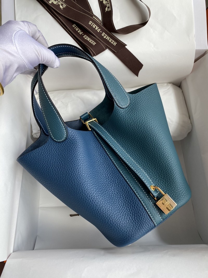 This handcrafted 18cm Picotin basket bag is made from high-quality imported Taurillon Clemence leather with exquisite details in Bosphorus Green and Deep Blue contrast. Complete with a luxurious gold buckle, this unique bag is a versatile and stylish addition to any wardrobe.