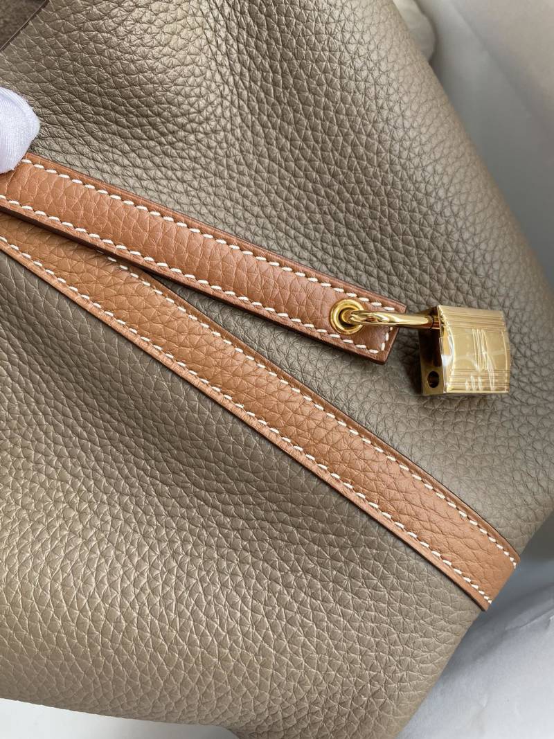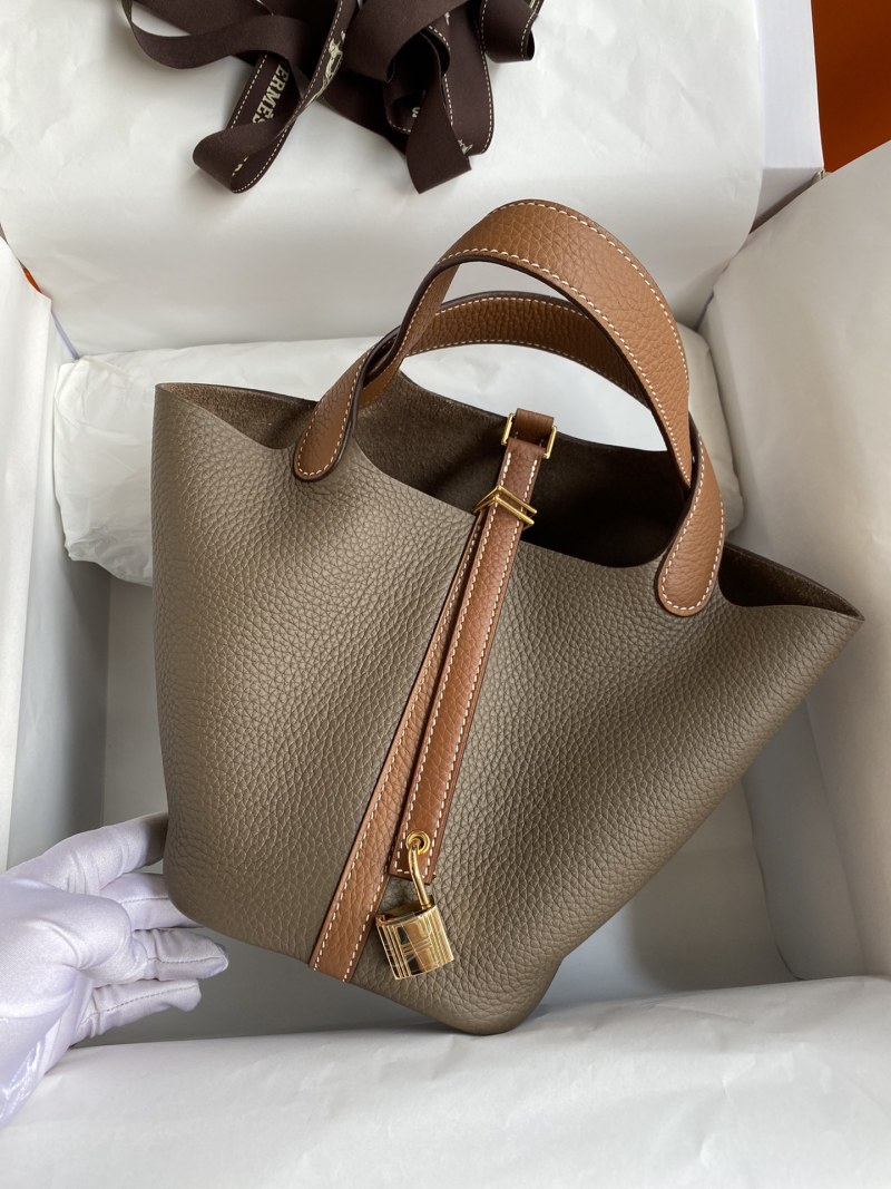 This Picotin basket is meticulously handcrafted with imported Taurillon Clemence leather in elephant grey color, featuring elegant gold and brown accents and a gold clasp closure. Perfect for adding a touch of sophistication to your everyday style.