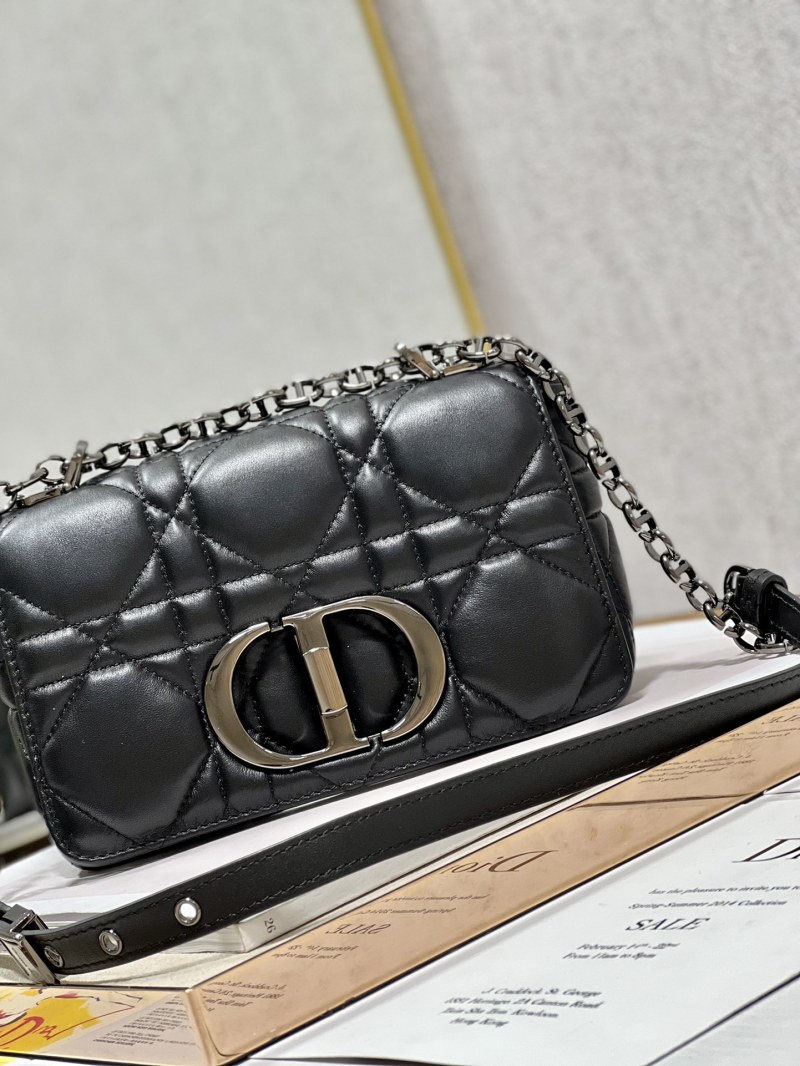 The small size Caro handbag from CD Home features a black gunmetal hardware exterior made of high quality cowhide leather with a large woven pattern, while the interior is lined with soft sheepskin. The flap is embellished with a gunmetal 'CD' buckle and comes with a detachable chain shoulder strap and replaceable embroidered wide shoulder strap. This handbag model M9241 measures 20×12×7cm.