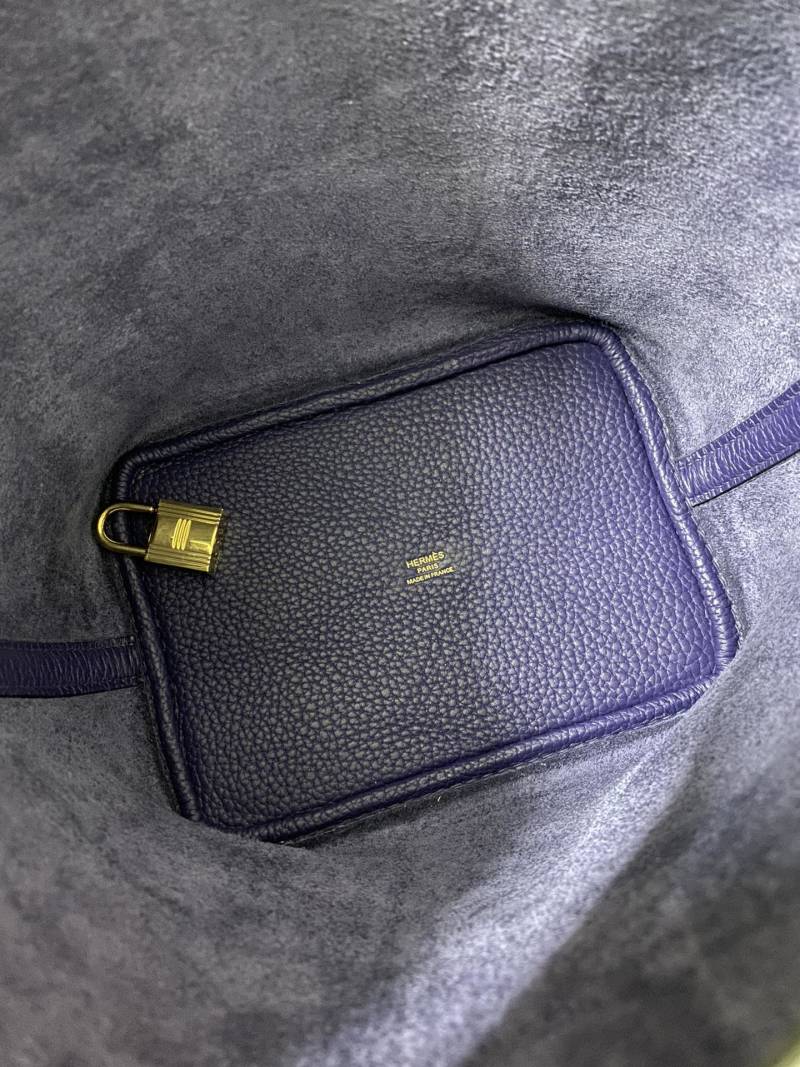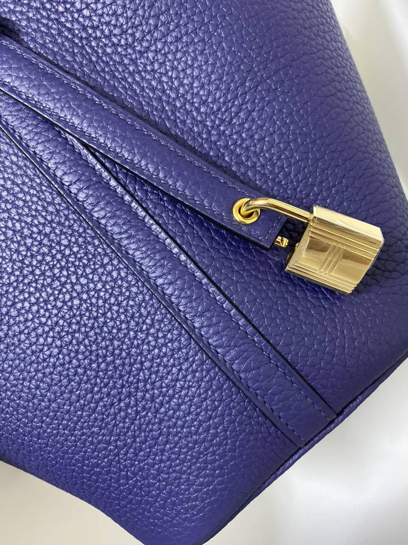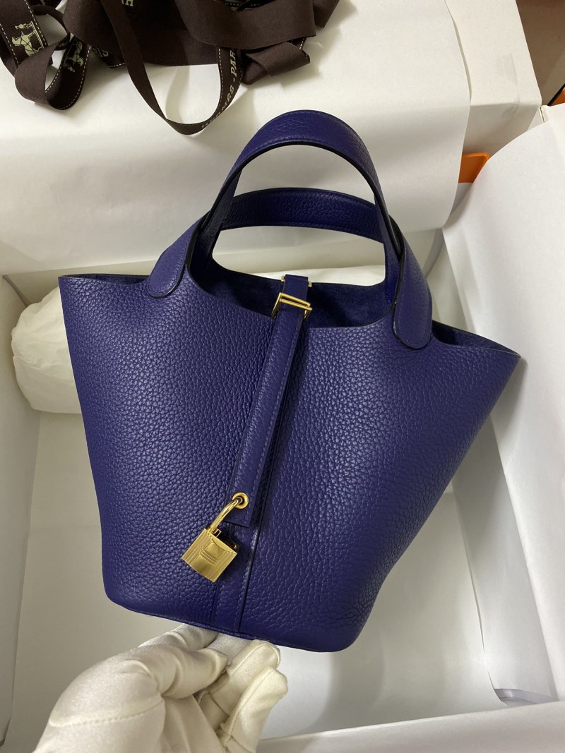 This beautifully handmade Picotin...18cm basket bag is crafted from imported Taurillon Clemence leather in a stunning ink blue color, complete with a classic gold clasp. Perfect for adding a touch of luxury to any outfit, this statement piece is both stylish and functional, making it a must-have accessory.