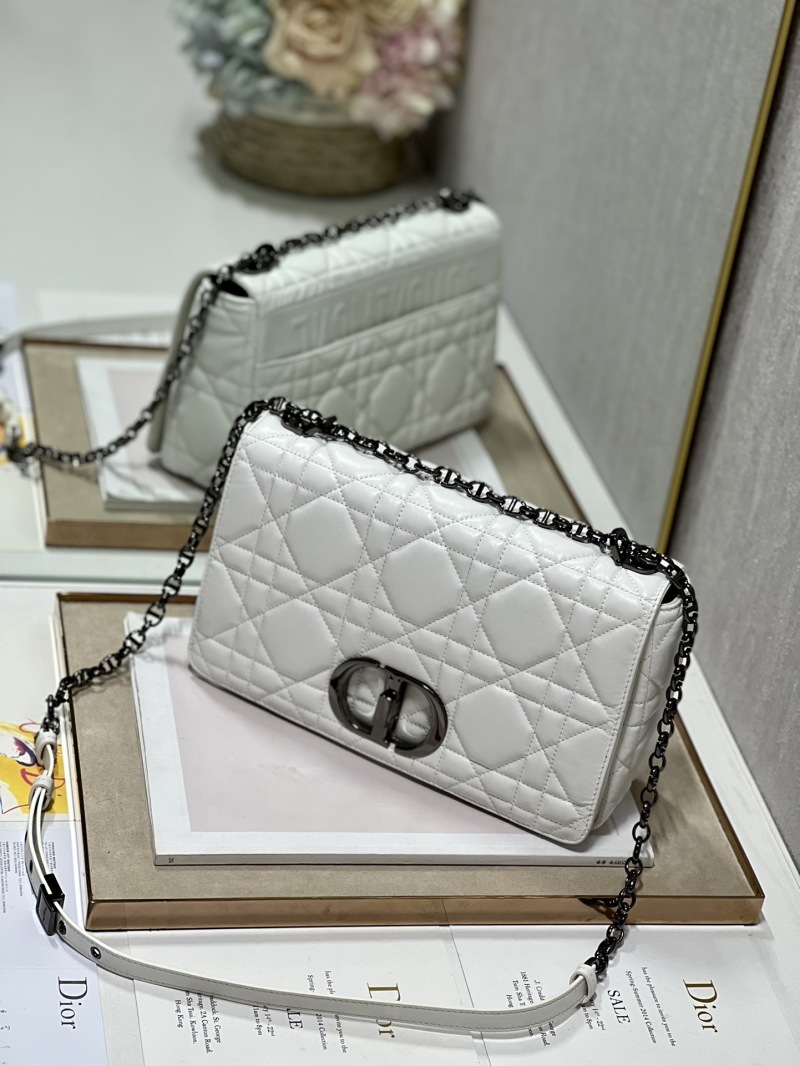 The large-size Caro handbag from the "CD Family" collection features a white gunmetal cowhide leather exterior with an oversized cannage pattern, lined with sheepskin on the inside. The flap is adorned with a gunmetal 'CD' metal buckle, and it comes with a detachable chain shoulder strap and an optional embroidered wide shoulder strap. Model number: M9243, dimensions: 28×17×9cm.
