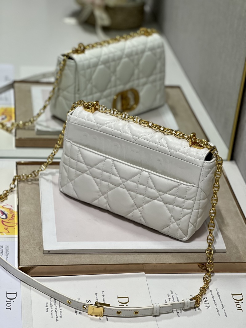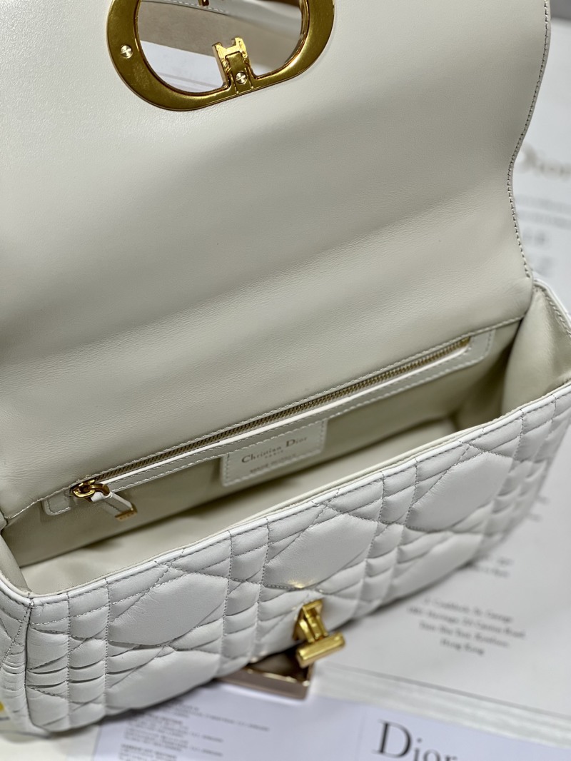 The medium-sized CD Family presents the classic bestseller Caro handbag in a white color with a gold clasp. The exterior is crafted from oversized tanned cowhide leather with a large woven pattern, while the interior is lined with sheepskin. The flap is adorned with a gunmetal 'CD' buckle ring, and the handbag comes with a detachable chain shoulder strap and interchangeable embroidered wide shoulder strap. Model number: M9242, Size: 25cm.