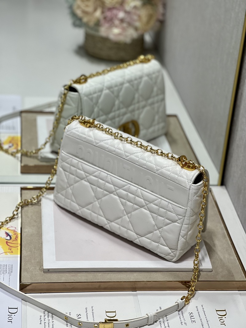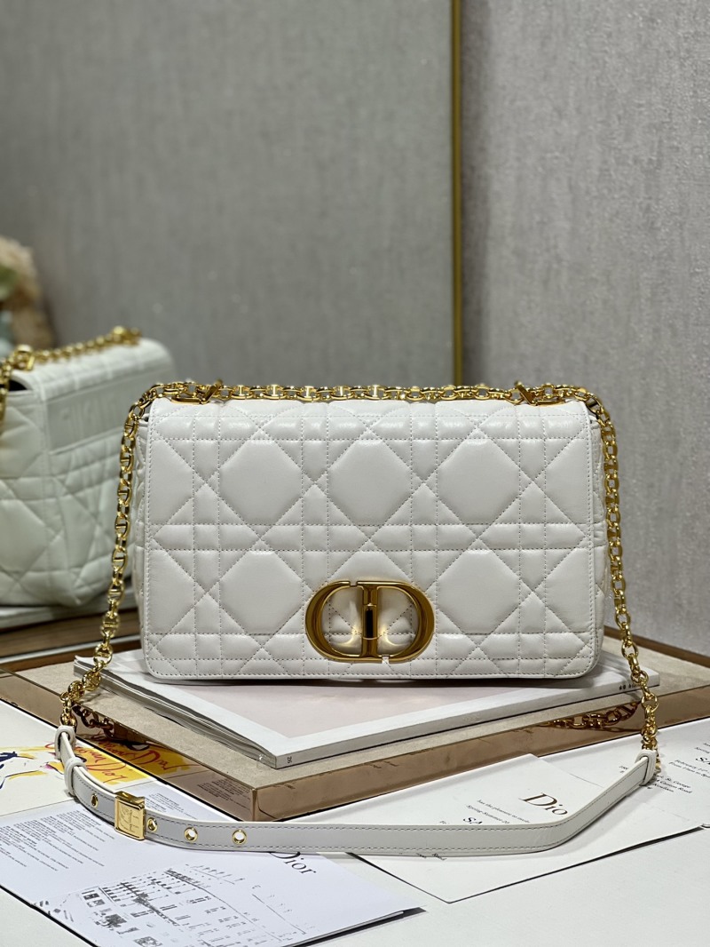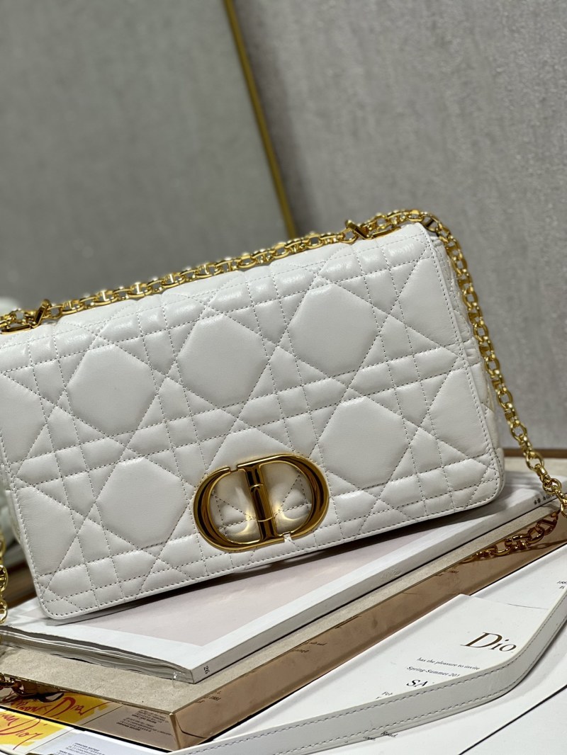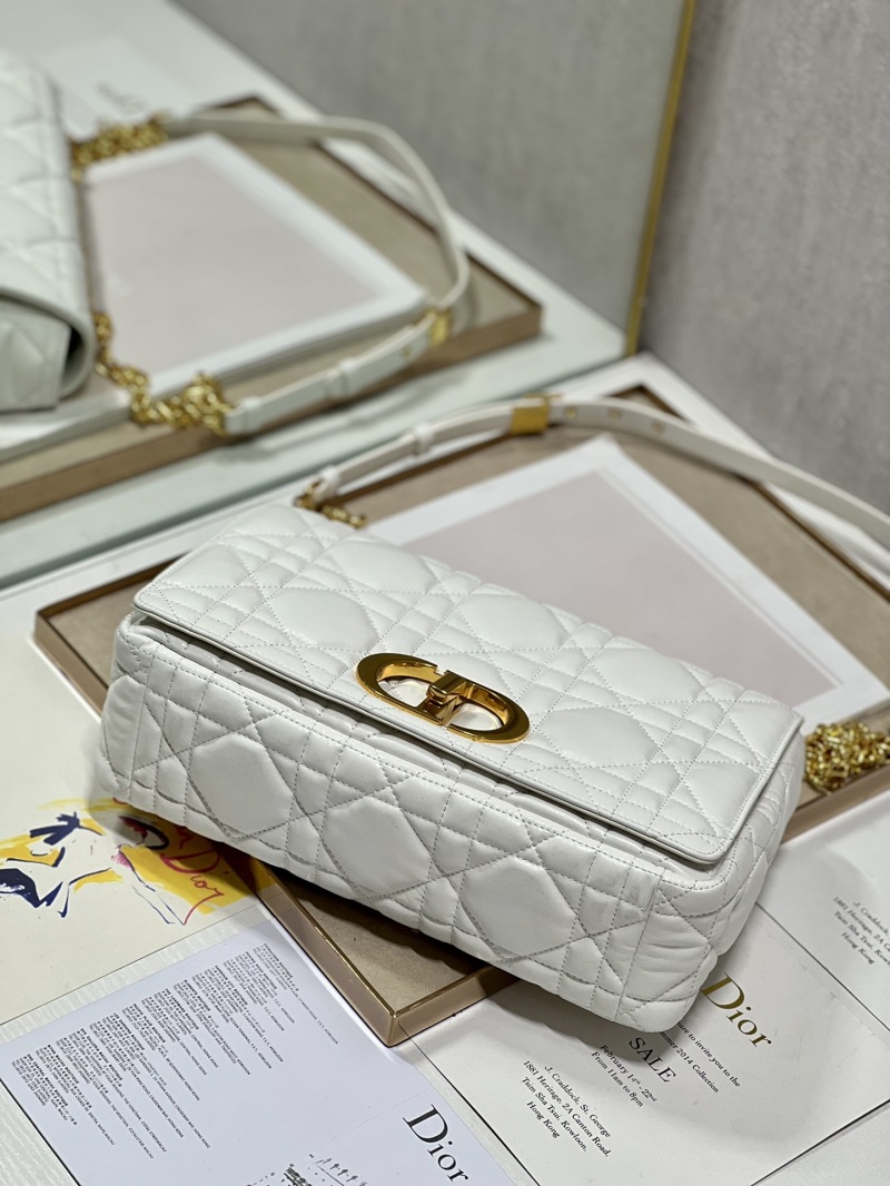This classic Caro handbag from CD家 features a stylish white color with a gold buckle, made of oversized wicker leather grid on the exterior and soft sheepskin on the interior. The flap is adorned with a rifle-color metal 'CD' buckle for an elegant touch. It comes with a detachable chain shoulder strap and a replaceable embroidered wide shoulder strap for versatile styling options. Model M9243 measures 28×17×9cm, making it the perfect size for daily essentials.