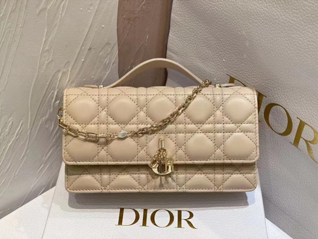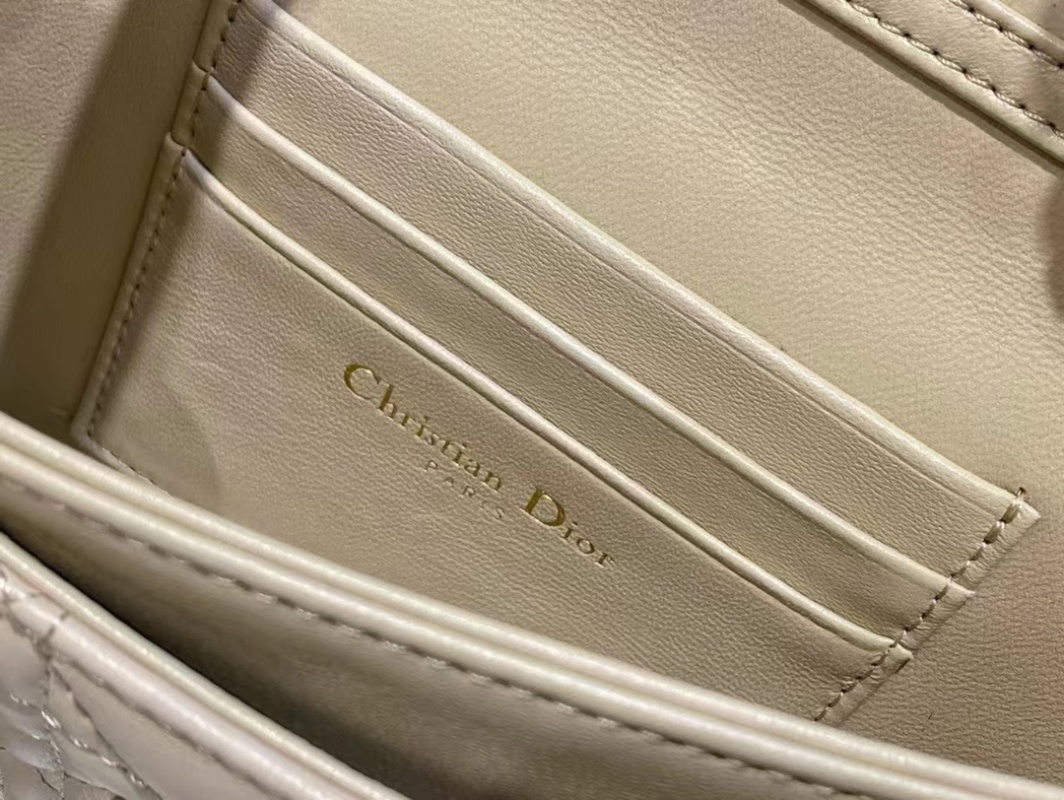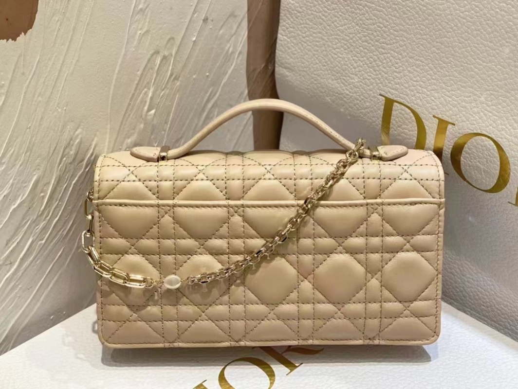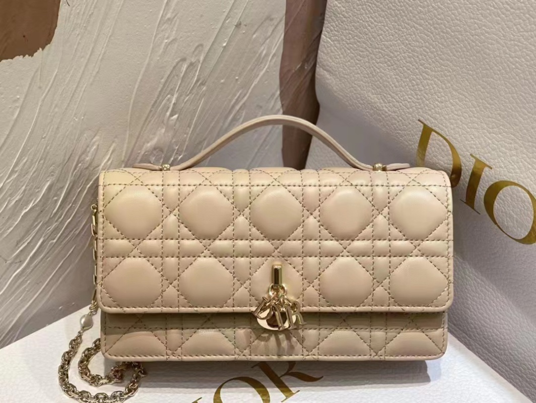 This season's new Lady Dior Pearl Clutch features a top handle for elegant practicality, enhancing the richness of the Lady Dior collection. Crafted from pink lambskin leather with a cane motif, the flap design is adorned with a D.I.O.R. charm to elevate the style. The functional style includes multiple compartments and card slots for storing various daily essentials, making it the perfect companion for day and evening outfits. The top handle can be removed and the chain can be adorned with pear