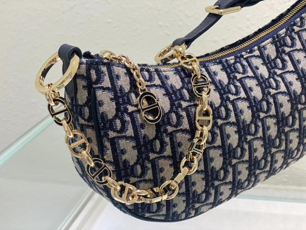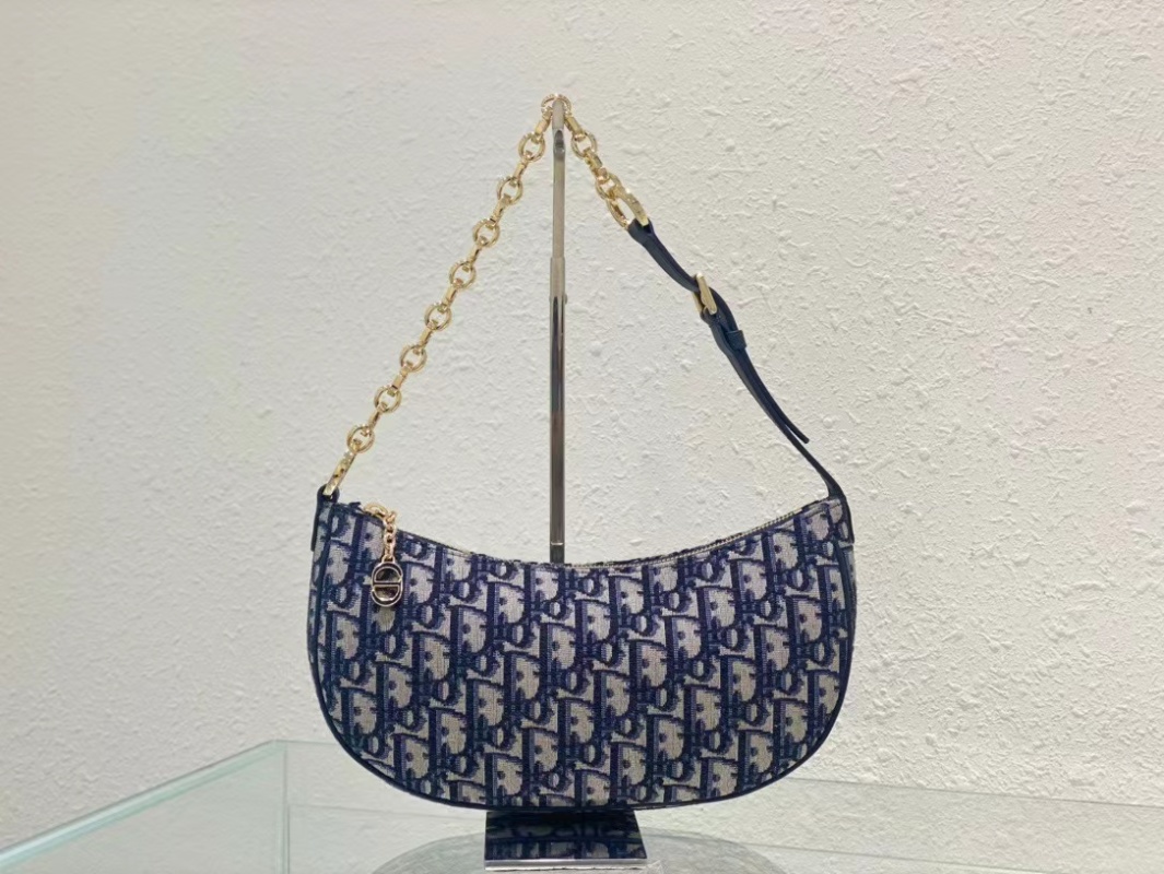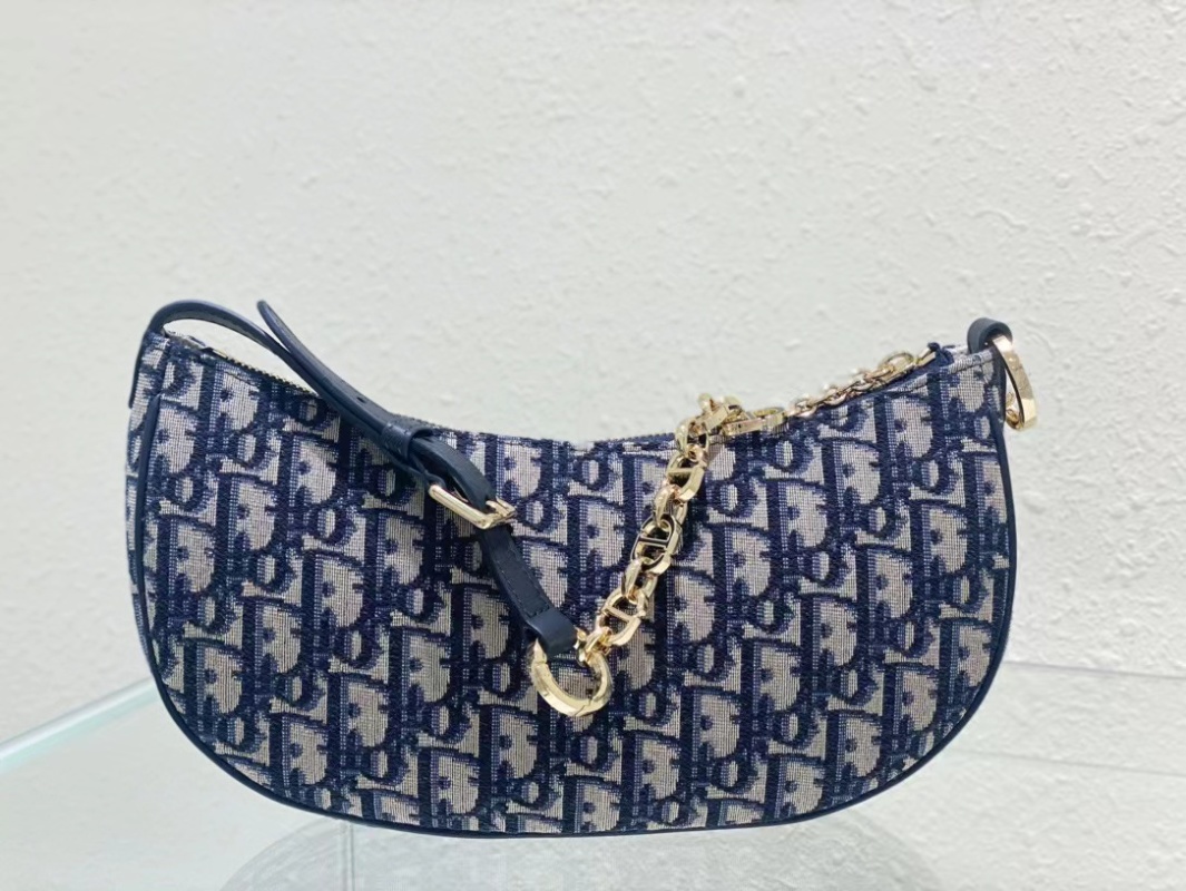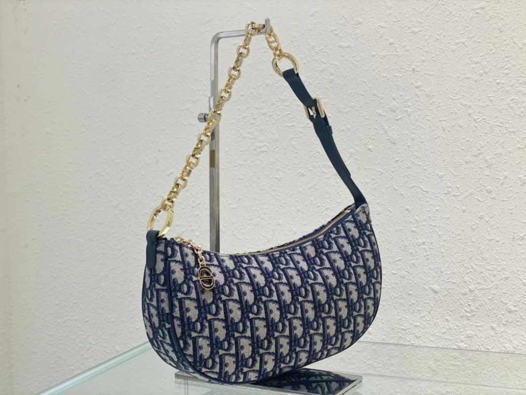 The CD Lounge handbag is a new product for the summer of 2023, showcasing Dior's modern aesthetic and high-fashion style. It is meticulously crafted from blue jacquard fabric, featuring a classic chain strap with leather accents, adorned with gold-finished metal hardware and enamel chain rings in matching tones. The handbag can be folded and carried on the shoulder or by hand. Dimensions: 26 x 15 x 5.5 cm.