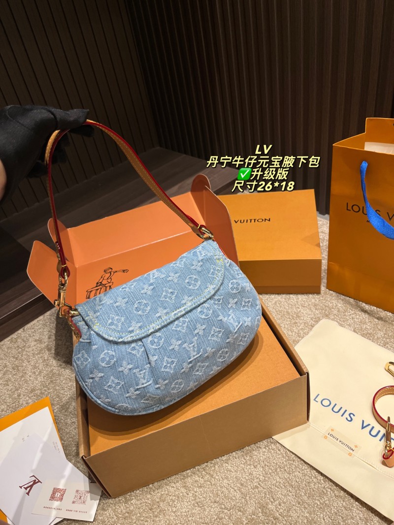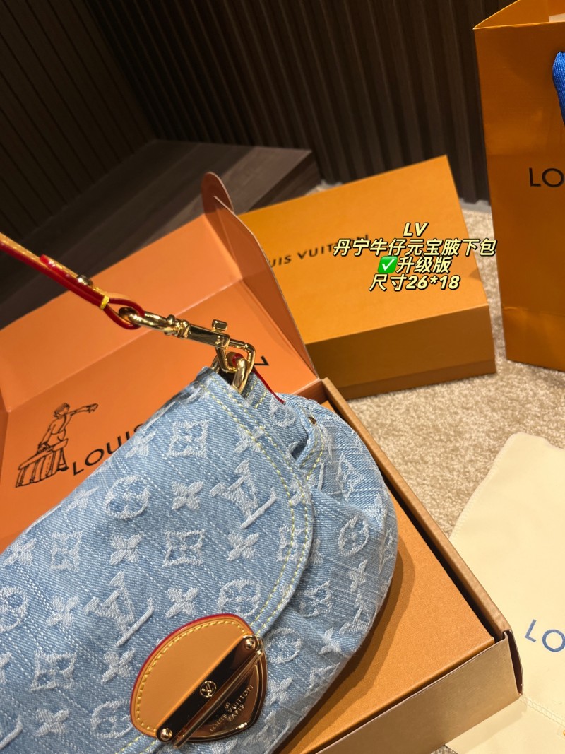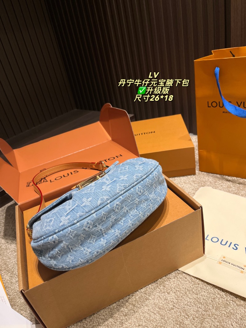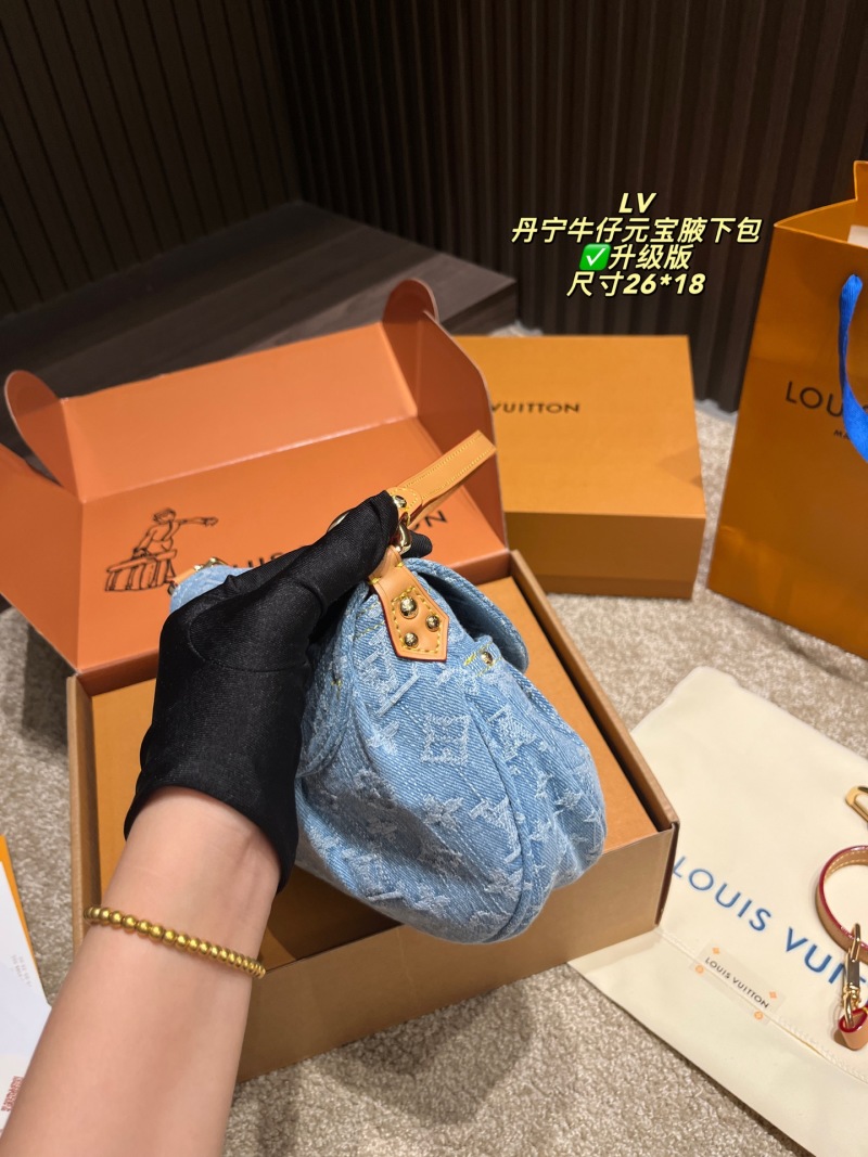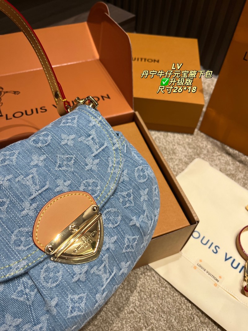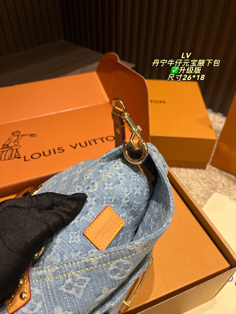 The upgraded foldable box bag in size 26.18Lv Sunset denim money bag effortlessly embodies a retro chic style with its wide and structured silhouette. Simple yet sophisticated, this bag requires minimal decoration and pairs perfectly with everyday outfits such as suits and t-shirts, showcasing a high-fashion sense to the fullest.
