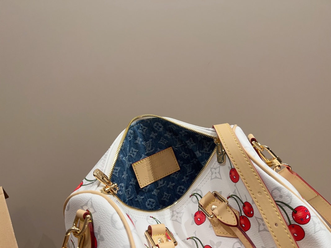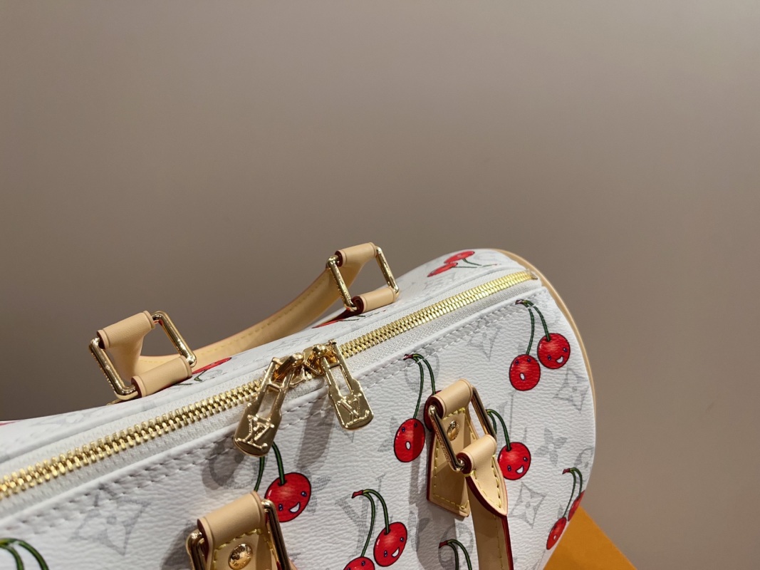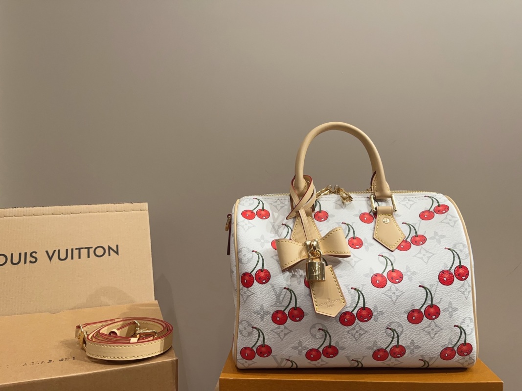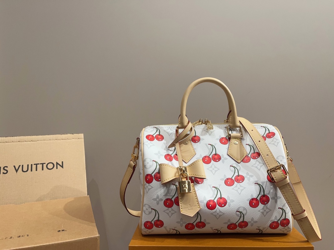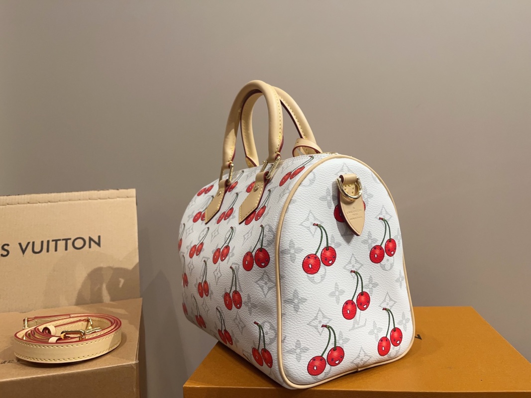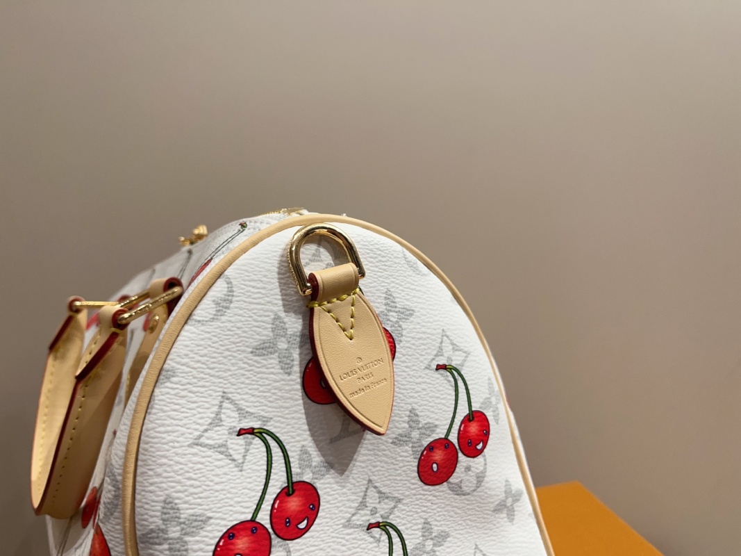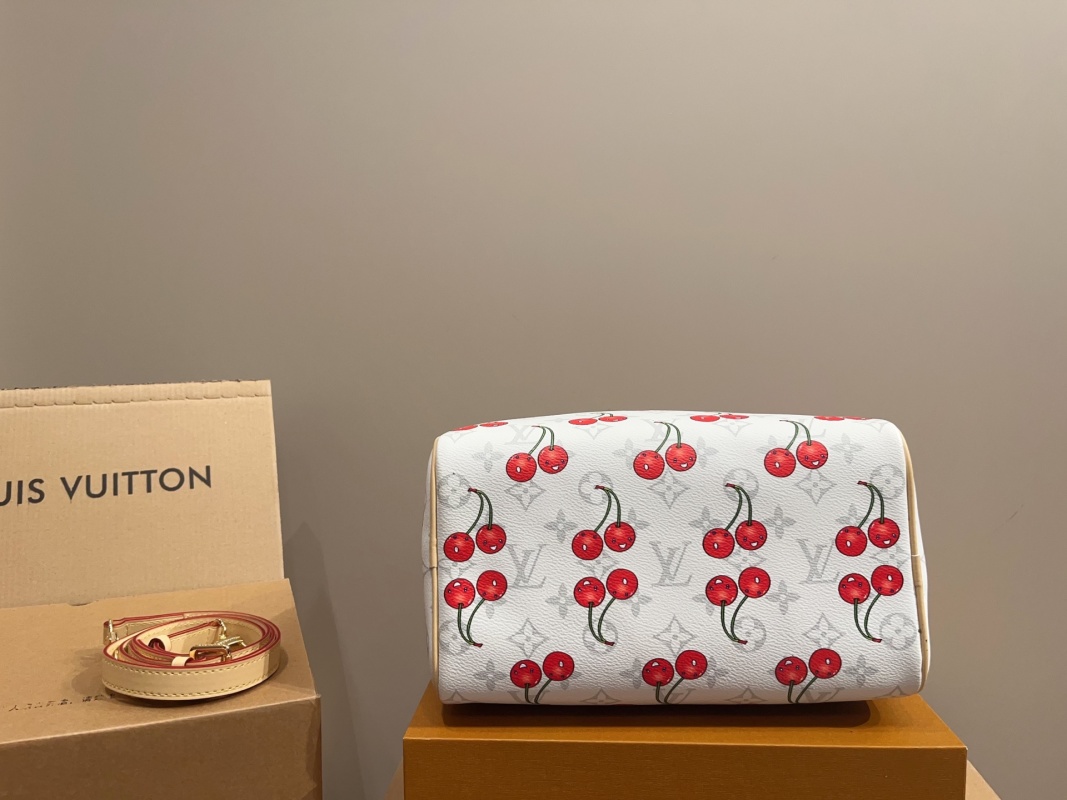 The vibrant signature of the LV x Murakami collection reissue elevates the Speedy Bandoulière with a chic twist. The sweet cherry pattern in joyful colors enhances the house's iconic Monogram-coated canvas, while natural leather highlights the Toron top handle, detachable strap, and exclusive LV x TM lock!