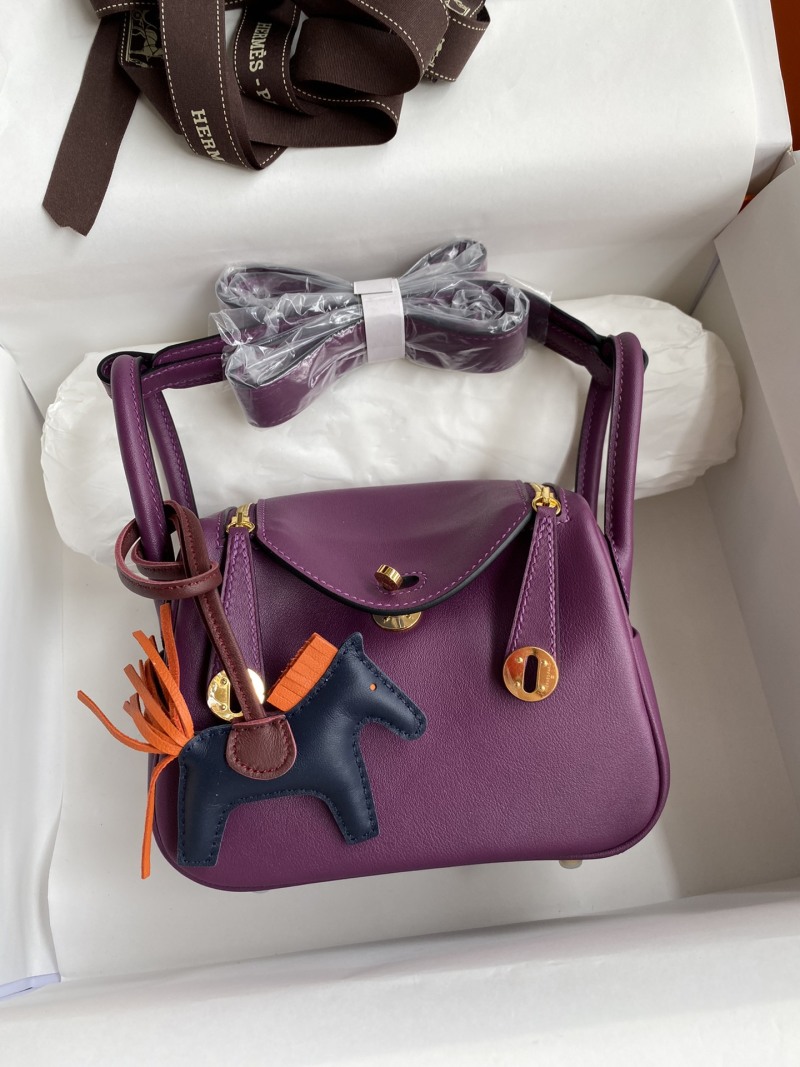 This Mini Lindy 19cm handbag in imported Swift leather in a beautiful seaweed purple color with a gold buckle is a must-have accessory for fashion enthusiasts. Hand-sewn with attention to detail, this handbag combines luxury and style, making it a perfect addition to any wardrobe.