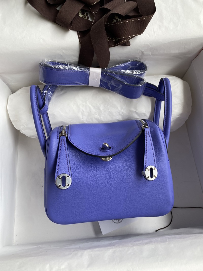 This exquisite Mini Lindy handbag is hand-sewn with imported Swift leather in a charming lila color. With a compact size of 19cm and a stylish silver clasp, this handbag is perfect for any fashion-forward individual looking to add a pop of color to their wardrobe.