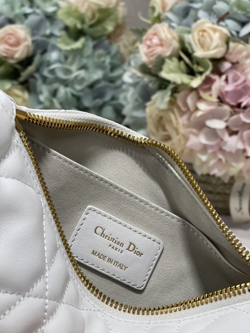 The Dior Vibe Shoulder Bag is a stylish and modern addition to this season's collection. Crafted from white cowhide leather with a cane check pattern stitching, the bag features a soft suede interior for added luxury. The bottom is adorned with a black "CHRISTIAN DIOR PARIS" logo. The small size bag comes with a handle, detachable and adjustable shoulder strap with military-style buckles, allowing for hand carry, shoulder carry, or crossbody wear to complement both casual and sporty outfits. The