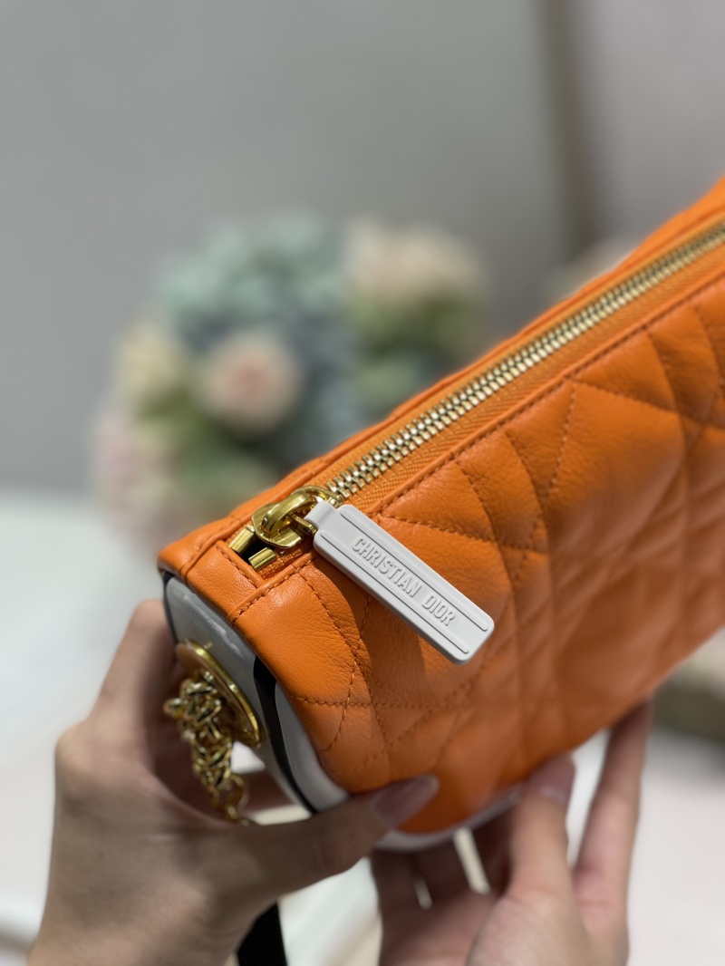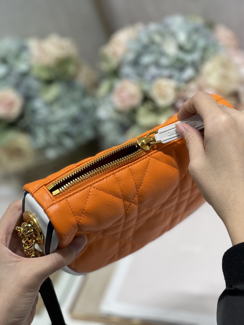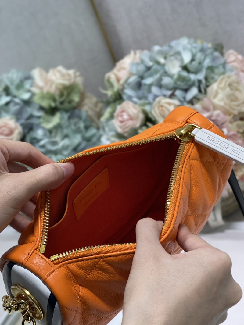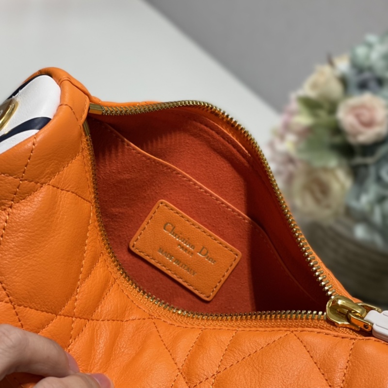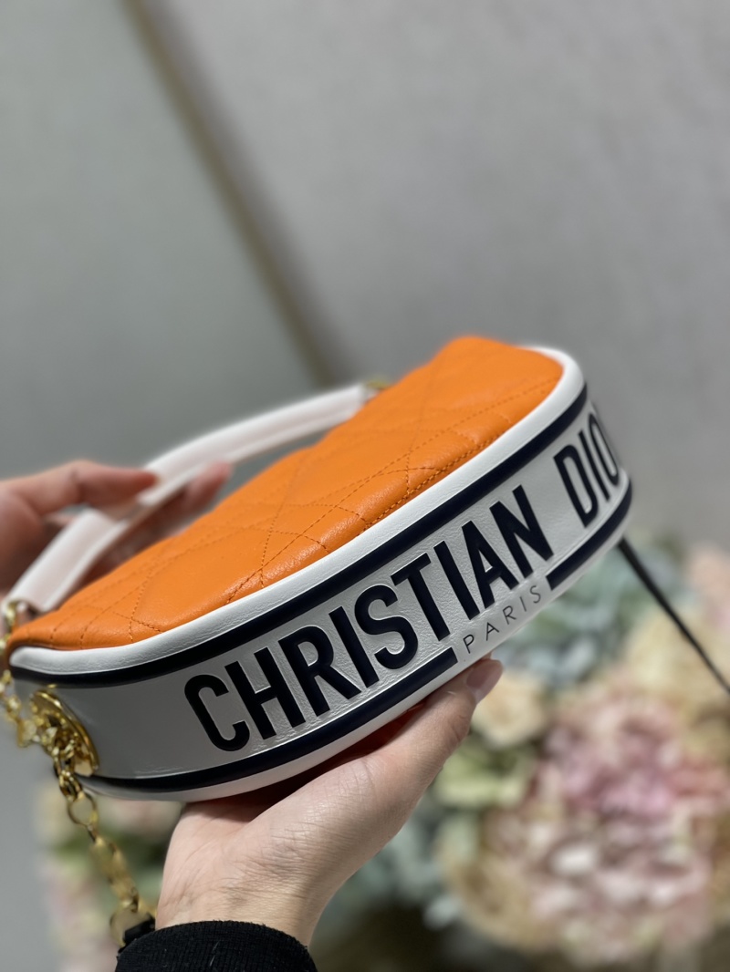 The Dior Vibe Small Shoulder Bag is a stylish addition to this season's collection, showcasing the modern charm of the shoulder bag silhouette. Crafted from orange cowhide leather and adorned with wickerwork stitching, the bag features a suede leather lining for added softness. The bottom is embellished with a black "CHRISTIAN DIOR PARIS" logo. The small size design comes with a handle, detachable and adjustable shoulder strap, and military-style buckle, allowing it to be carried by hand, should