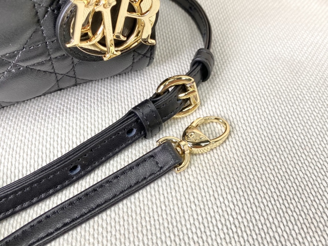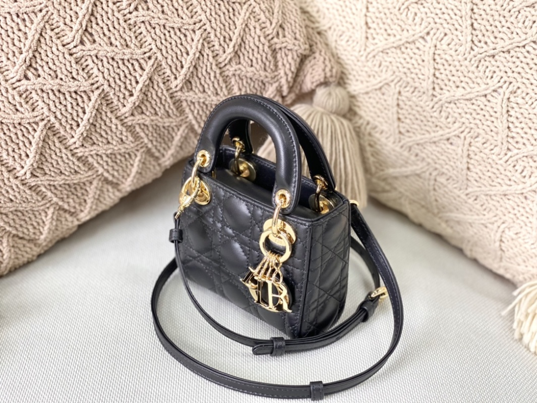 This ultra mini LadyDior handbag is made from sheepskin and comes in the color black. Measuring 12 x 10 x 5 cm, it features a flap opening design and adjustable leather shoulder strap. The model number is M49P.