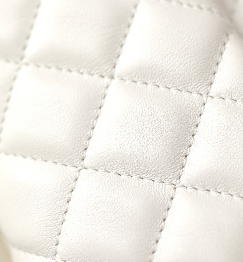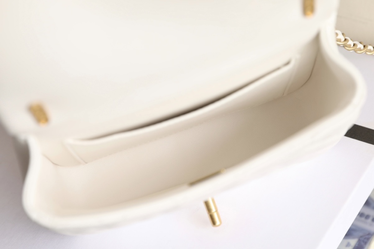 This new arrival of authentic Chane1 24P Spring/Summer Pearl Chain Flap Bag in white is now available for purchase, with a retail price of 42900rmb. The Mini Square design combines a chubby silhouette with pearl chain details, creating a casual yet stylish look. This bag features a unique collision of vintage and modern styles, with 24K gold hardware and original ZP lambskin leather. Dimensions: 12.5*17*5 cm.