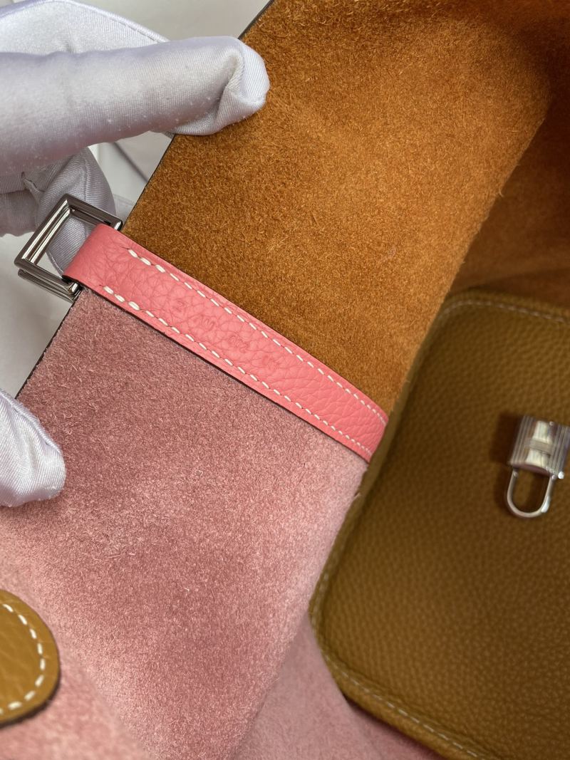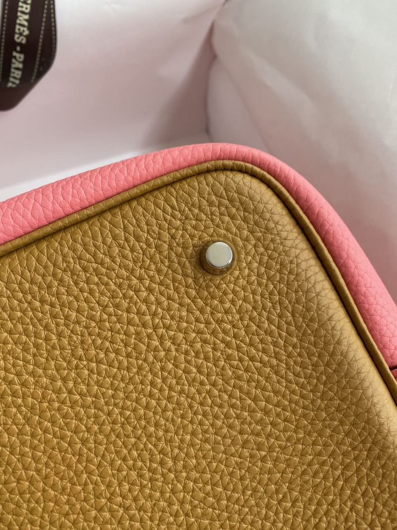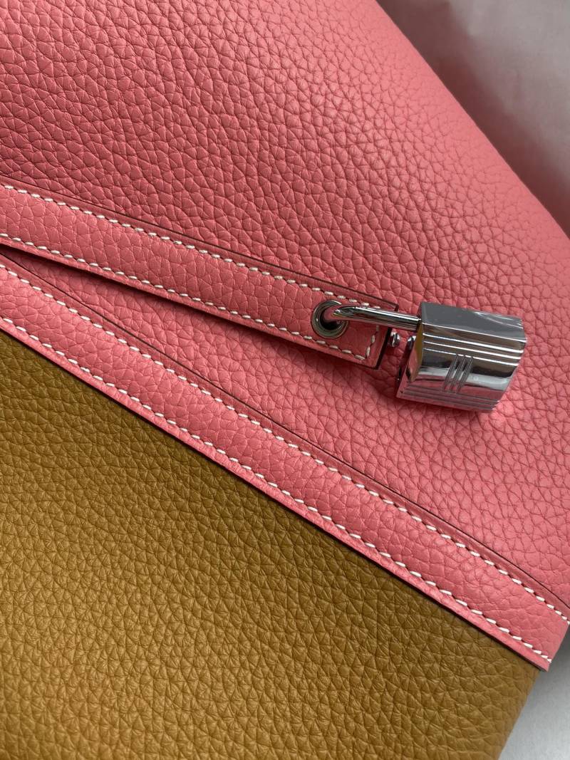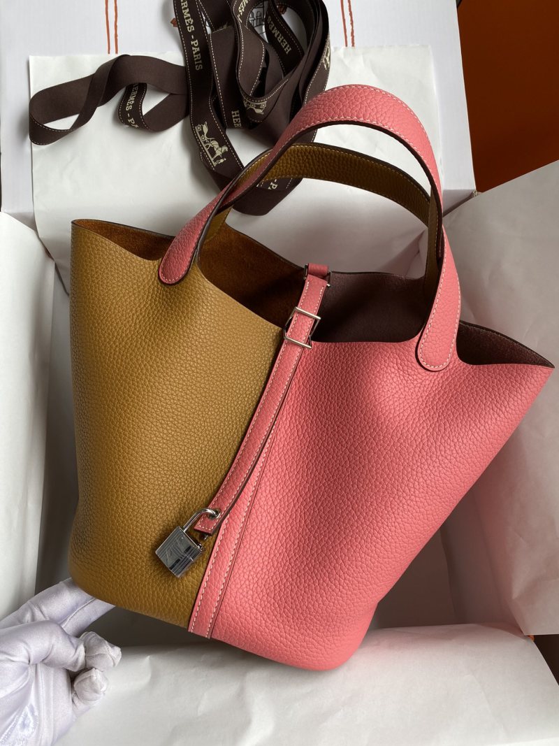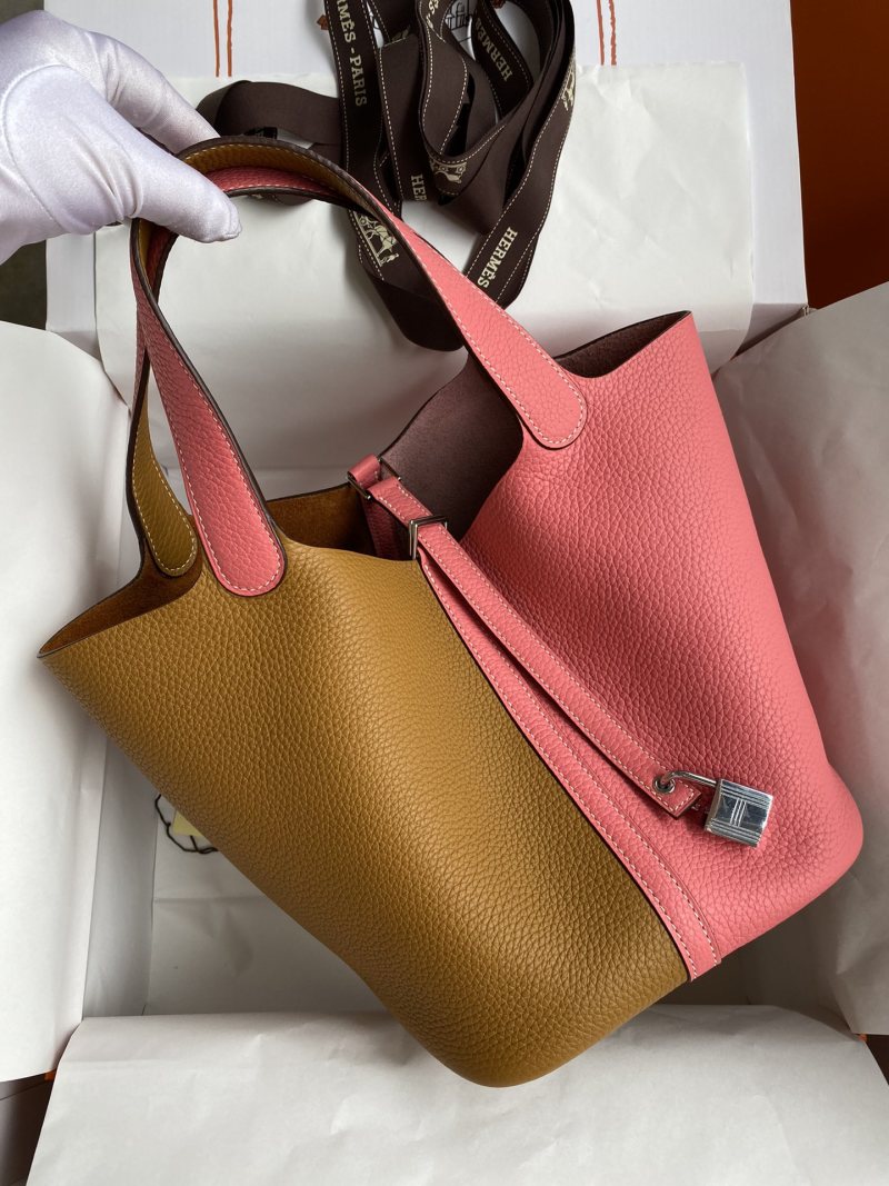 This hand-sewn Picotin Basket Bag is crafted from imported Taurillon Clemence leather in a versatile sesame and lipstick pink color scheme. The bag features a convenient 22cm size and is finished with a stylish silver clasp for a touch of elegance.