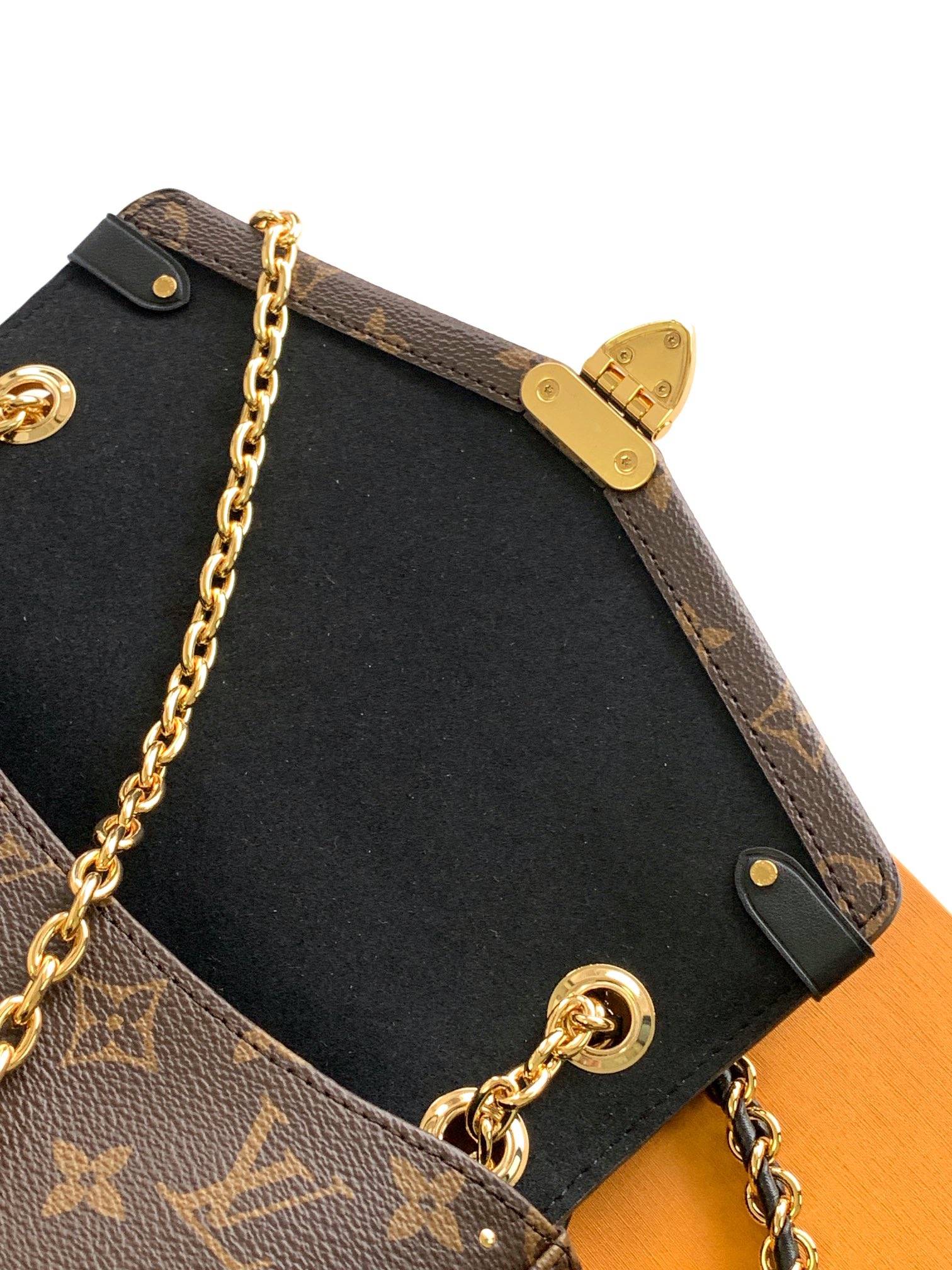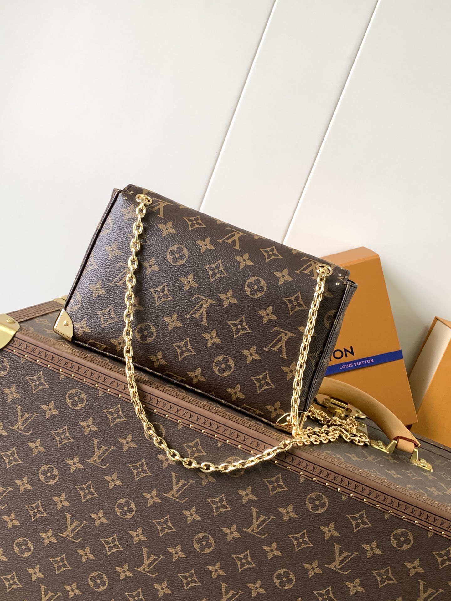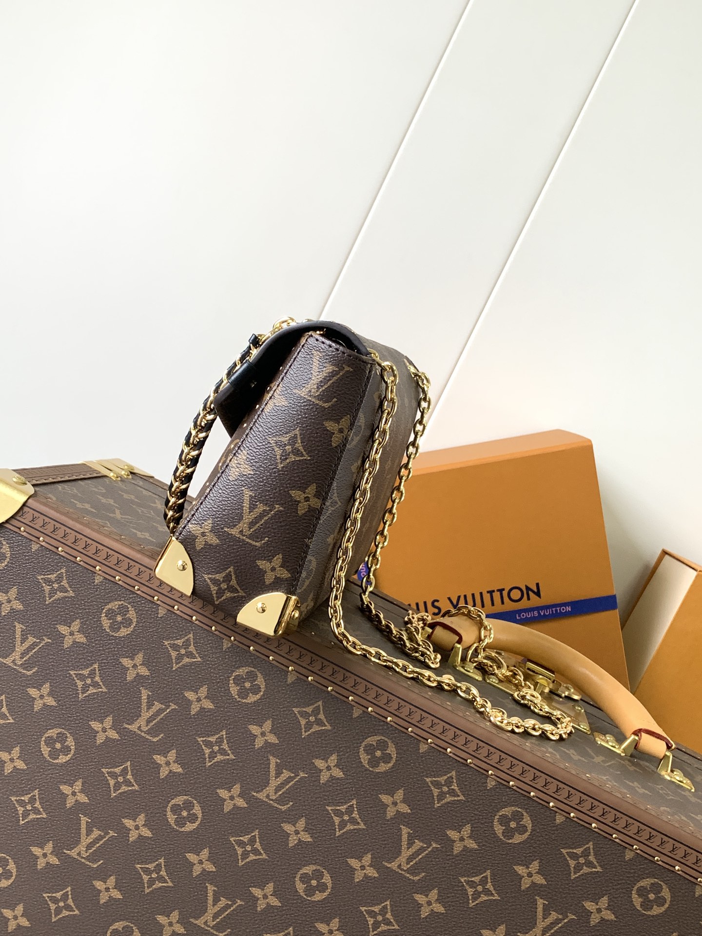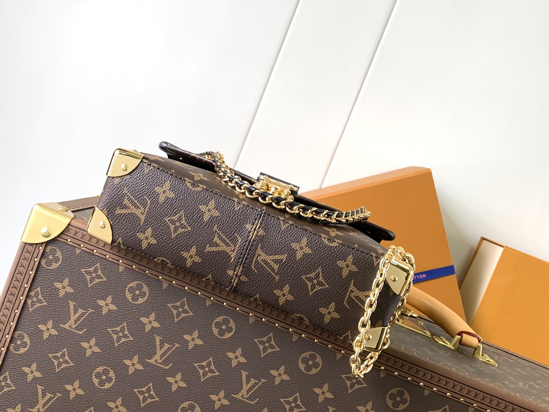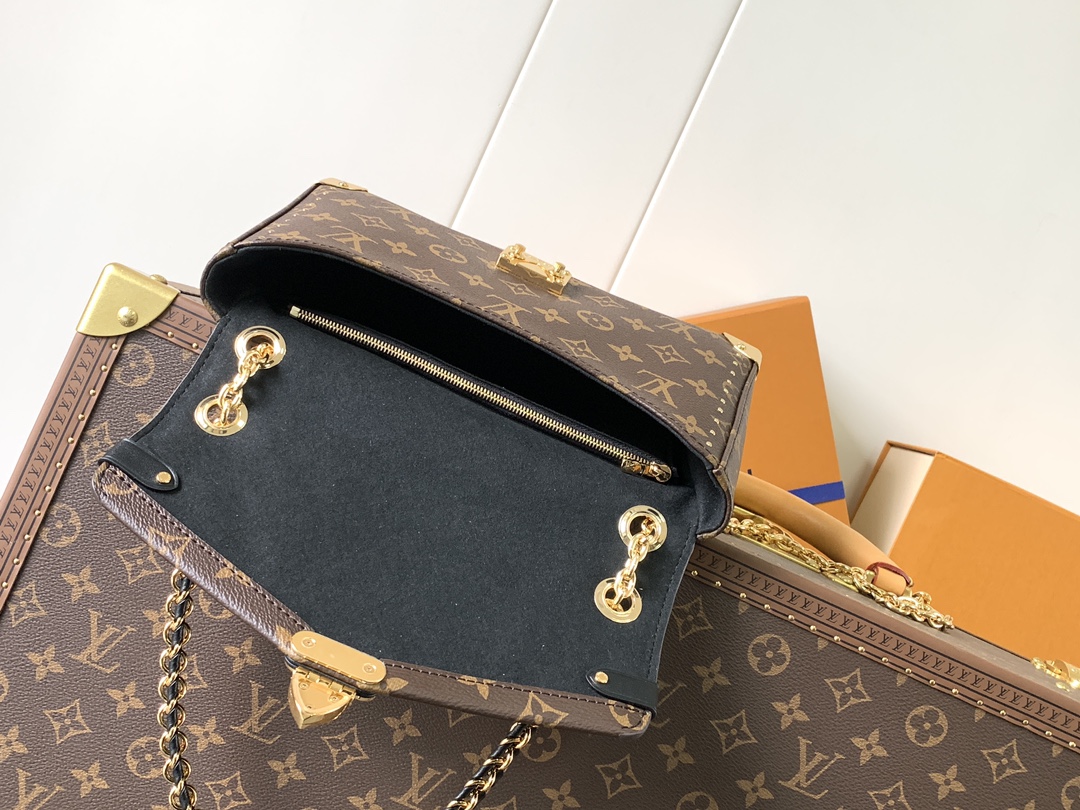 The M14526 Trunkie Bag combines Monogram canvas with metal studs, metallic corner accents, and the signature S-lock closure, evoking a vintage trunk aesthetic that celebrates the brand’s heritage. The interior features ample space and a zippered pocket for daily essentials. A sliding chain strap offers versatile carrying options. Size: 16 × 8 × 27 cm (H × W × L) Coated canvas with leather trim Fabric lining Metal hardware Flap closure with S-lock Interior zip pocket Fits a 6.7-inch smartp