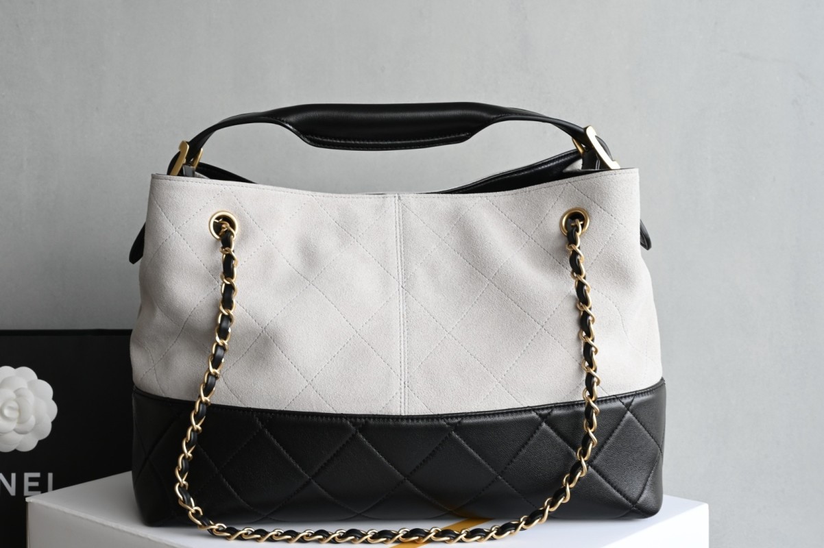 This fashionable hobo bag from Chanel features a beautiful grey suede exterior, making it a versatile and stylish accessory for any outfit. Its spacious design and iconic Chanel logo detailing make it the perfect choice for fashion-forward individuals looking to add a touch of luxury to their wardrobe.