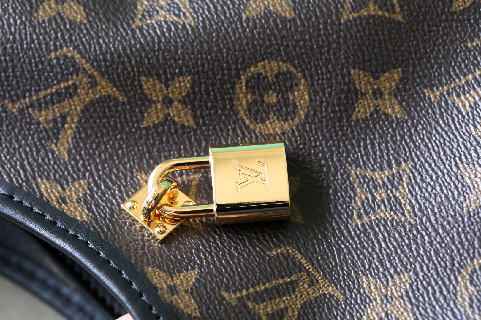 The M12940 The Drop Small Bag draws inspiration from the 2018 Flower Hobo Bag. Crafted from classic Monogram canvas with black leather accents, it combines trendy style with practical functionality in an elegant silhouette. Signature padlock detailing and deep leather trims highlight refined craftsmanship. The compact design comfortably holds daily essentials, perfectly suited for urban life. Size: 15 × 12 × 28 cm (H × W × L)