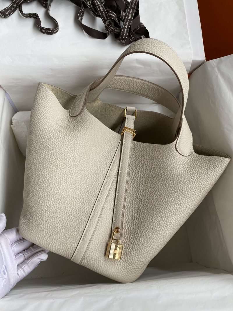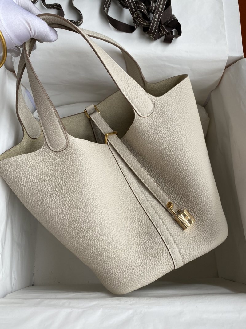 This elegant hand-stitched Picotin basket bag features a 22cm size, made from imported Taurillon Clemence leather in a creamy milk white shade with a stunning gold buckle closure. Perfect for adding a touch of luxury to any outfit, this versatile and timeless bag is a must-have accessory for any fashion-forward individual.