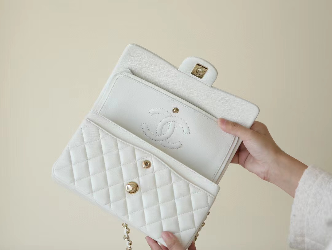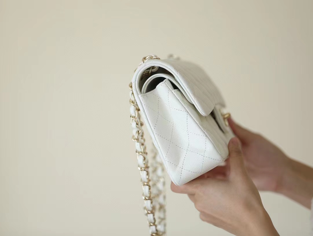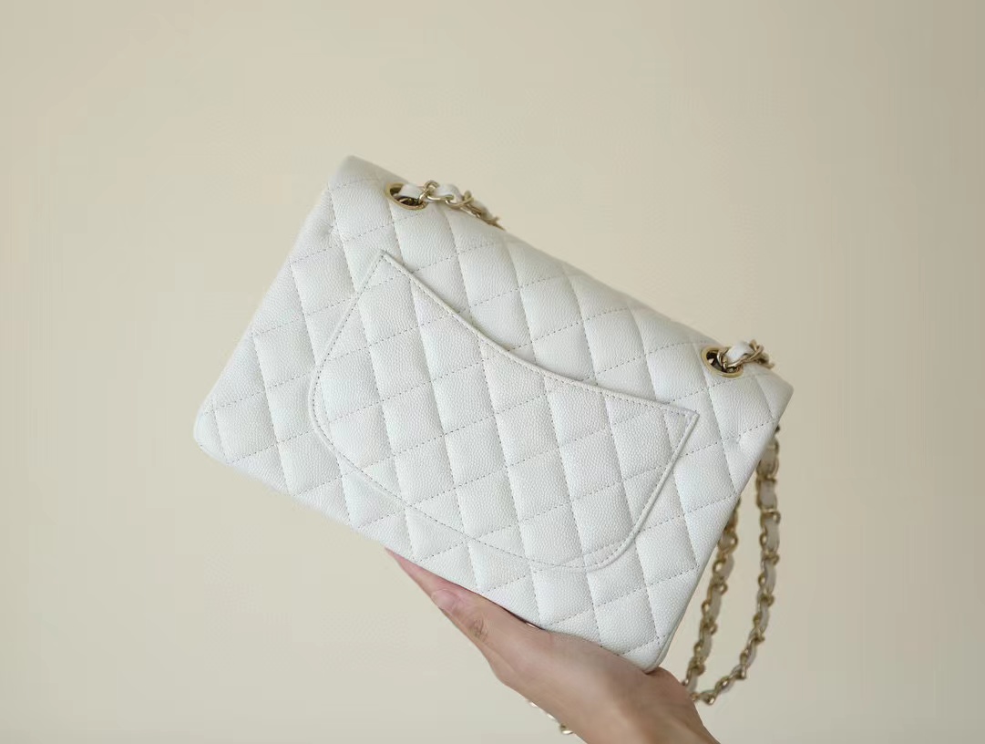 Perfect for dates, work, or parties, the Chanel CF “Snow White” bag is a go-to classic that never fails. Its cute yet fashionable white design exudes charm and elegance. Paired with authentic Hass mini studs, it’s both stylish and versatile. Crafted in premium Hass leather with thick gold-plated hardware, this 23 cm bag is a must-have for any occasion. Material: Hass leather Hardware: Thick gold-plated Size: 23 cm