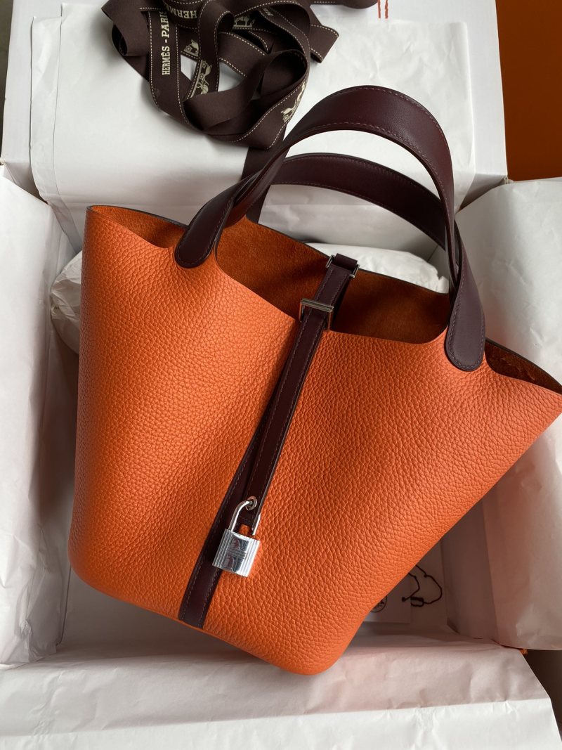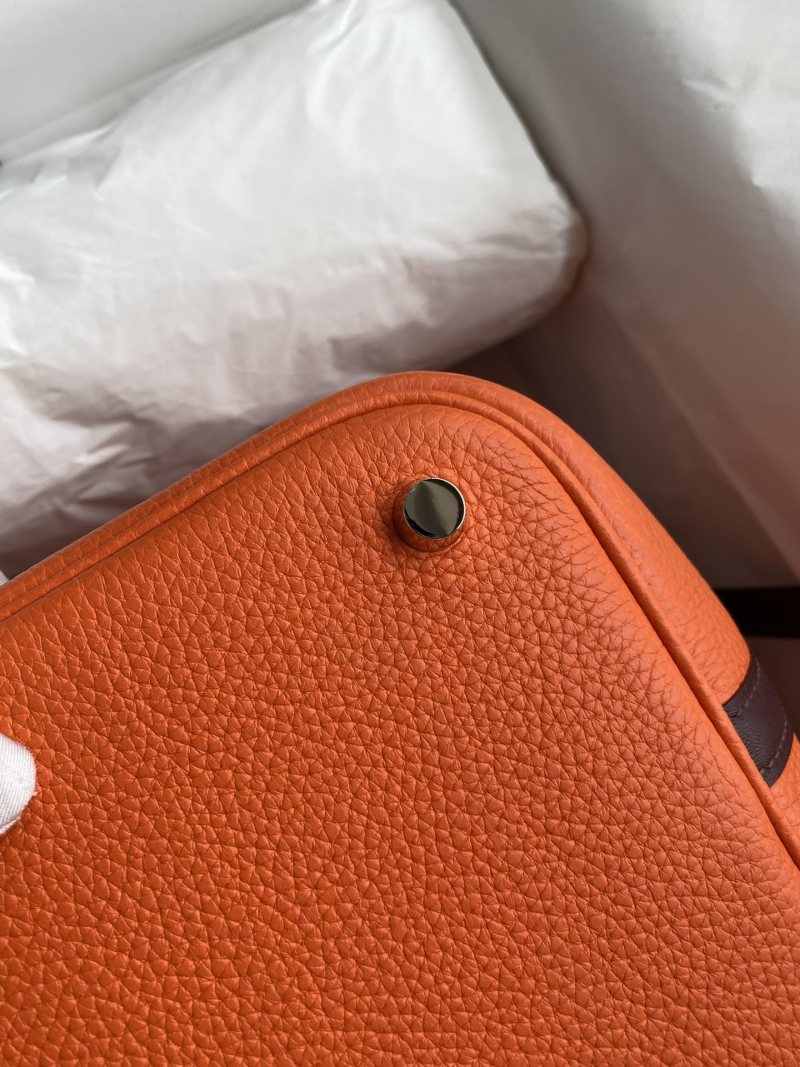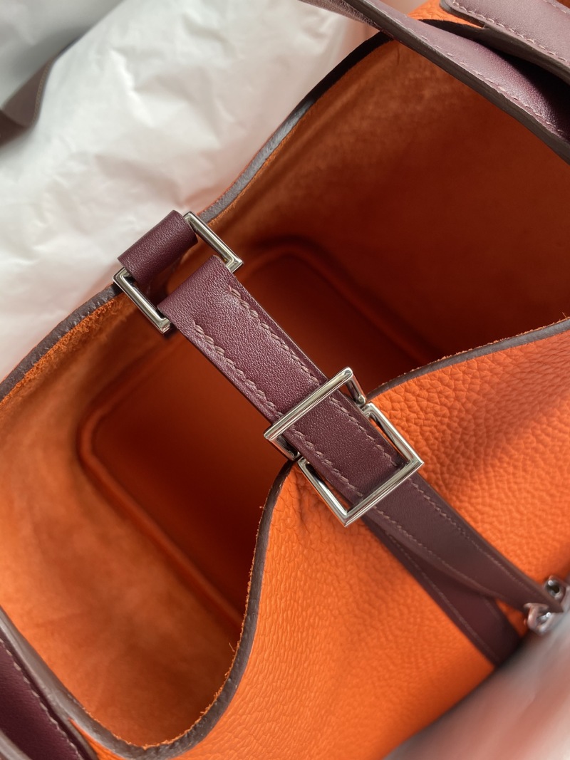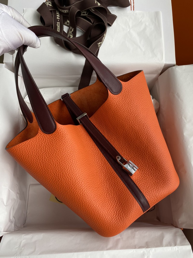 Hand-stitched Picotin 22cm Basket Bag in Imported Taurillon Clemence Leather with Swift Flame Orange/Burgundy Color and Silver Clasp