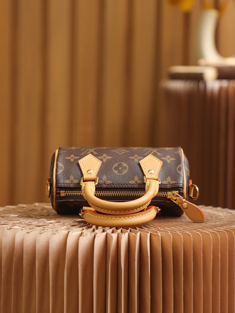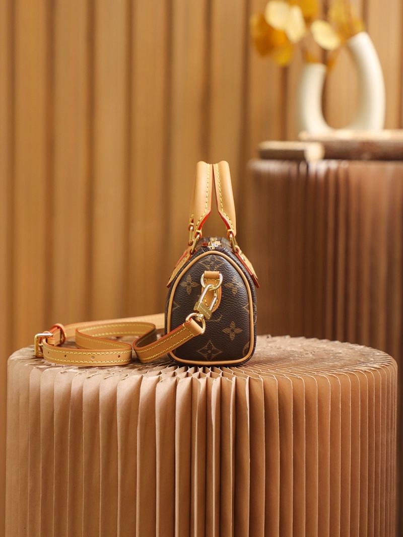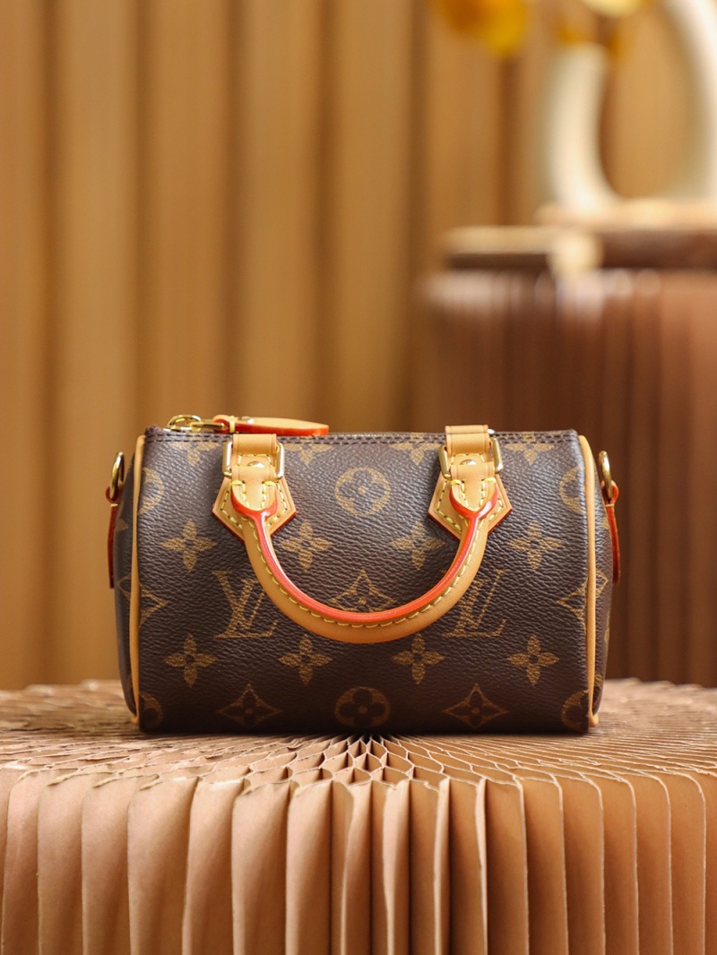 The Nano Speedy Mini #M81085# is a duty-free version of the authentic grade SP, measuring at 16*10*7.5cm. The Speedy series embodies the essence of classic design in a Mini size, complete with a detachable shoulder strap for versatile styling options. The adjustable shoulder strap design caters to varying height needs, making it a versatile and stylish choice for any occasion. Compared to the older Nano series, the new design of the Nano Speedy Mini is more user-friendly, making it a must-have a