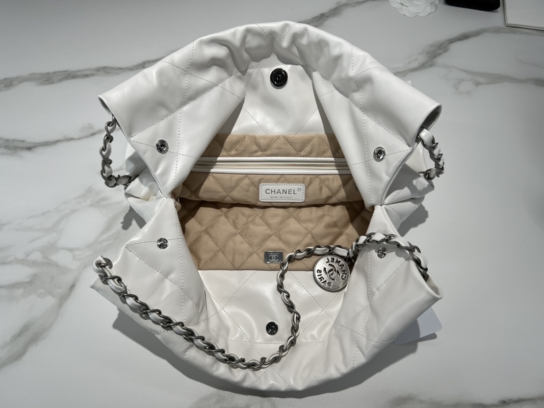 The 22P handbag and 22bag trash bag may seem like polar opposites, but they both have unique qualities worth exploring. The 22P handbag is made of imported Italian Montbello leather, known for its fine texture and glossy finish. With a simple yet sophisticated appearance, it features a hollowed Chanel logo charm that adds a touch of luxury. On the other hand, the 22bag trash bag exudes a laid-back, lazy charm with its loose silhouette and vintage vibes. Despite their differences, both items offe