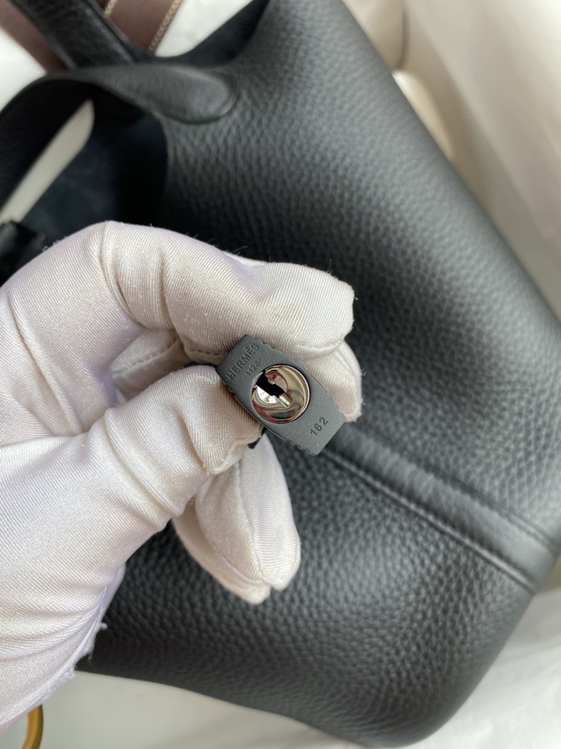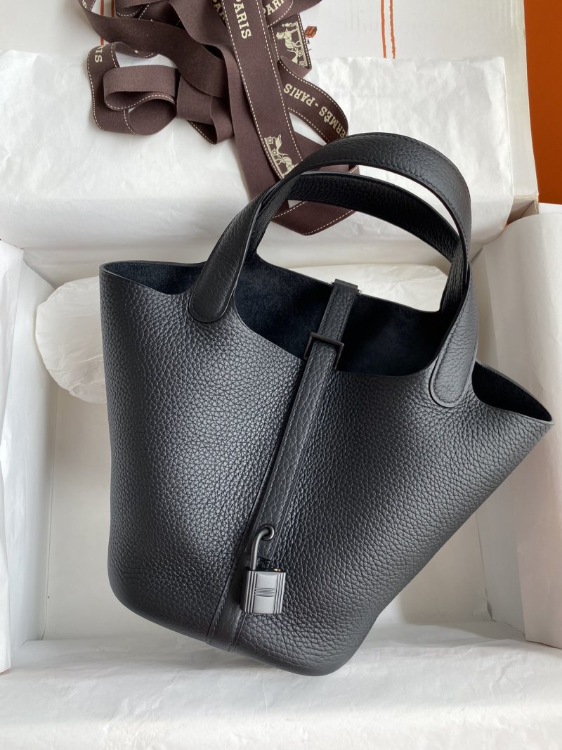 This handcrafted Picotin handbag is made from imported Taurillon Clemence leather in a stylish matte black finish, with a sophisticated black buckle closure. The compact 18cm size makes it perfect for carrying essentials in style.
