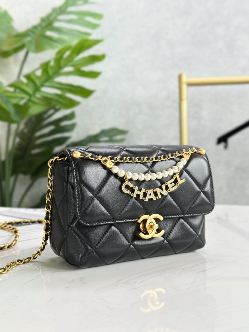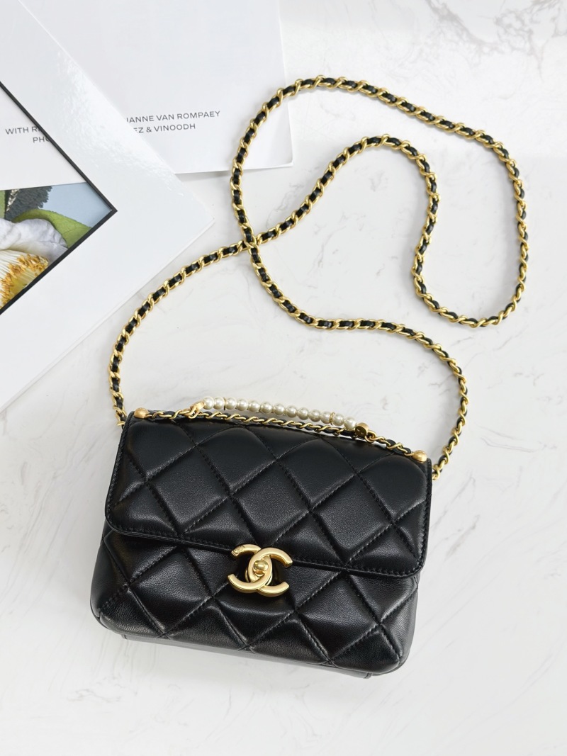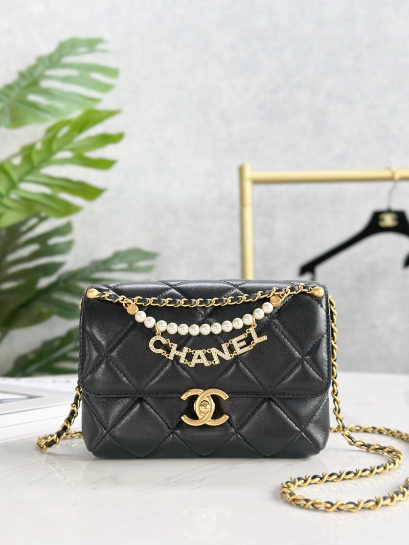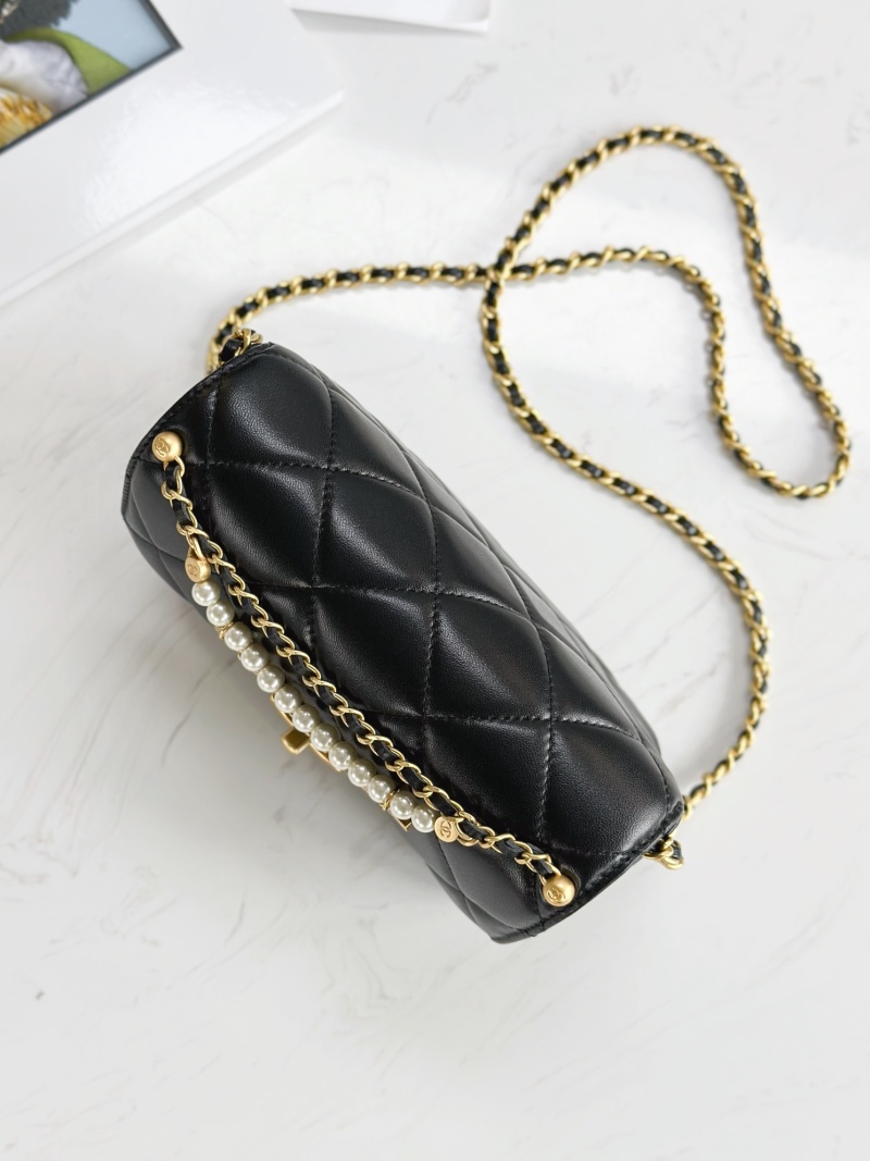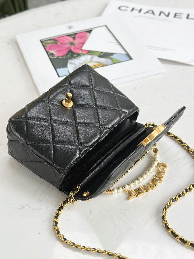 Mini Chanel 24A Pearl Chain Flap Bag with Leather Chain, Pearls, and Chanel Letter Pendant
