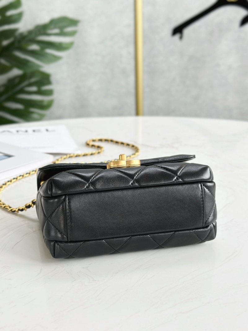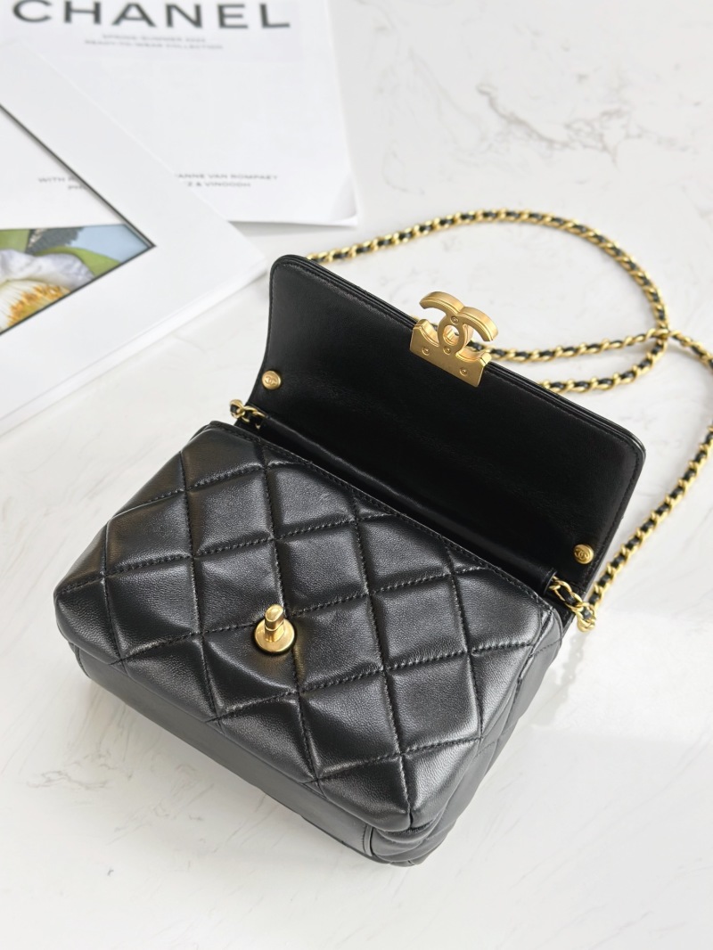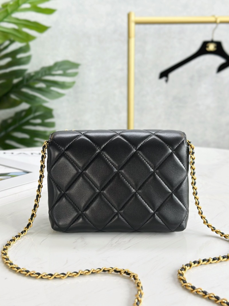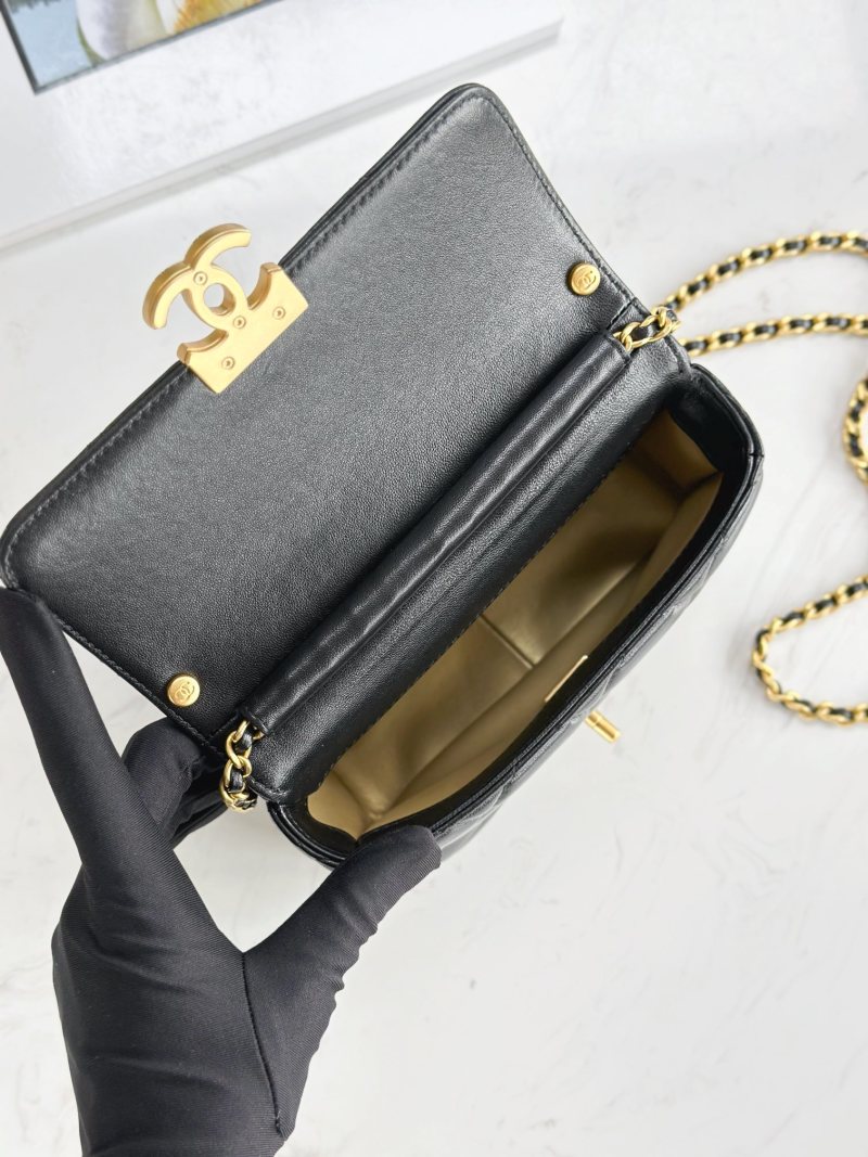 This mini Chanel bag features a delicate combination of elements including leather chain, pearls, and a Chanel letter pendant. The chain and letter studded with crystals give the bag a dynamic yet youthful and fashionable feel. The popular pearl element paired with the diamond logo creates a dazzling look. Made with sheepskin and vintage gold hardware, the bag features a square flap closure with two small gold beads at each end of the chain. The perfect size to fit daily essentials, including a